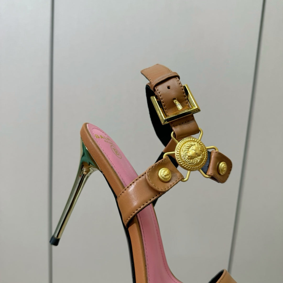 BALMAIN 25S HEELED EVA SANDALS 95MM IN BROWN AND PINK CALFSKIN