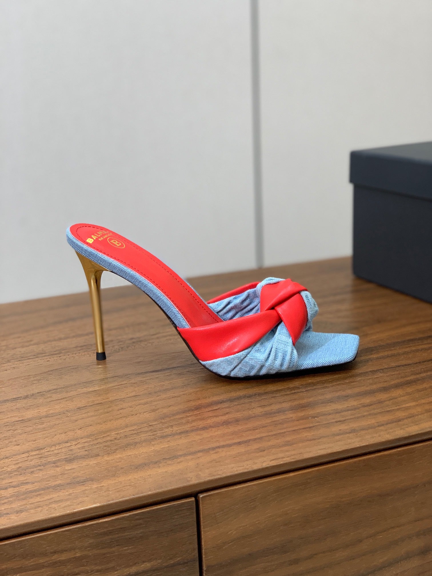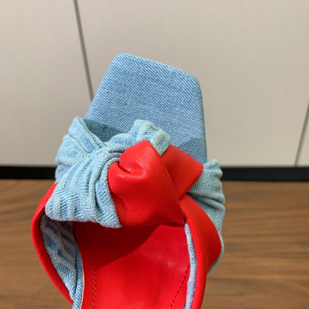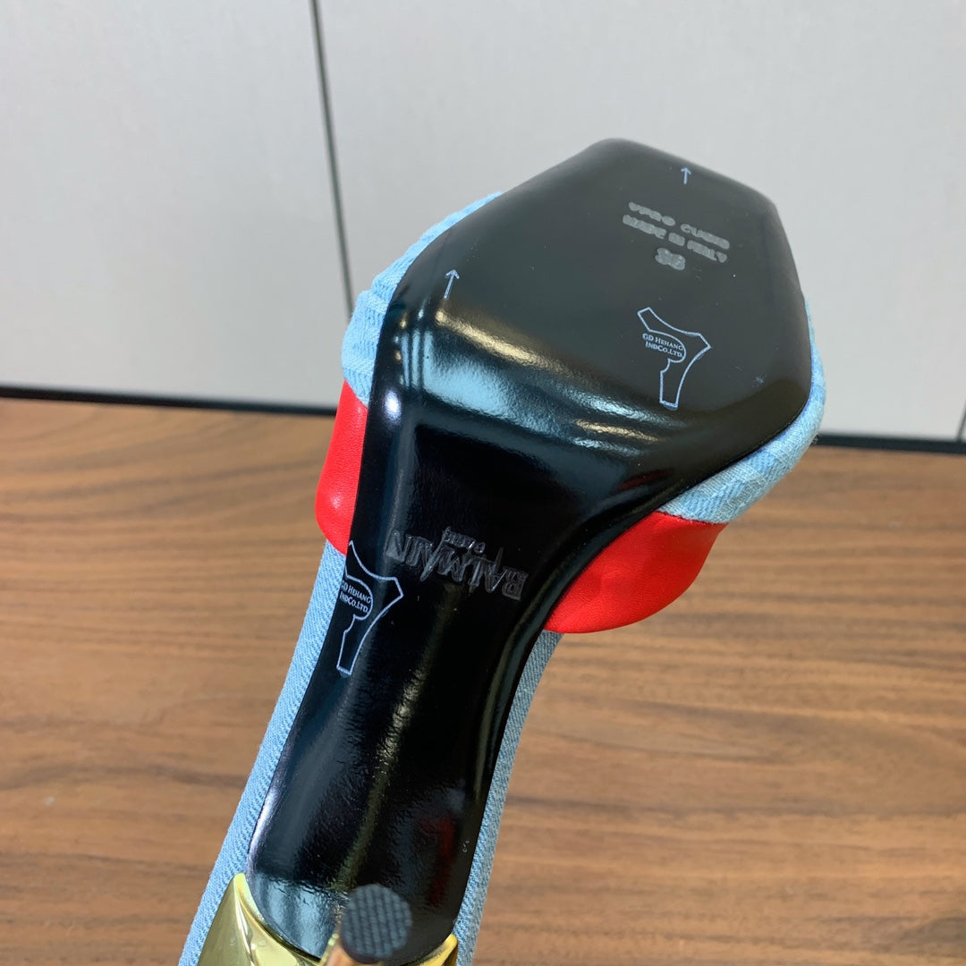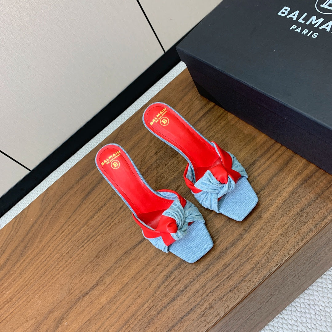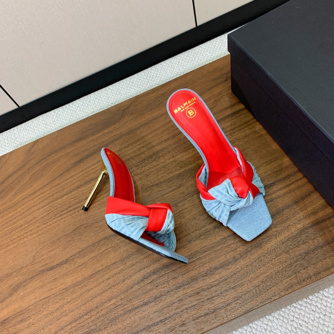 BALMAIN 25S HIGH HEEL MULES 95MM IN BRIGHT RED DENIM AND CALFSKIN