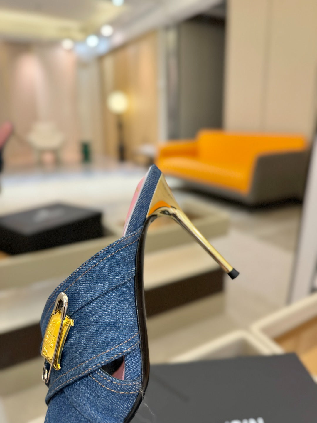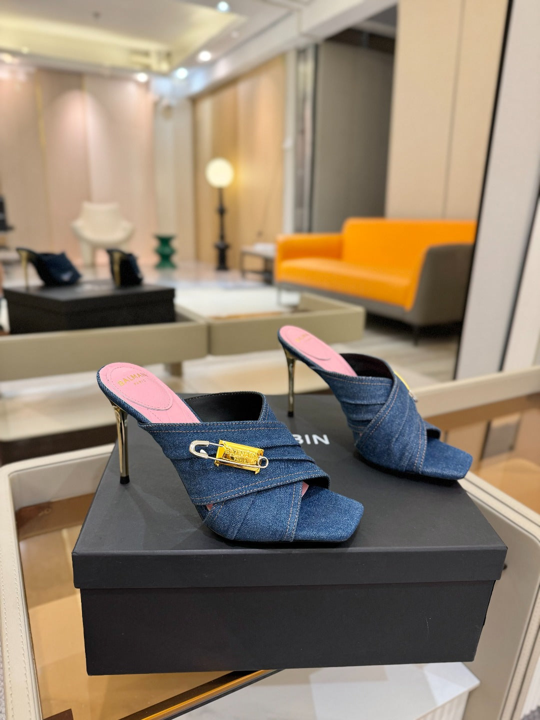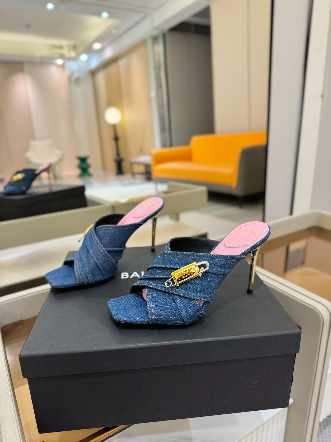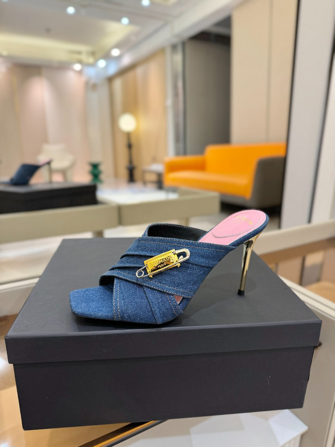 BALMAIN 25S HIGH HEEL SANDALS 95MM IN BLUE DENIM