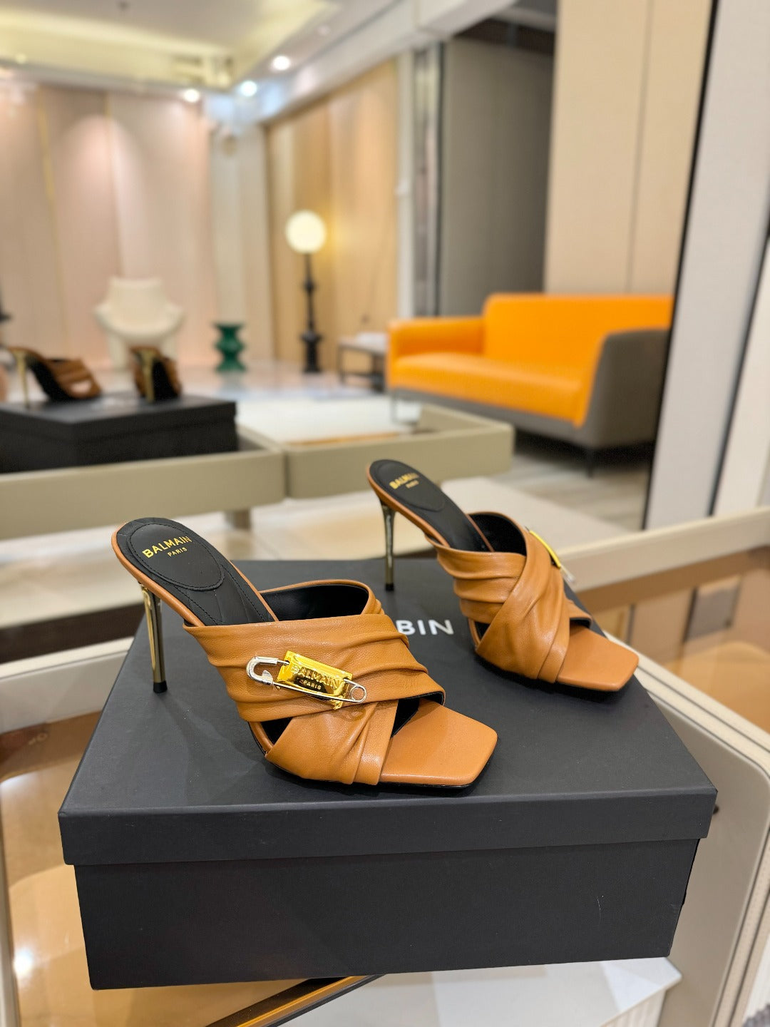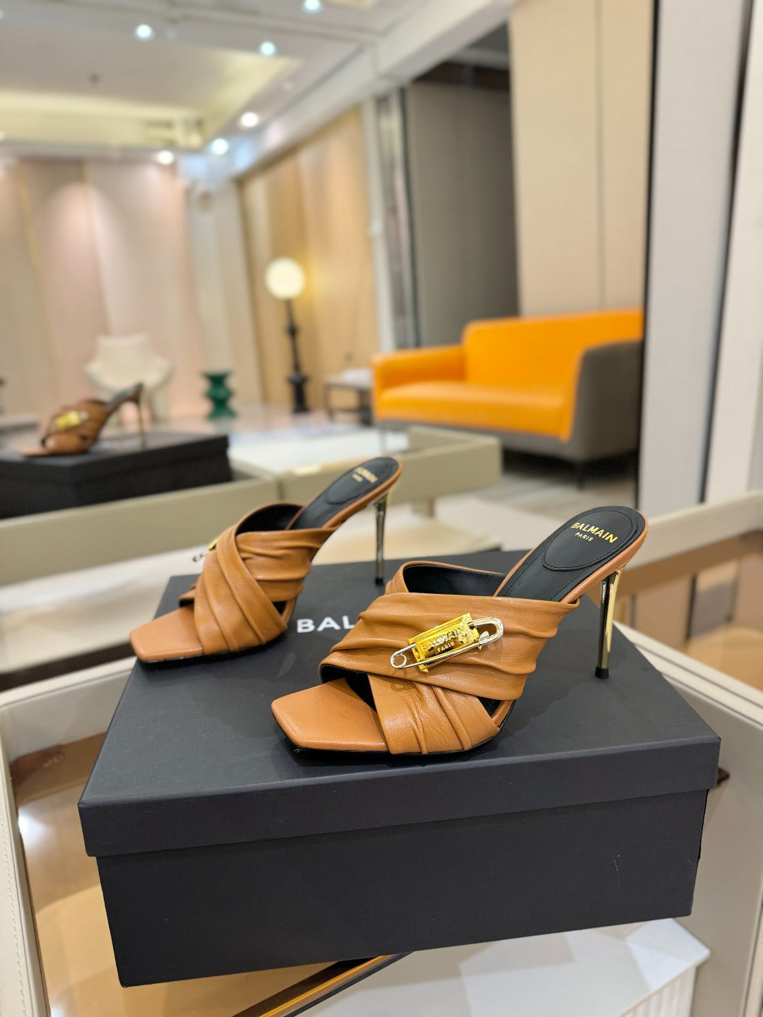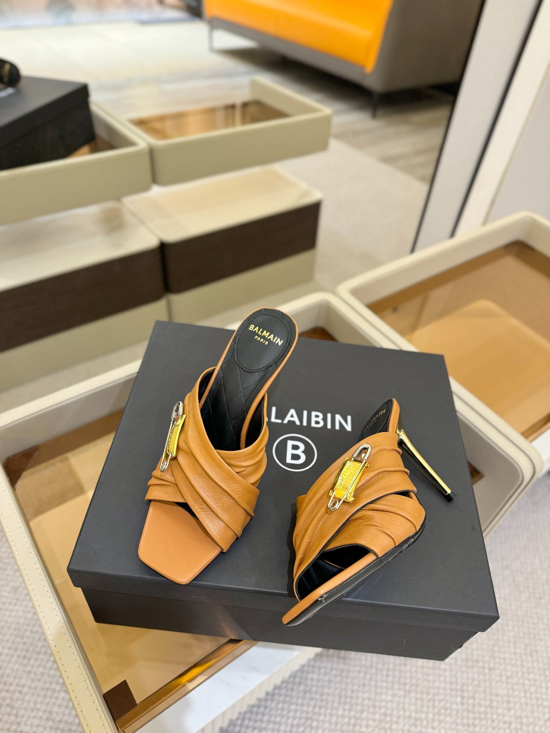 BALMAIN 25S HIGH HEEL SANDALS 95MM IN BROWN CALFSKIN