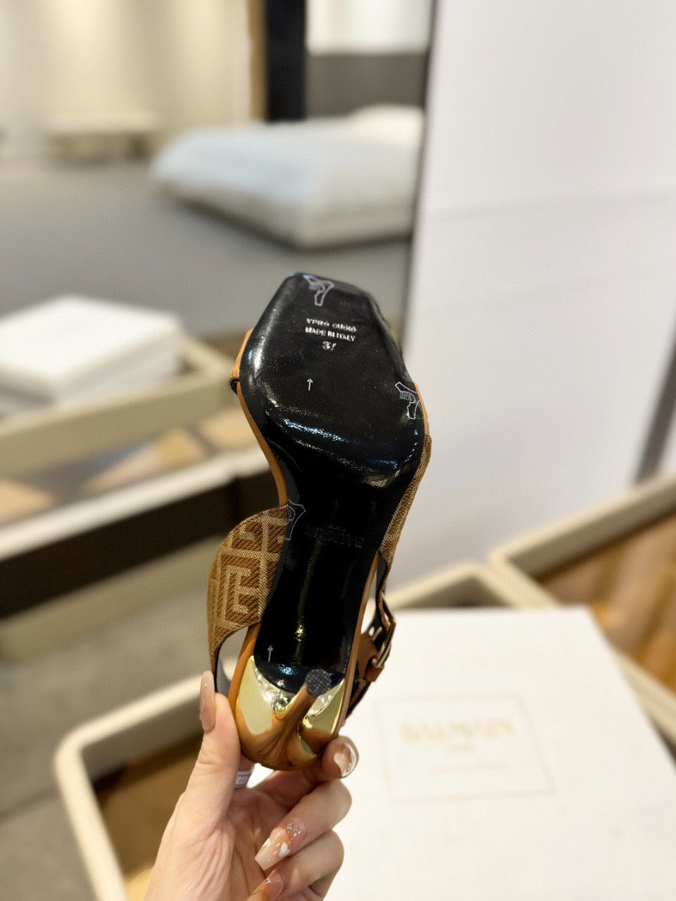 RUBY SANDALS IN BROWN CALFSKIN AND PB LABYRINTH CANVAS