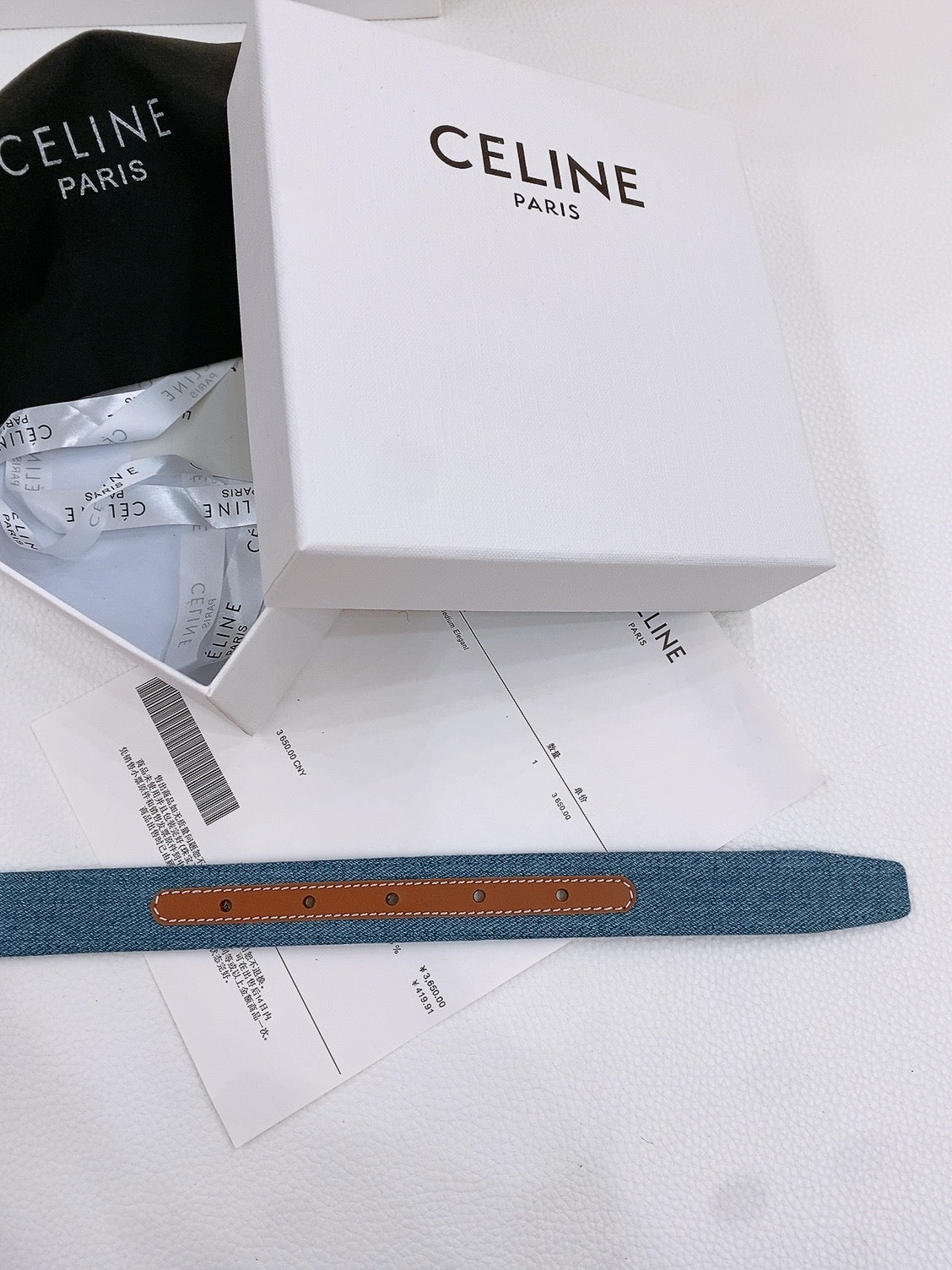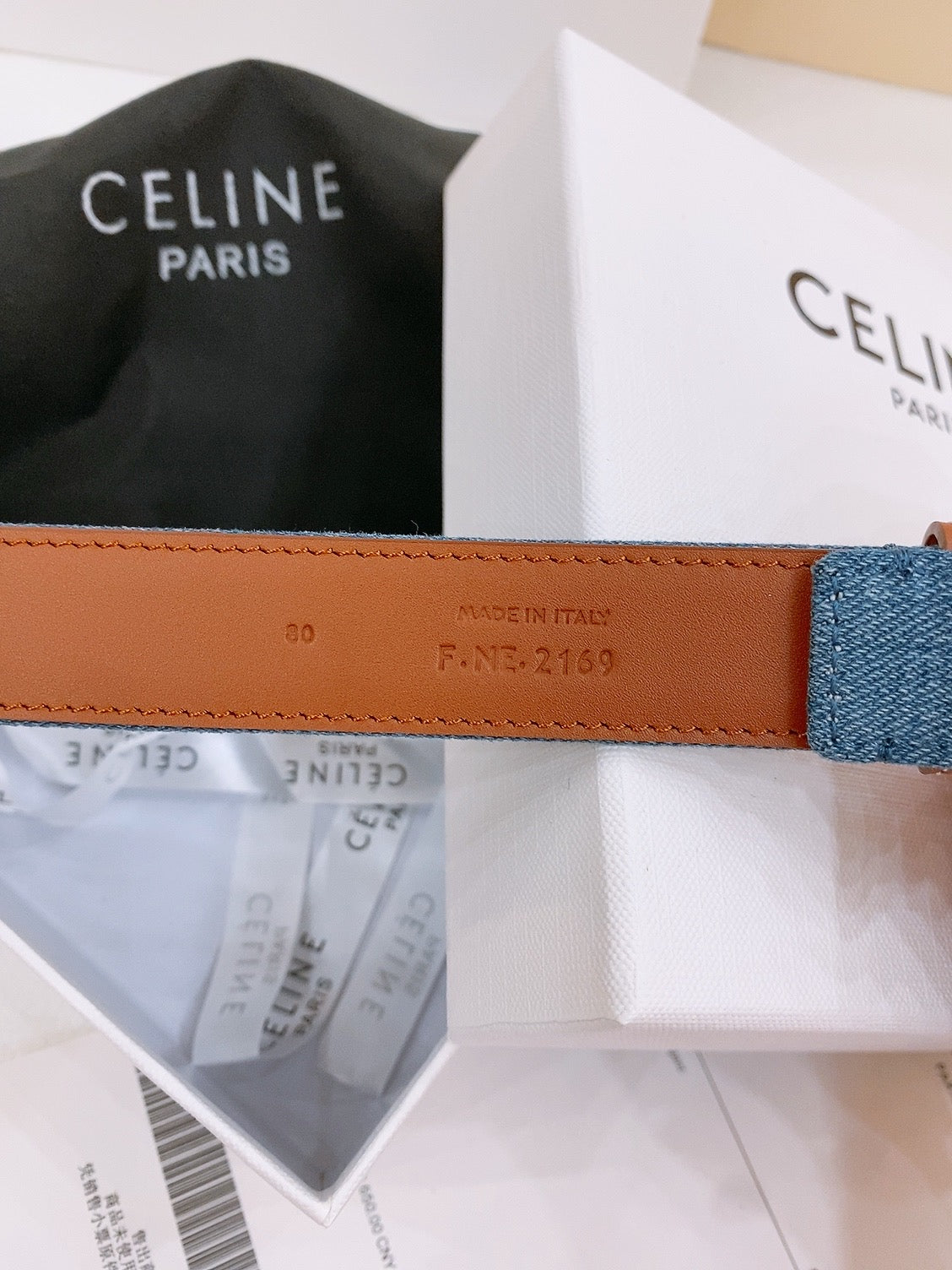 CELINE 25S BELT TRIOMPHE TAURILLON 25MM IN BROWN CALFSKIN AND DENIM 558351