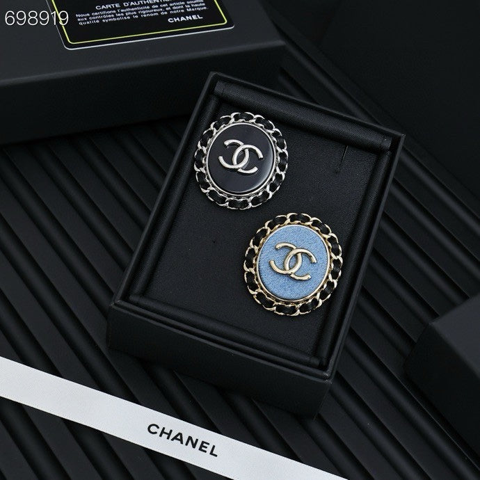 25P BROOCH IN BLUE DENIM BLACK LEATHER-THREADED OVAL