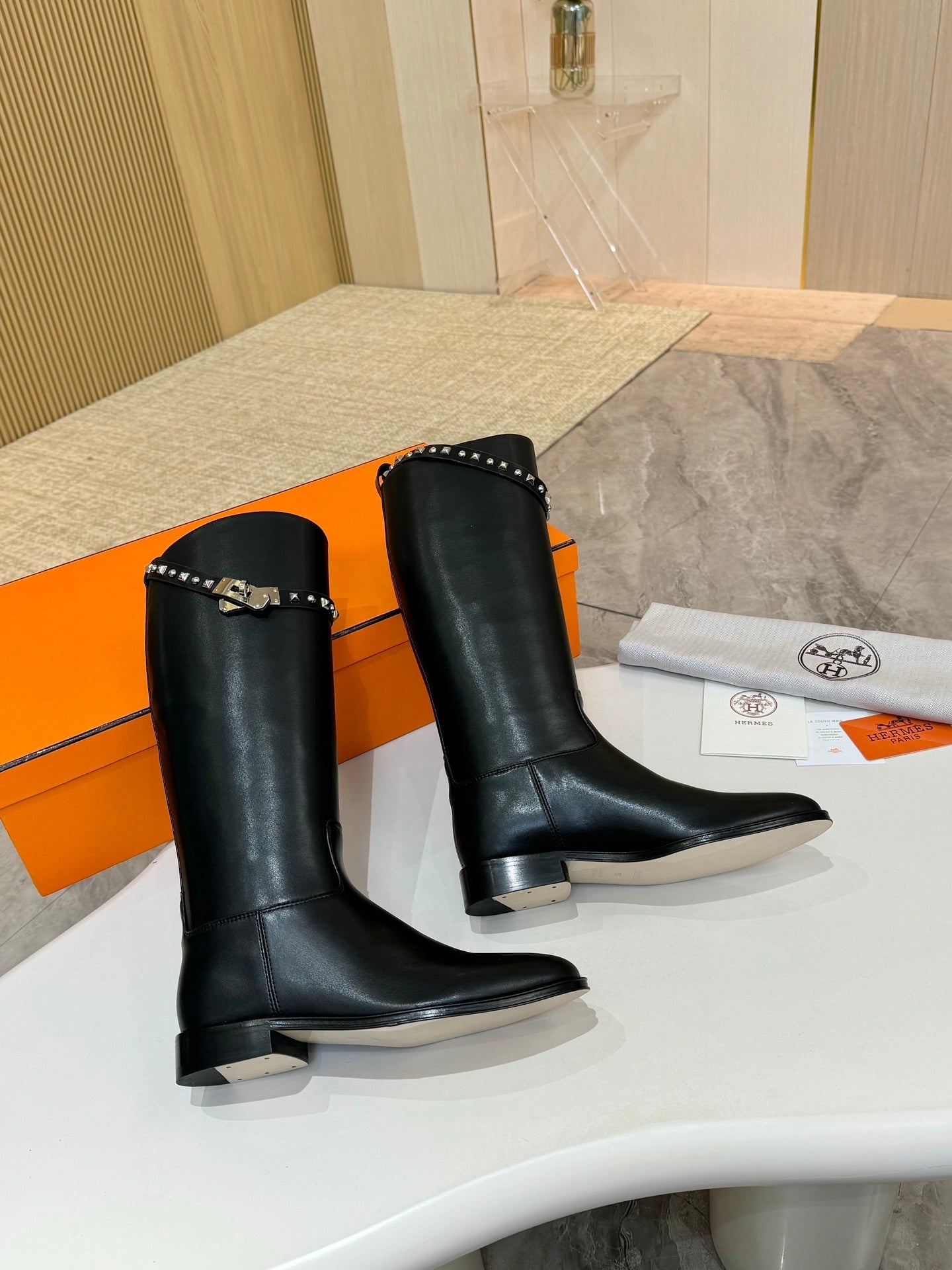 HM 25S KNEE-HIGH FLAT BOOTS IN BLACK LAMBSKIN WITH SILVER HARDWARE