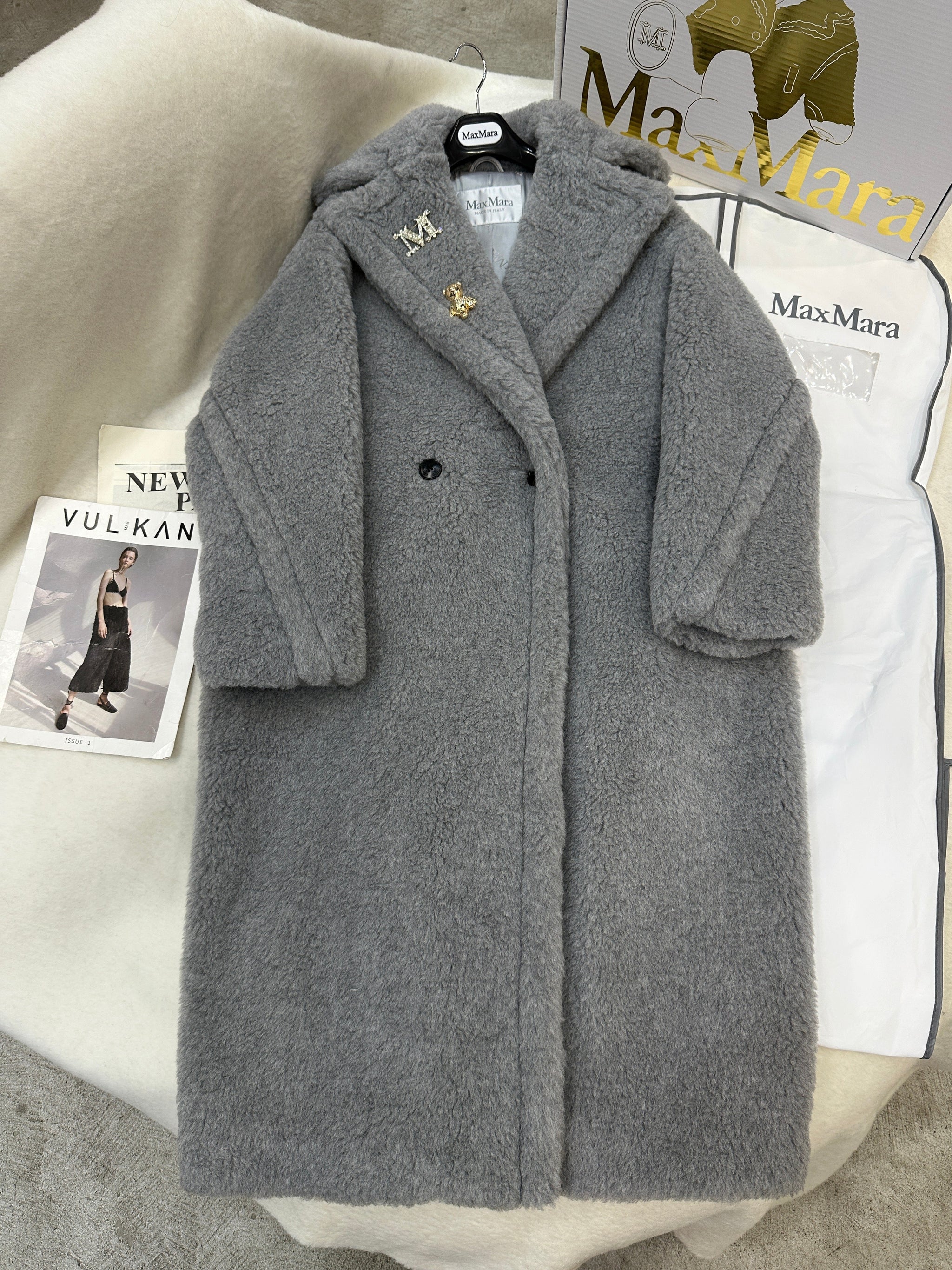 MAX MARA LONG COAT IN LIGHT GREY WOOL WITH CRYSTAL CHARM