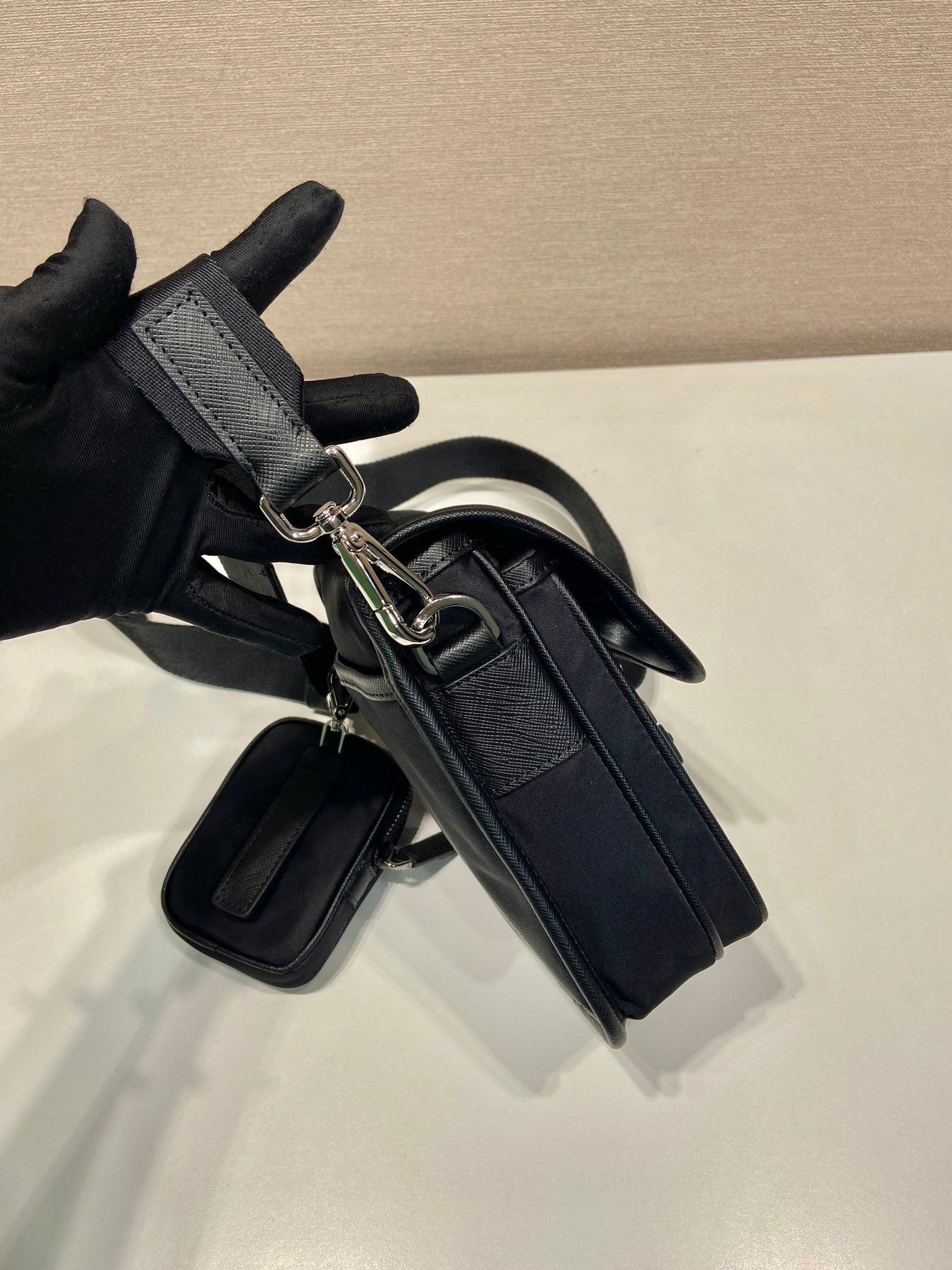 • Material: Re-nylon and saffiano leather trim