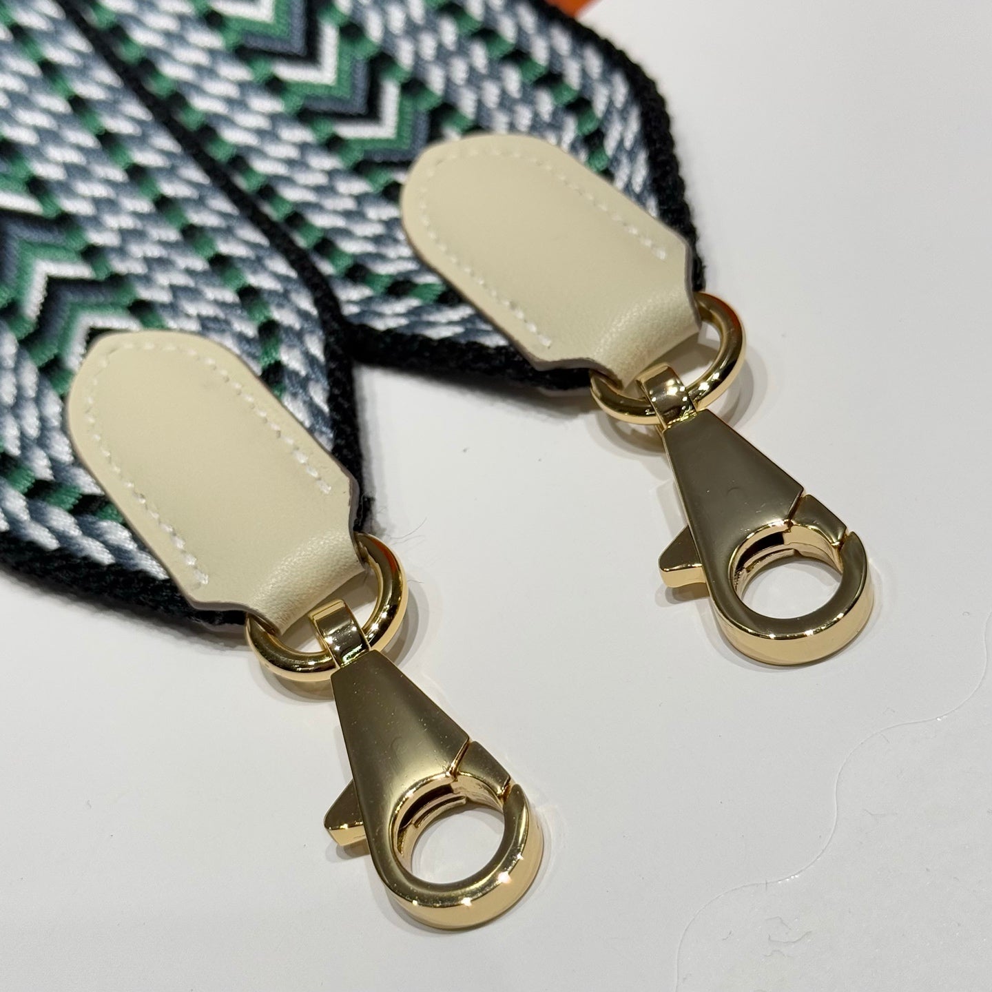 25S HERMES BAG STRAP BLACK AND GREEN PATTERN 85 IN CANVAS GOLD HARDWARE