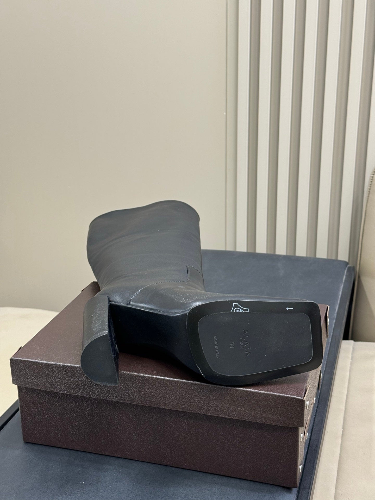 ALAIA 25S KNEE-HIGH SQUARE-TOE BOOTS IN BLACK CALFSKIN