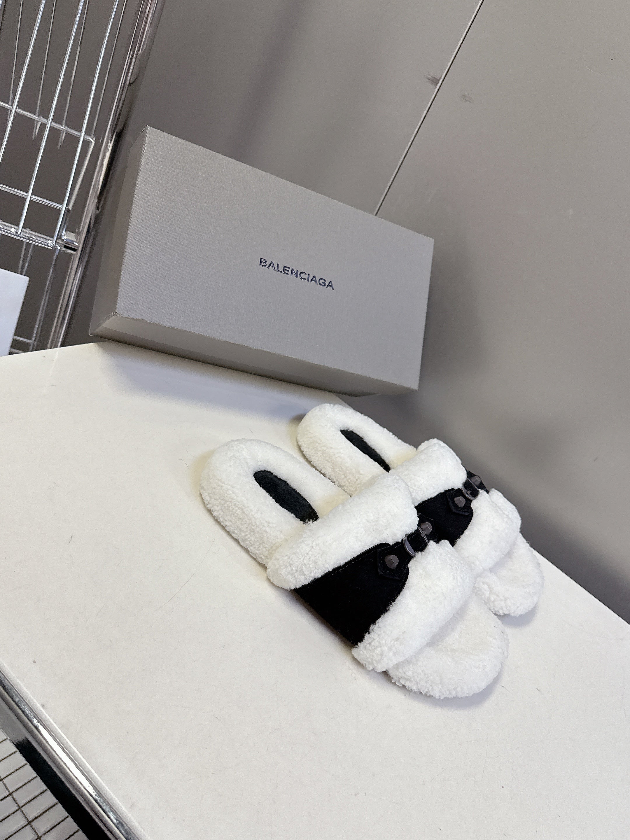 BALENCIAGA 25S SLIPPERS IN BLACK SUEDE AND WHITE WOOL