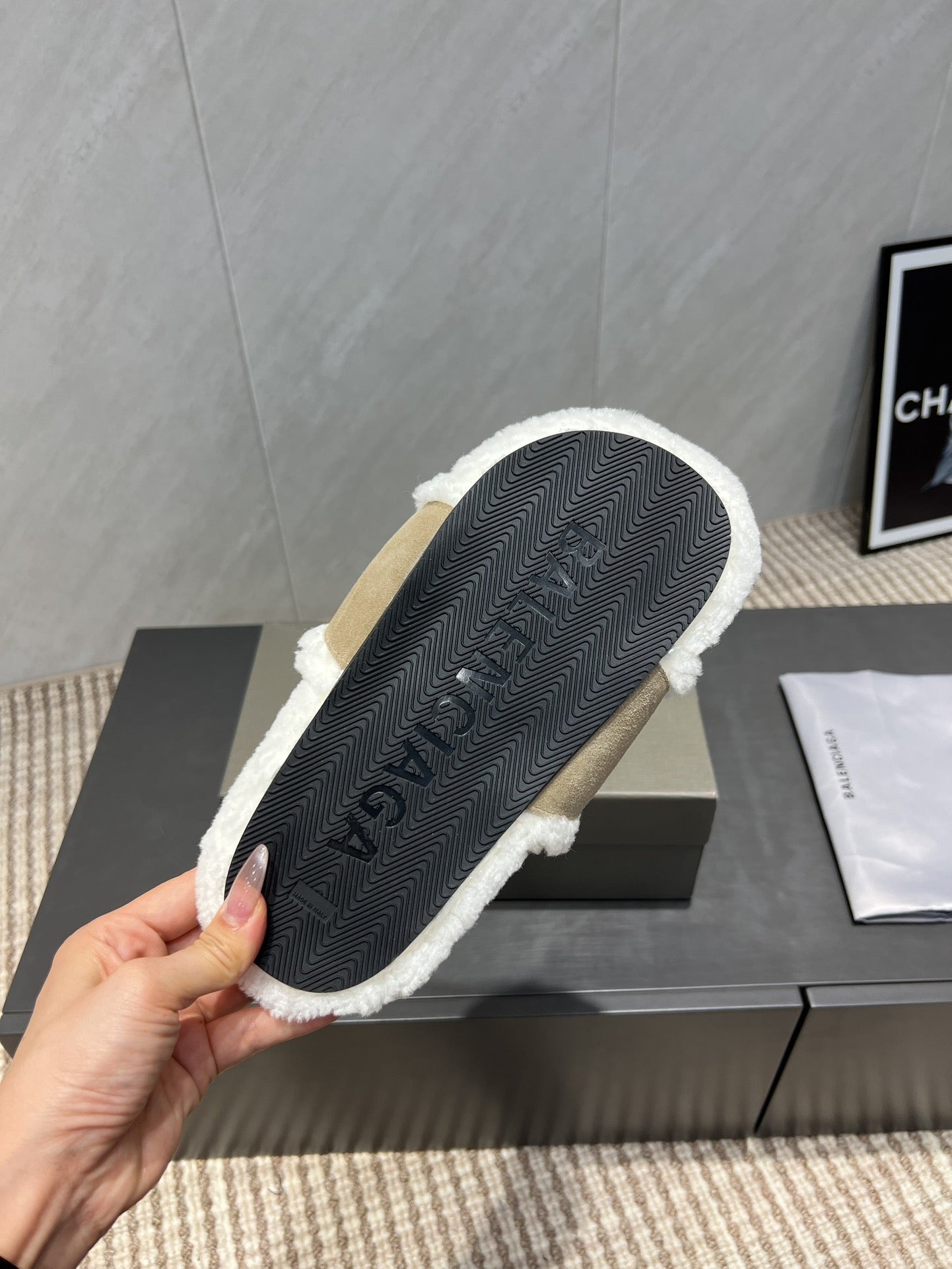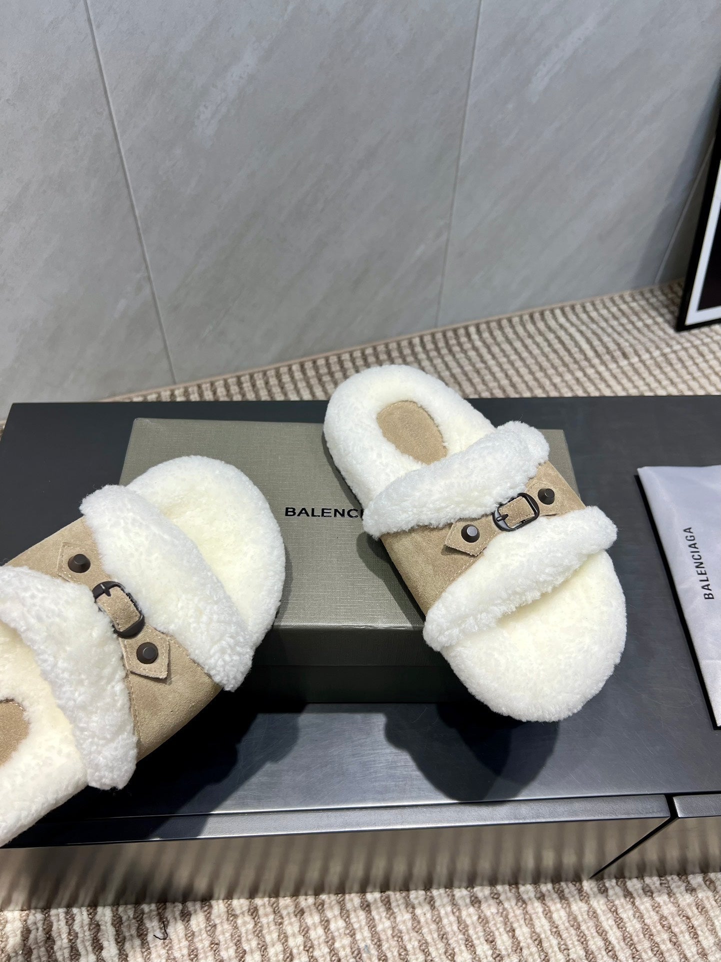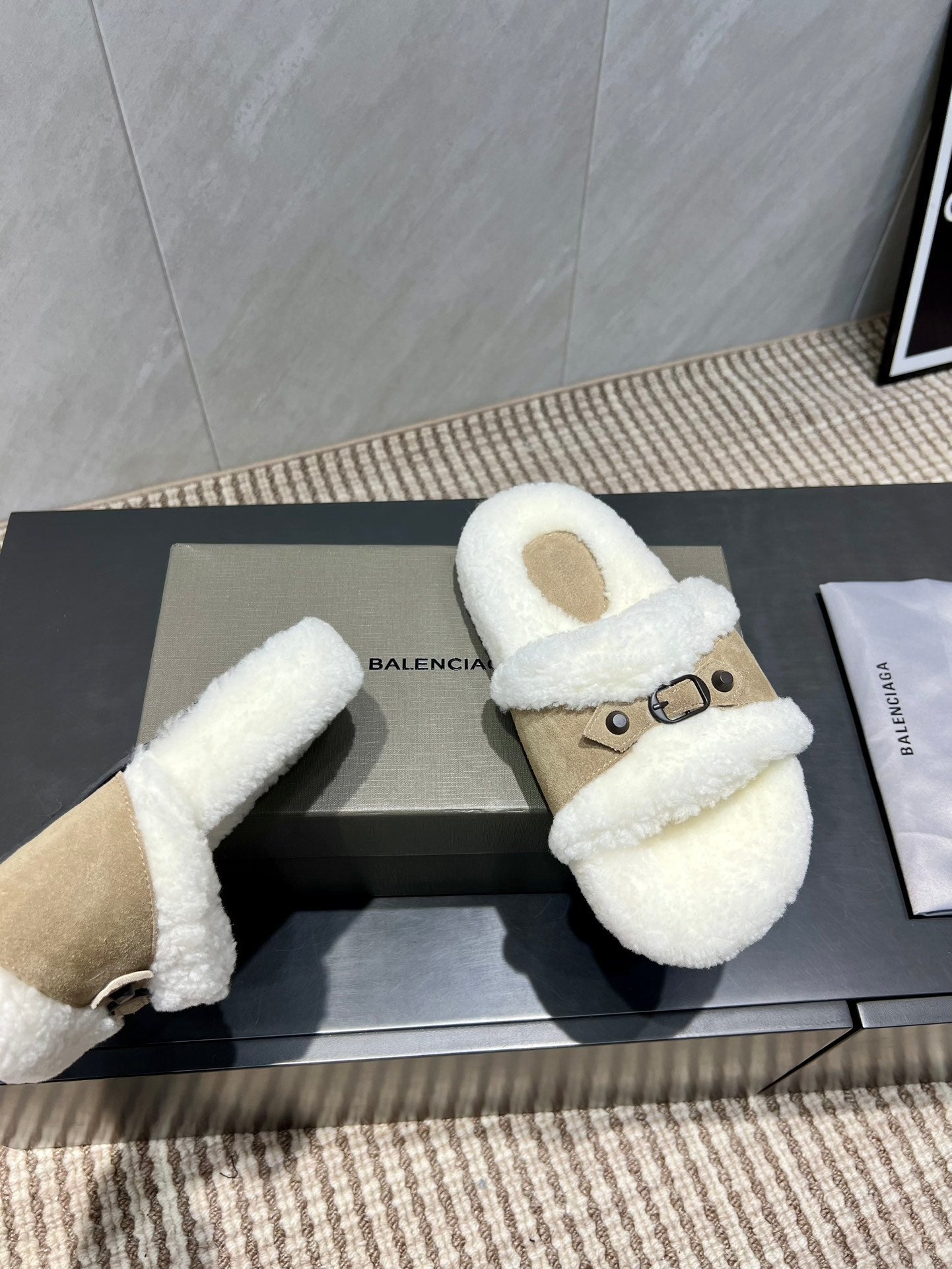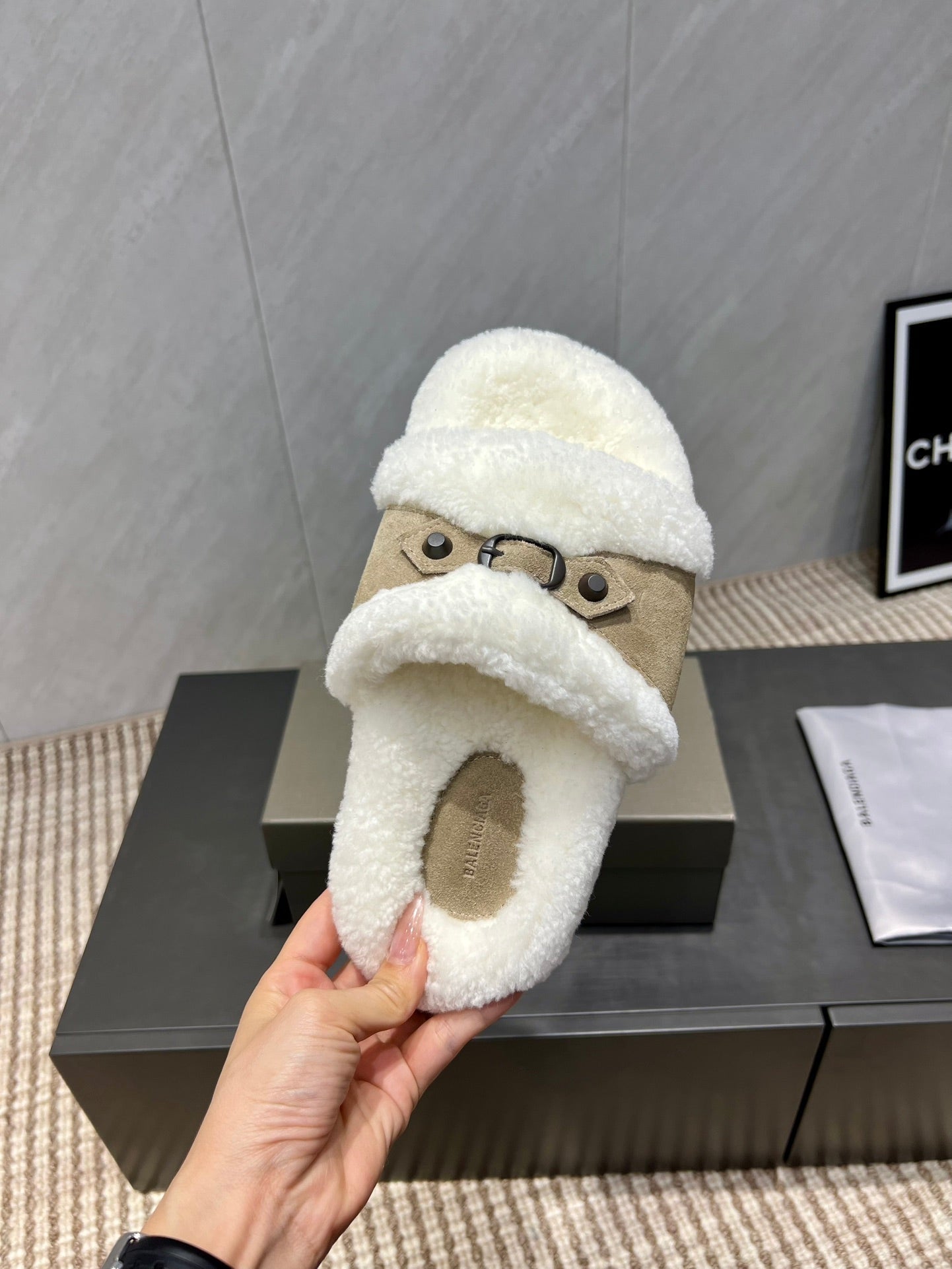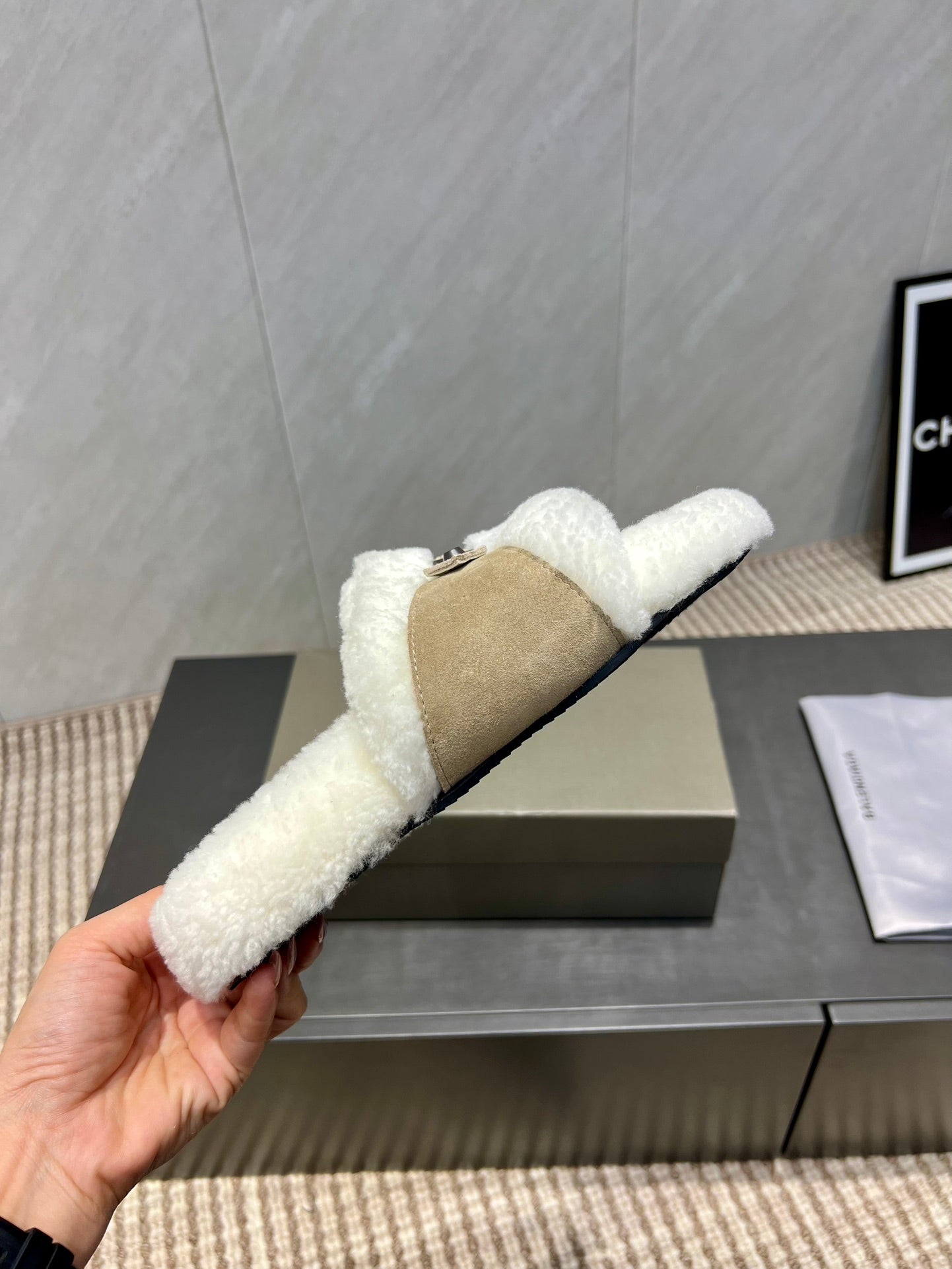 BALENCIAGA 25S SLIPPERS IN DARK BEIGE SUEDE AND WHITE WOOL
