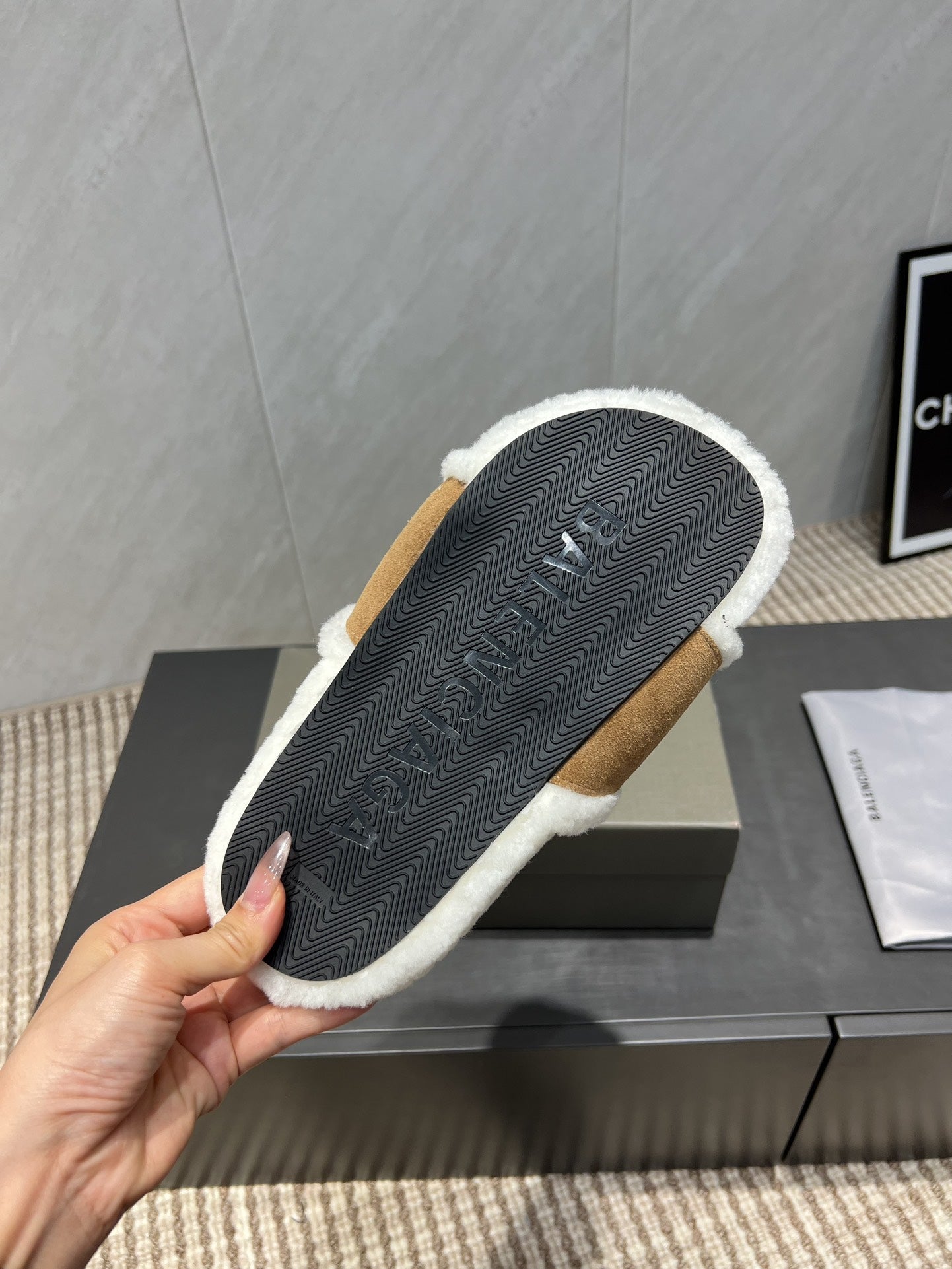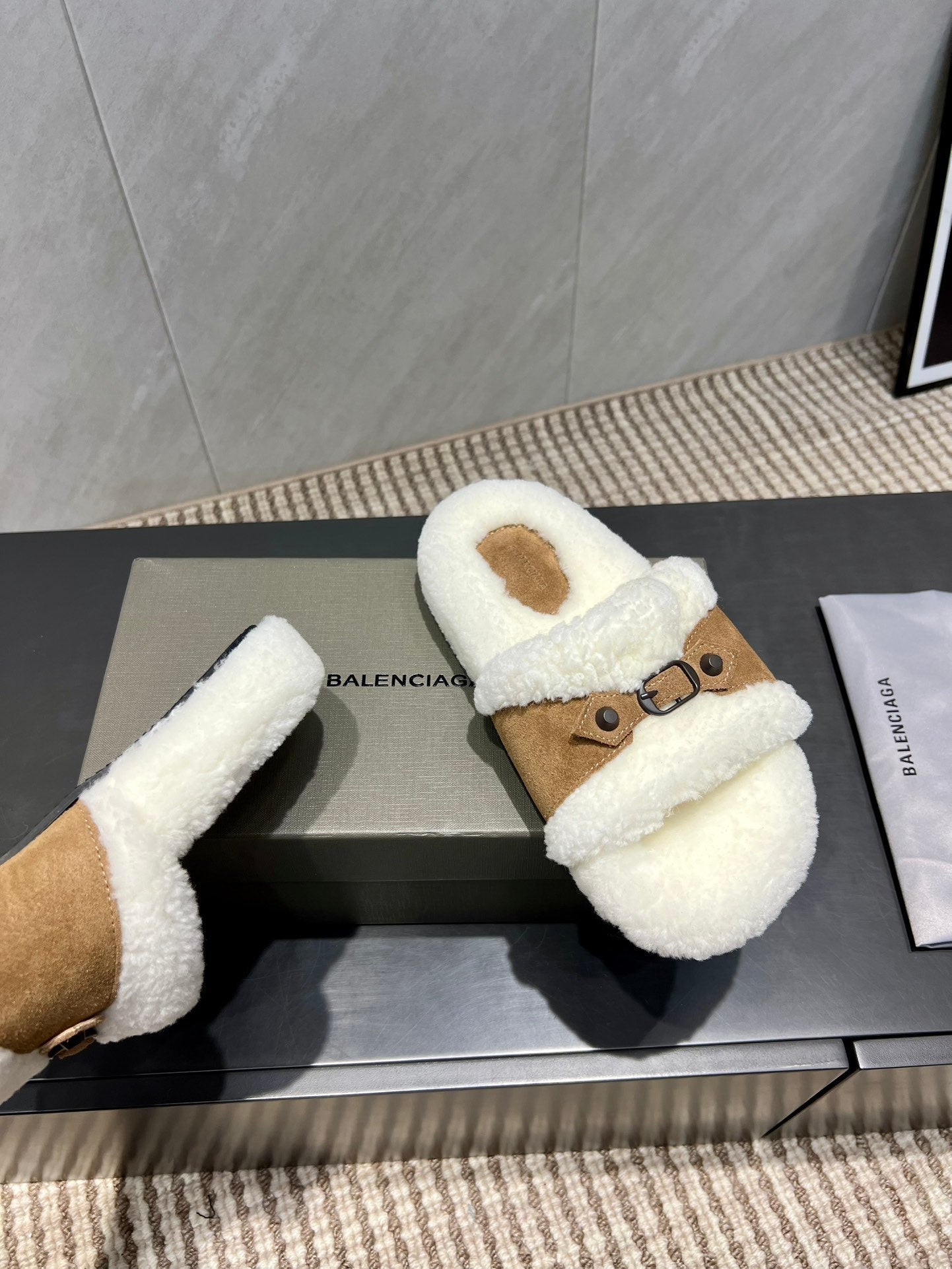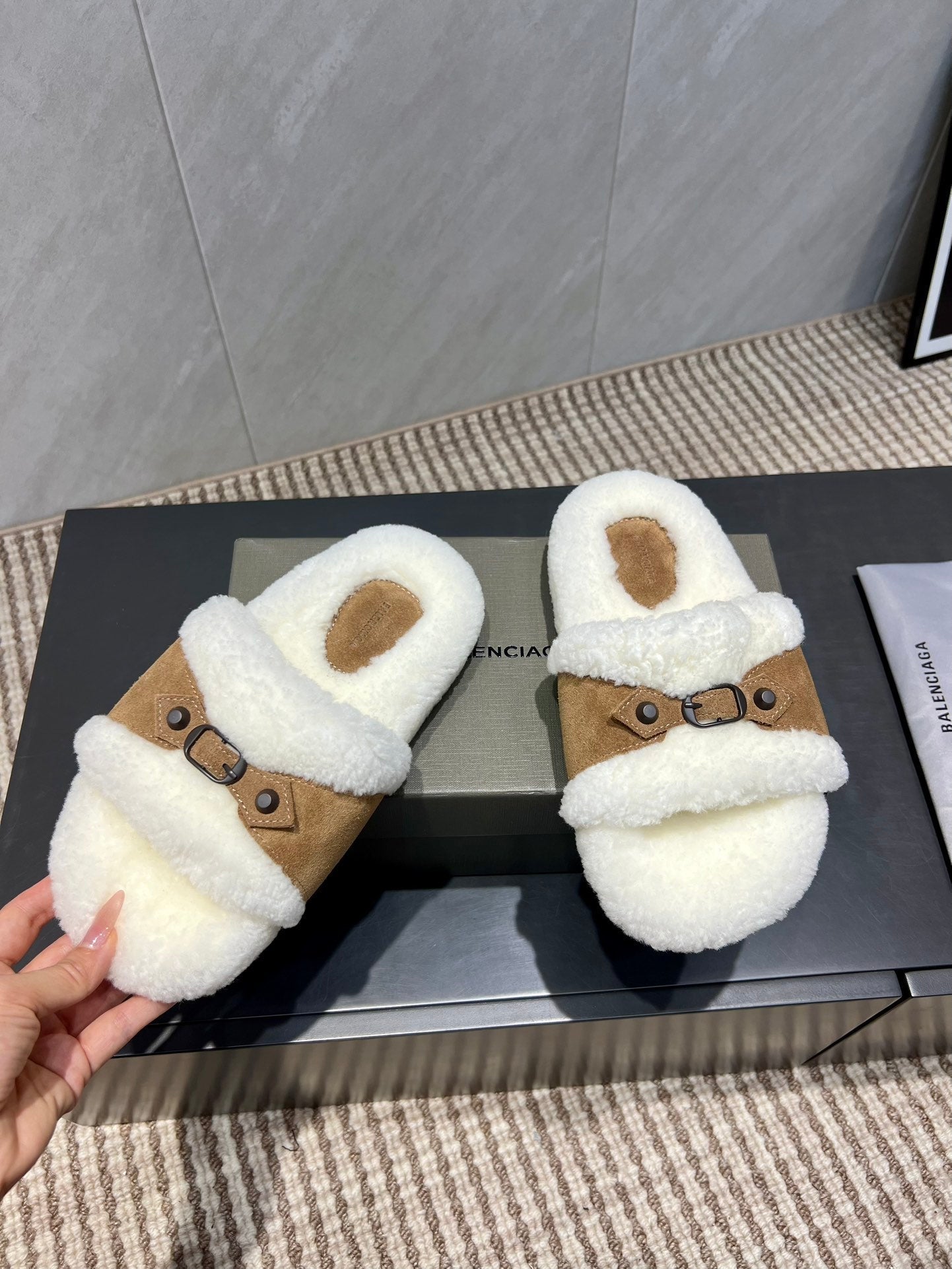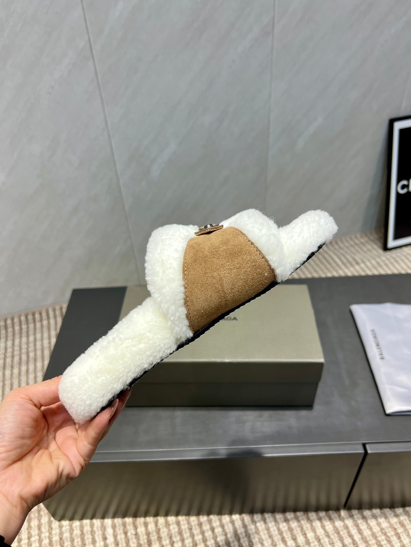 BALENCIAGA 25S SLIPPERS IN LIGHT BROWN SUEDE AND WHITE WOOL
