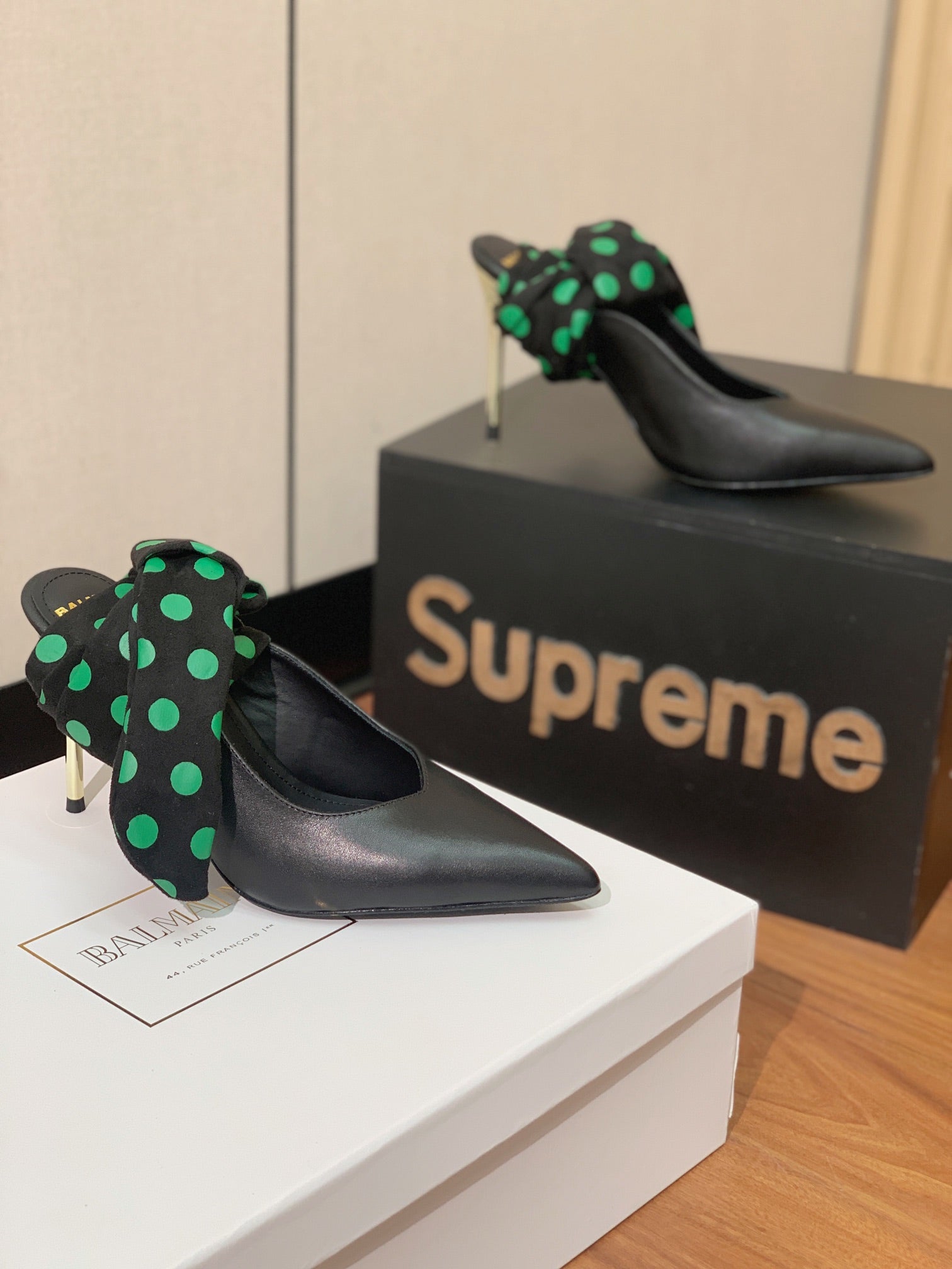 BALMAIN 25S BAKARI MULE WITH GREEN POLKA DOTS ON BLACK STRAP 95MM IN BLACK CALFSKIN