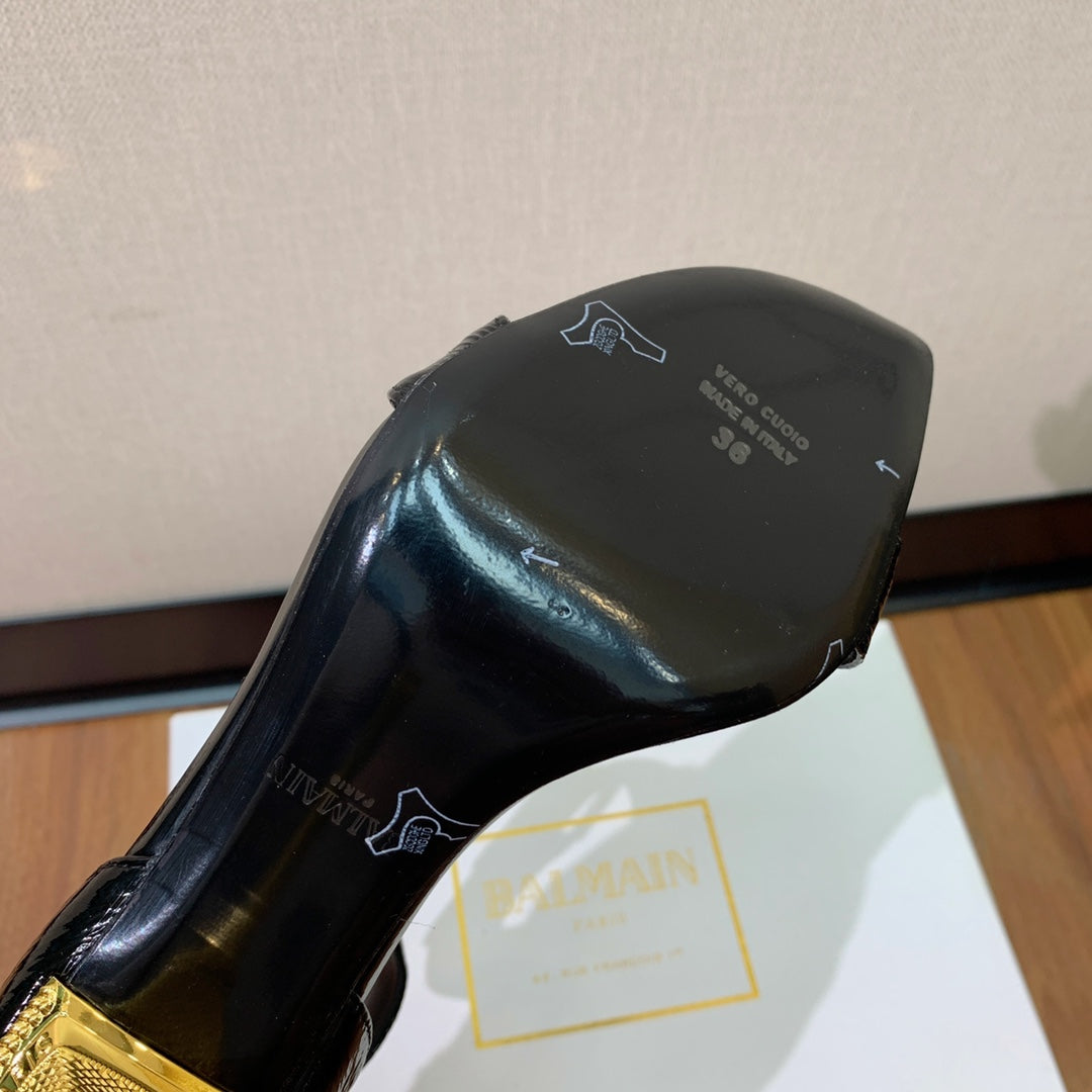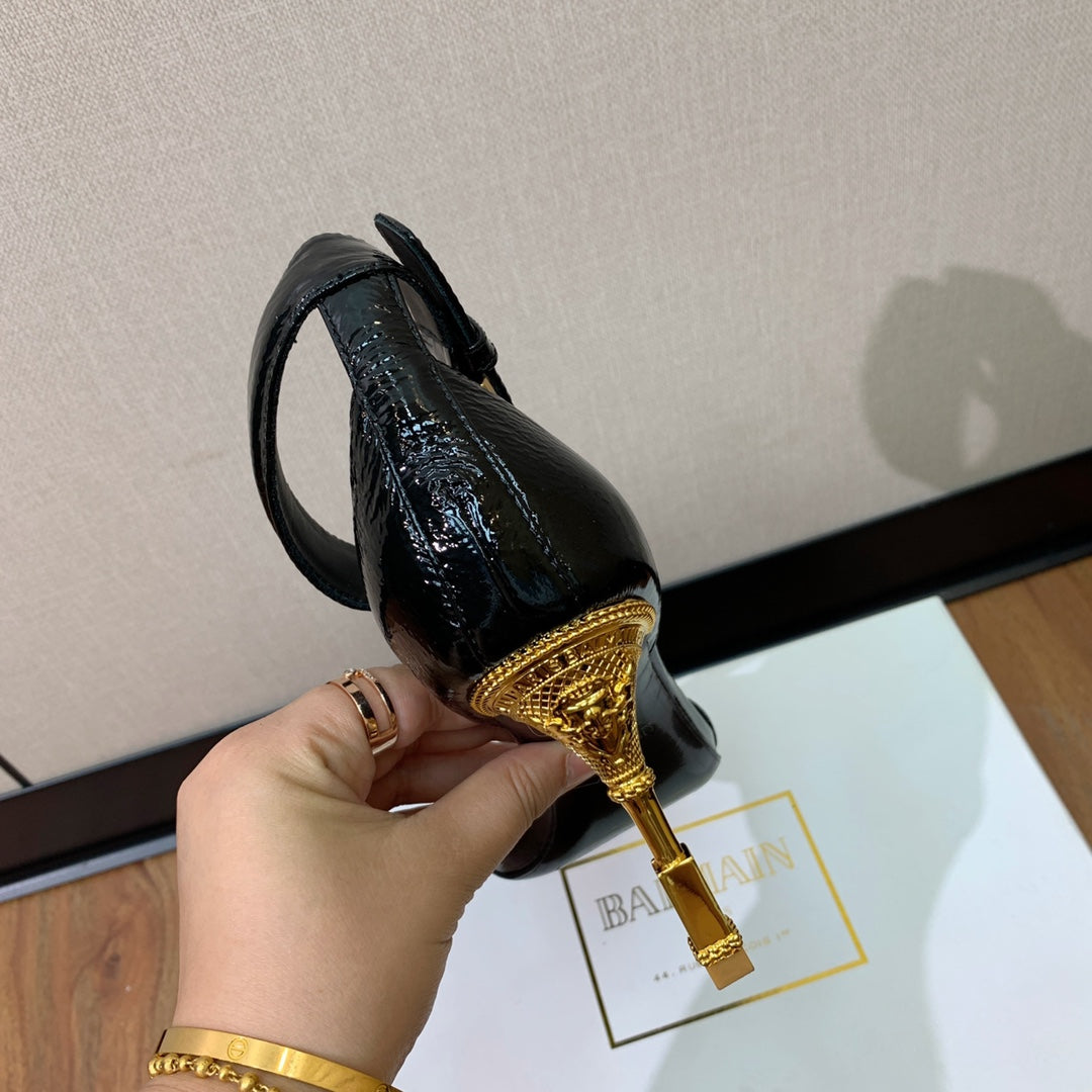 BALMAIN 25S SQUARE STRAP HIGH HEELS 100MM IN BLACK PATENT CALFSKIN