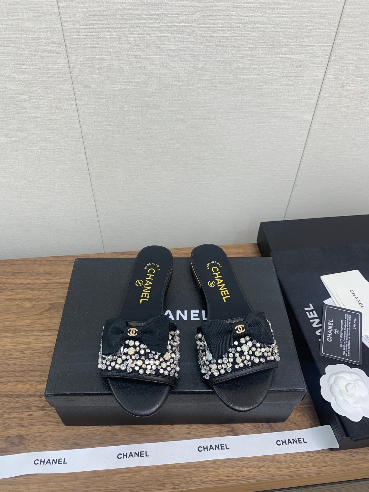 BOW SLIPPERS IN BLACK LAMBSKIN WITH RHINESTONES