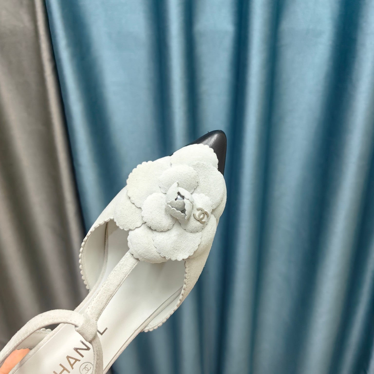 CC CAMELLIA SANDAL IN WHITE SUEDE AND BLACK CALFSKIN WITH FLOWER