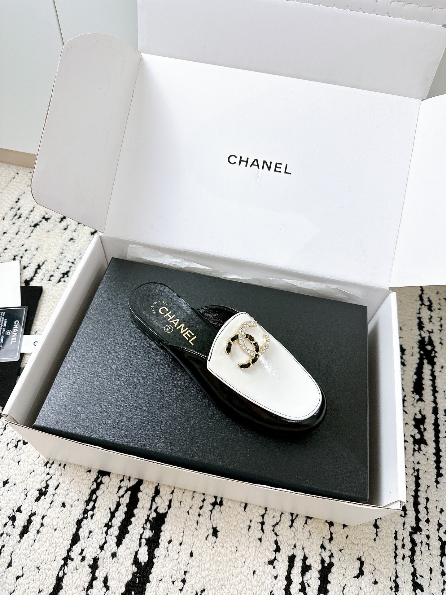 CC FLAT MULE IN WHITE AND BLACK CALFSKIN HARDWARE WITH ROCK MIX CHAIN