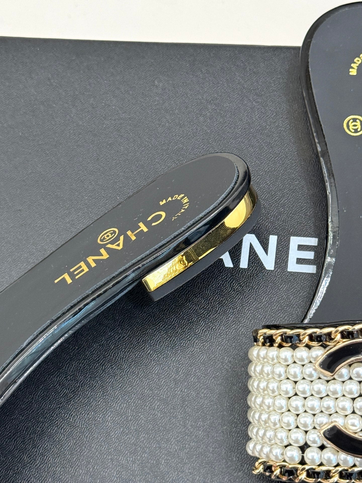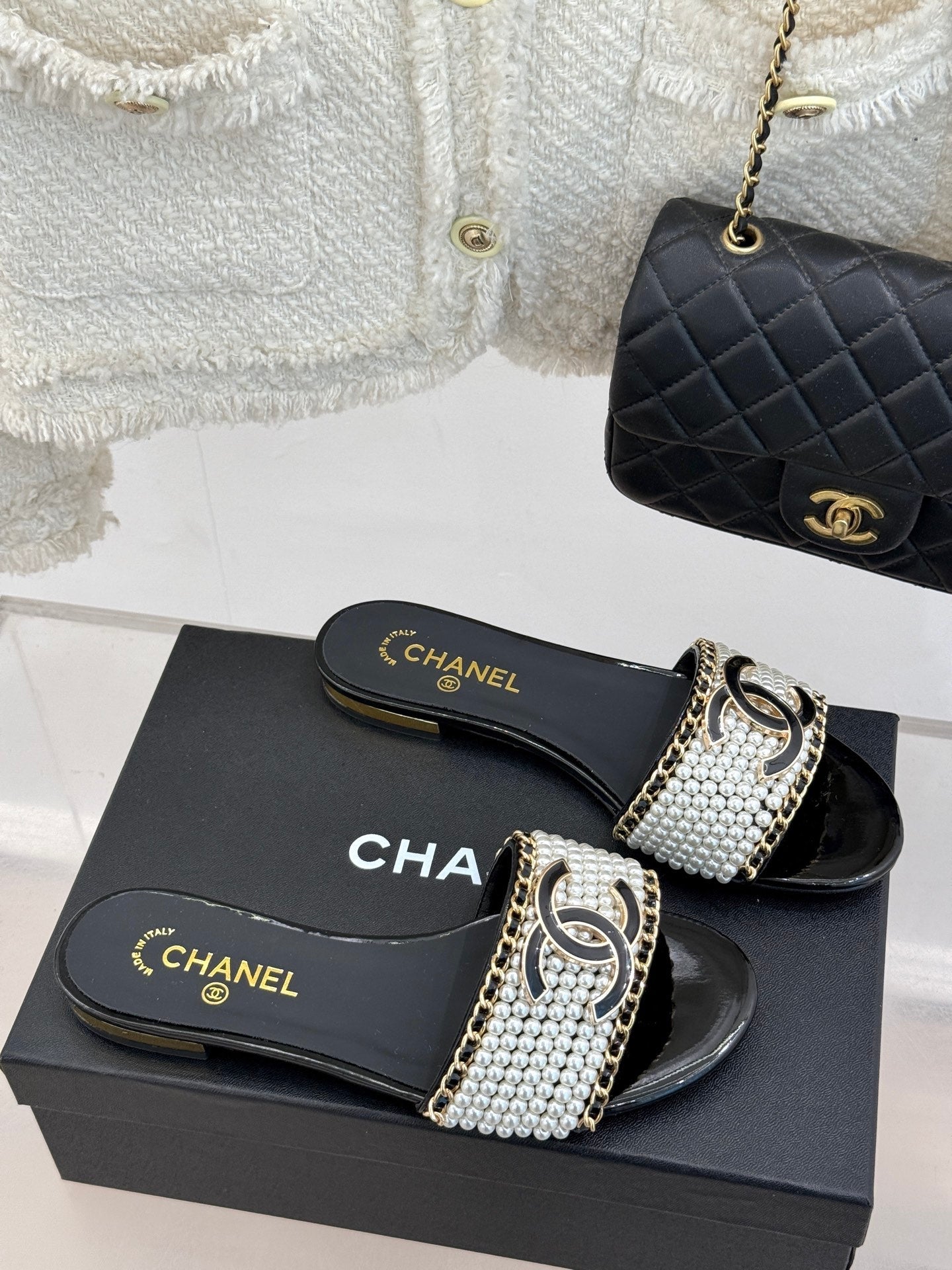 CC SLIDE SANDALS IN BLACK AND WHITE PEARL