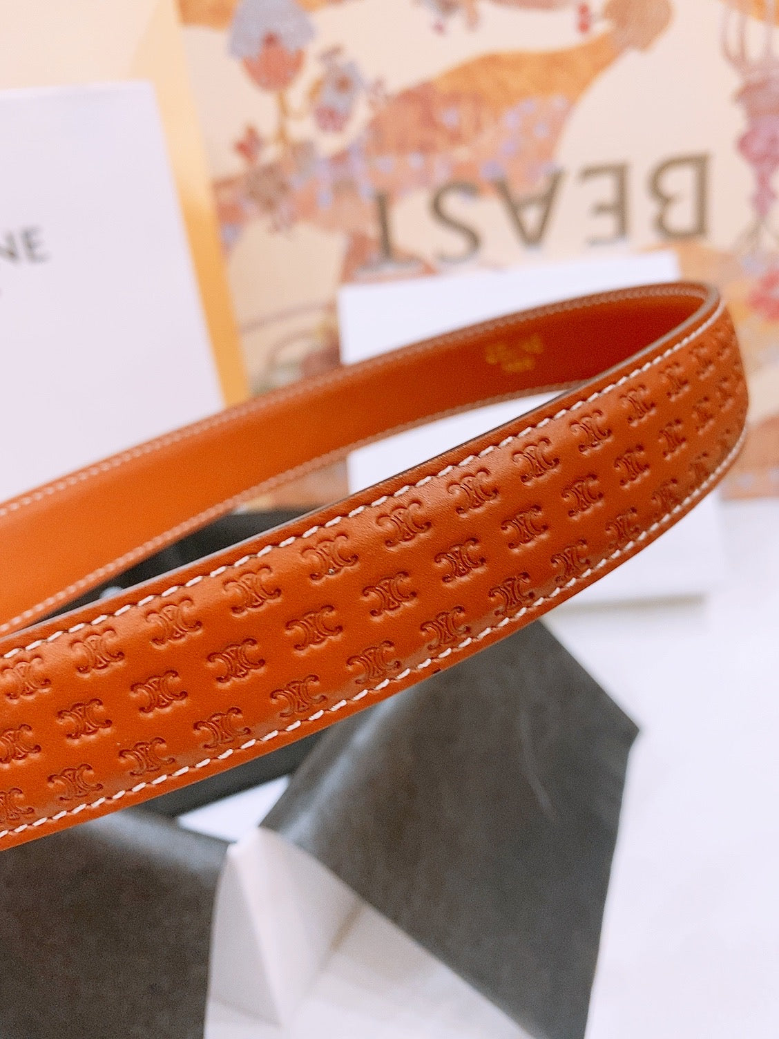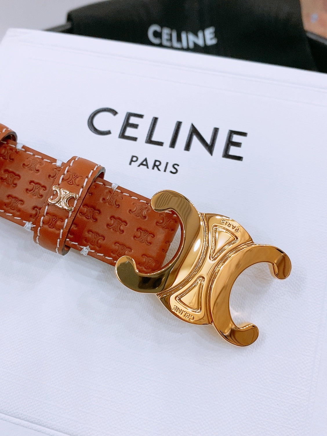 CELINE 25S TRIOMPHE BELT 25MM IN DARK CARAMEL CALFSKIN DEBOSSED LOGO 570964