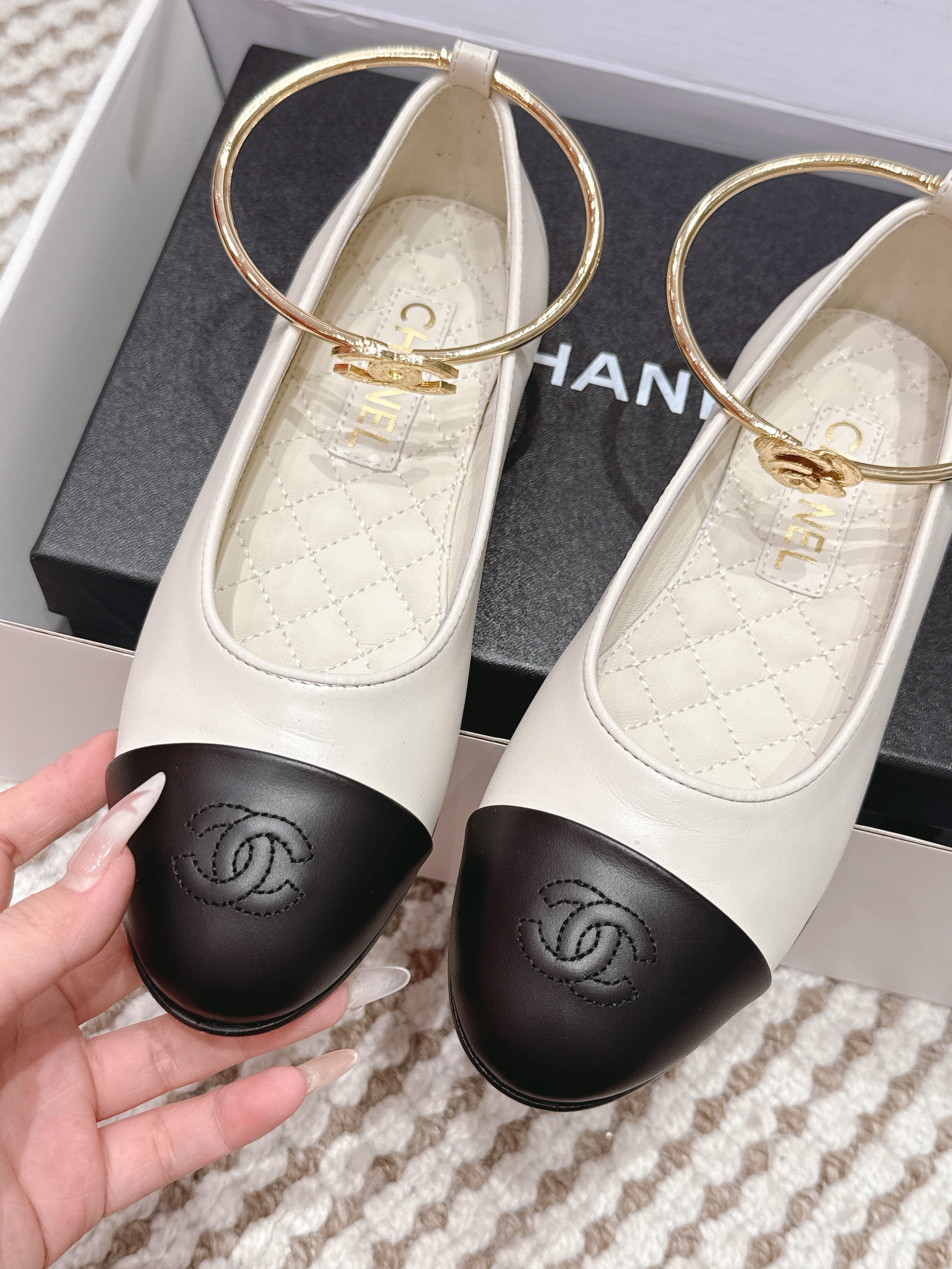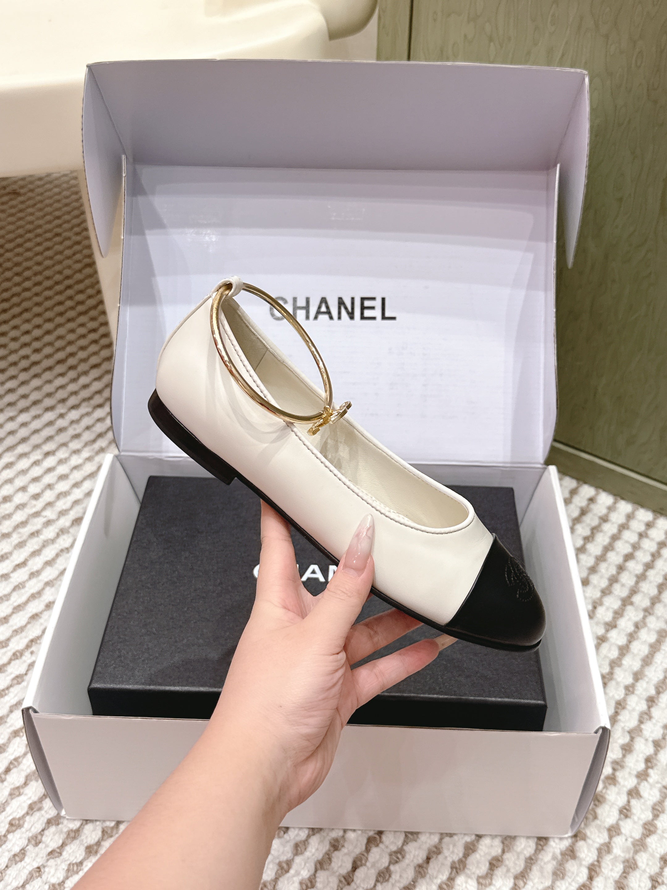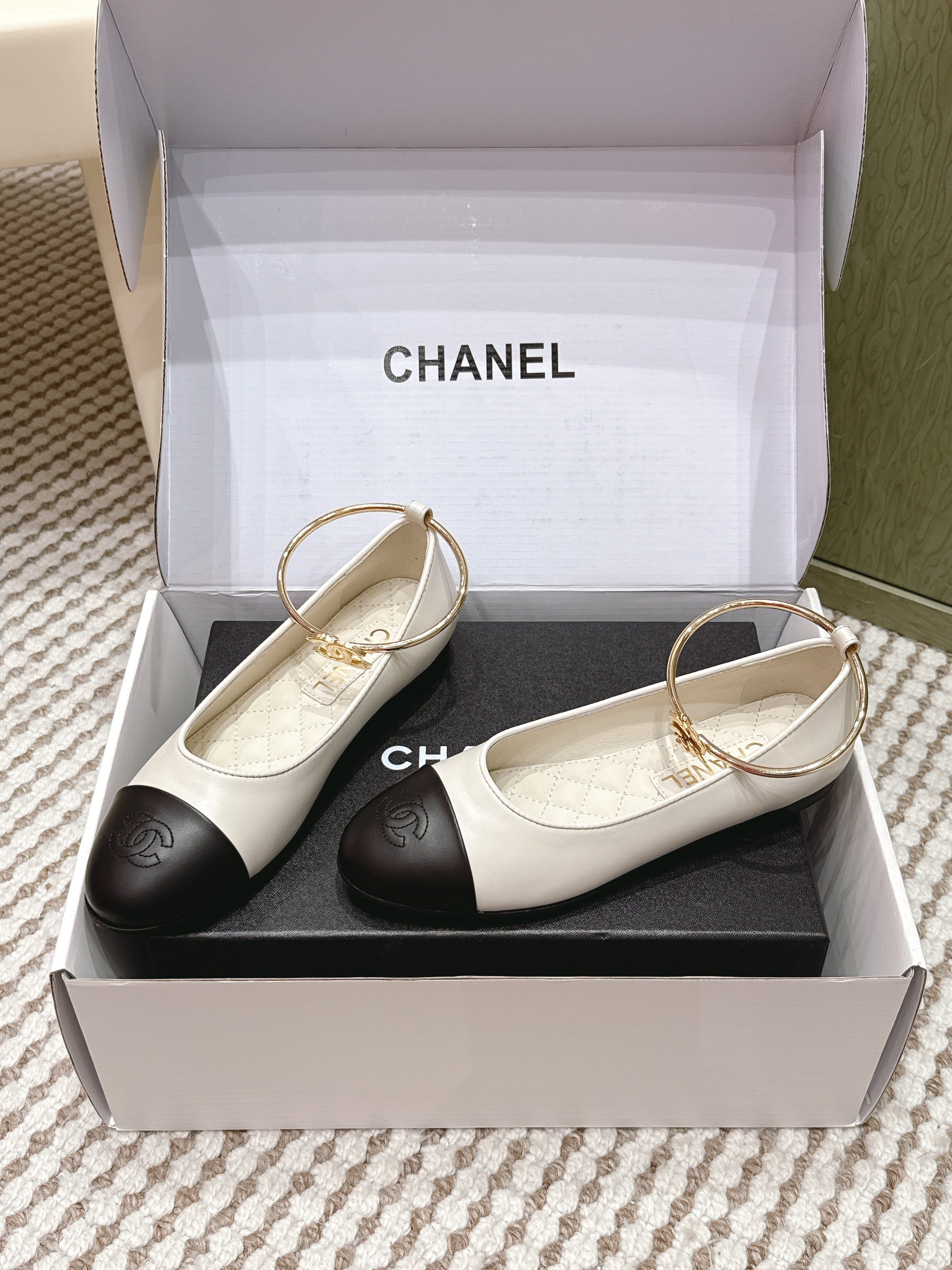 CHANEL 25S BALLERINA SHOES IN WHITE AND BLACK CALFSKIN GOLD HARDWARE