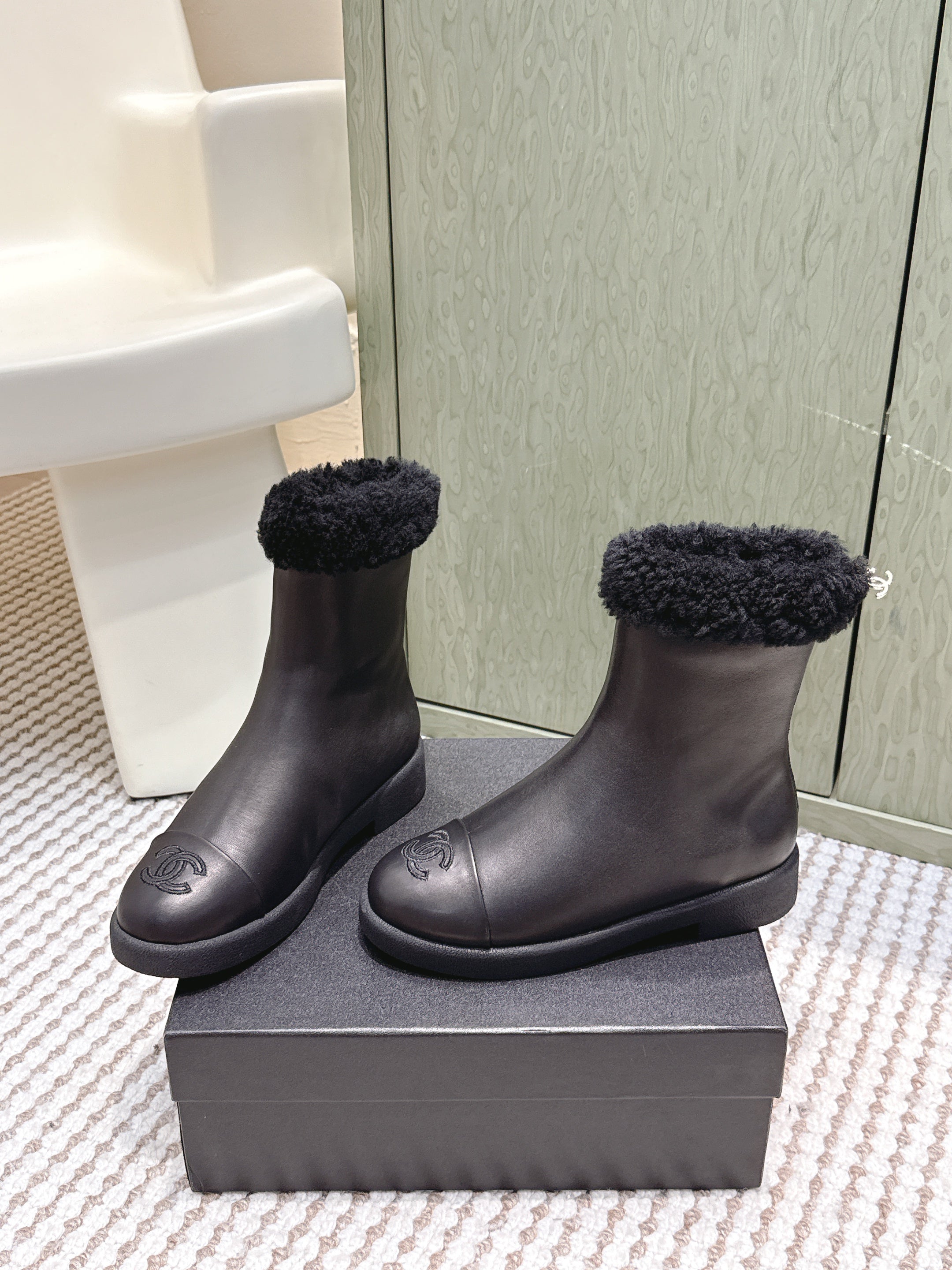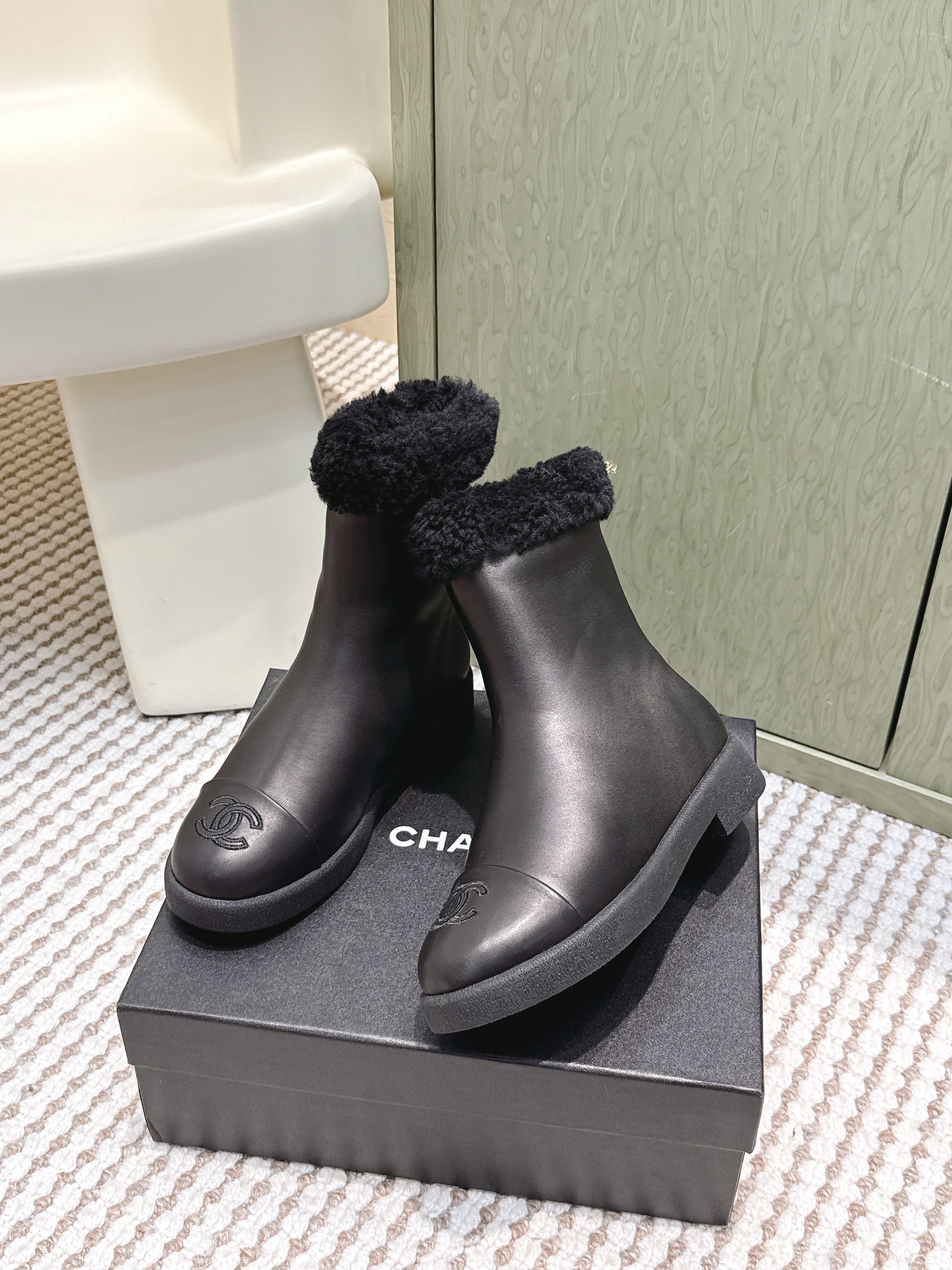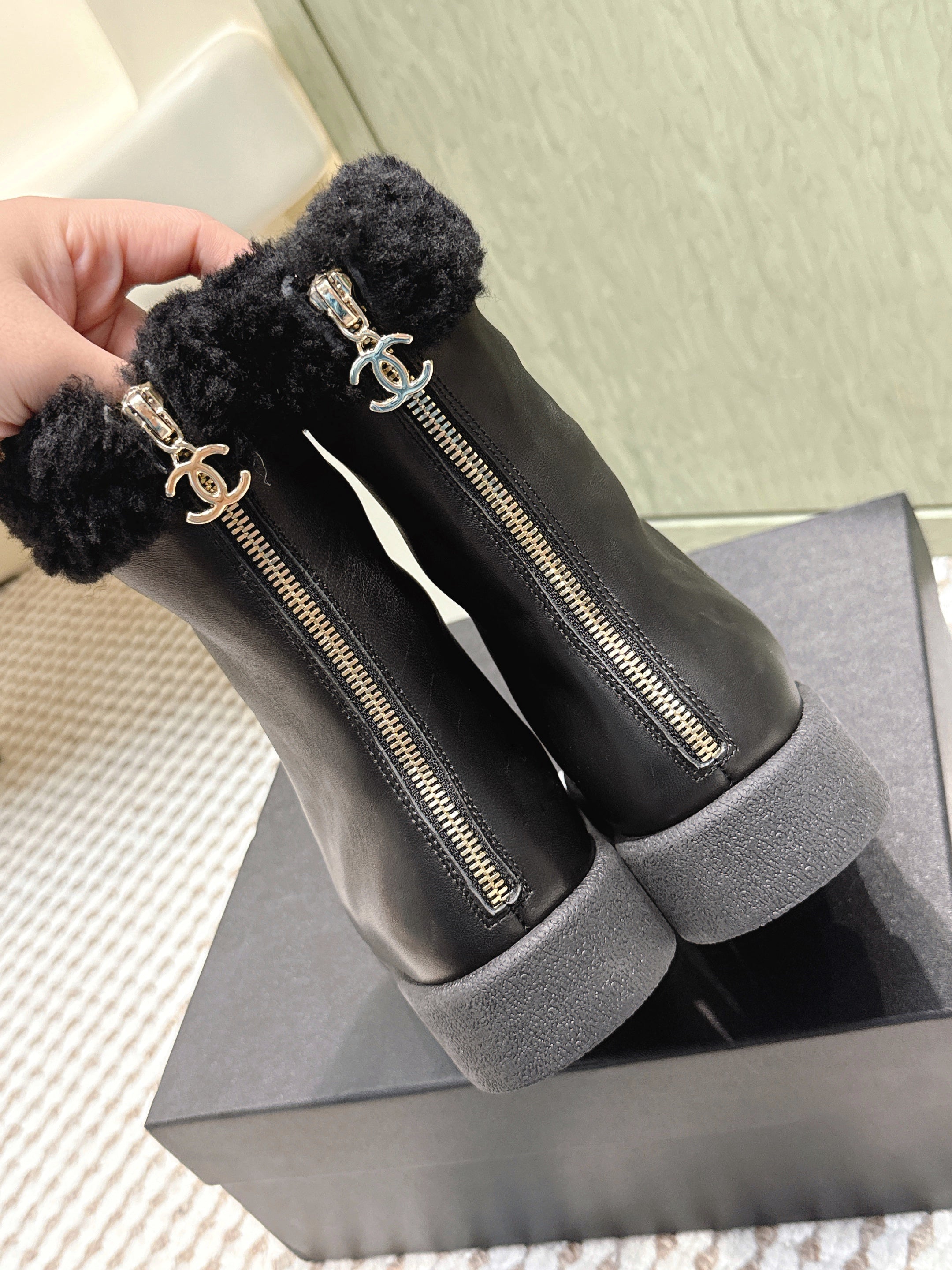 CHANEL 25S CALF-HIGH BOOTS IN BLACK CALFSKIN LINED WITH SHEEPSKIN