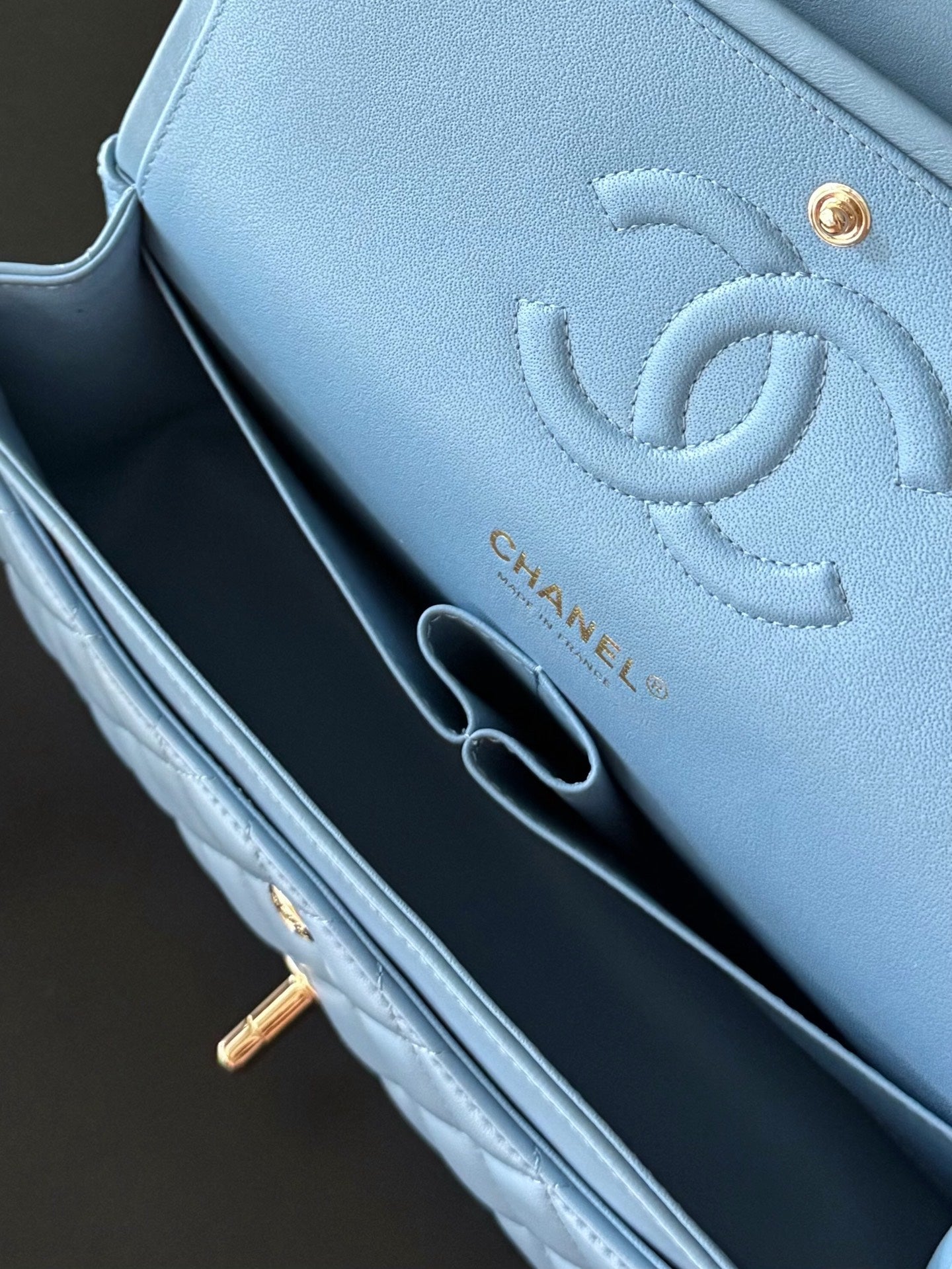 CHANEL 25S CLASSIC FLAP BAG 25 CM IN LIGHT BLUE LAMBSKIN WITH GOLD HARDWARE