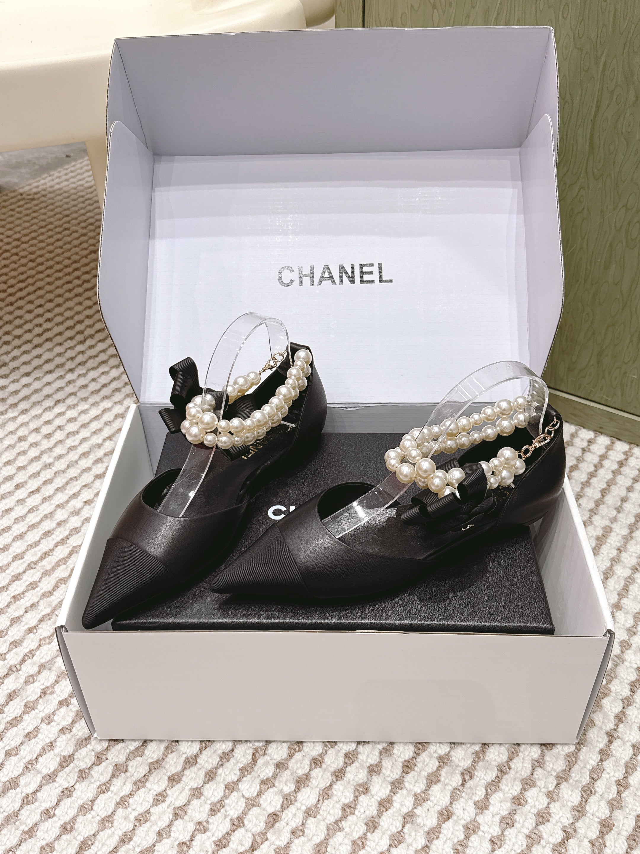 CHANEL 25S ESPADRILLE FLATS IN BLACK CALFSKIN WITH PEARL STRAP