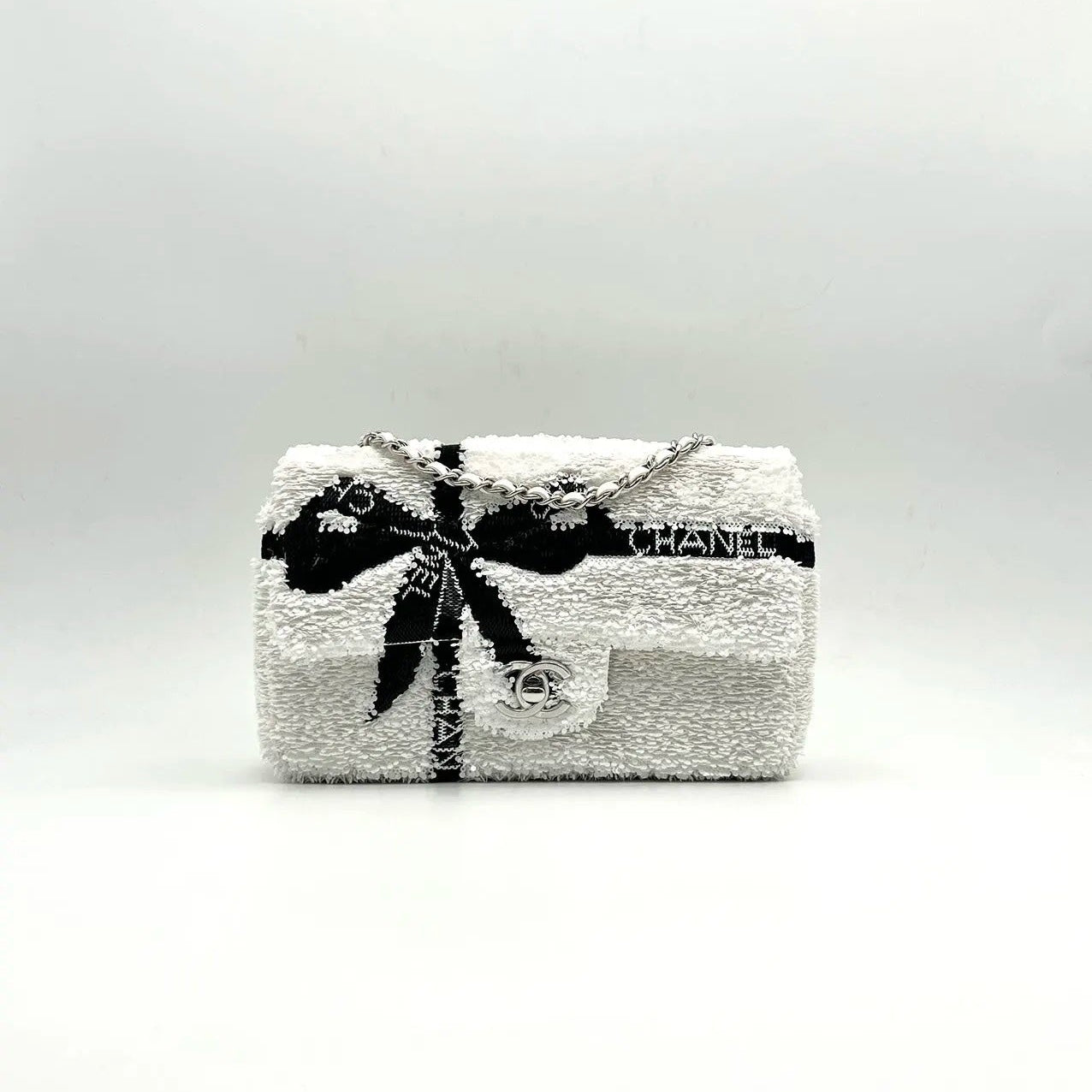 CHANEL 25S FLAP BAG 20 CM IN WHITE SEQUINS WITH BLACK BOW