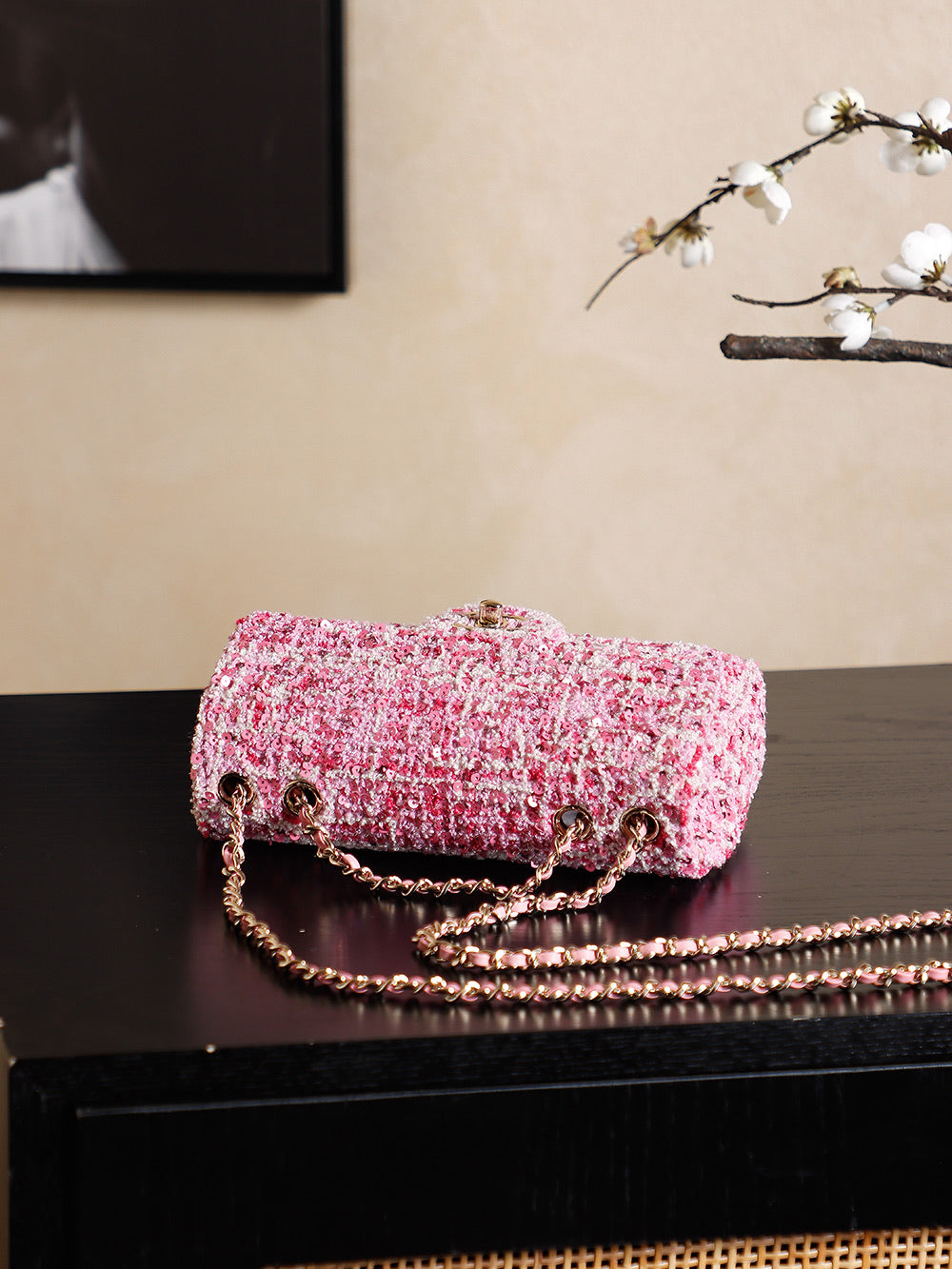 CHANEL 25S FLAP BAG 21 CM IN PINK SEQUINED TWEED WITH GOLD HARDWARE