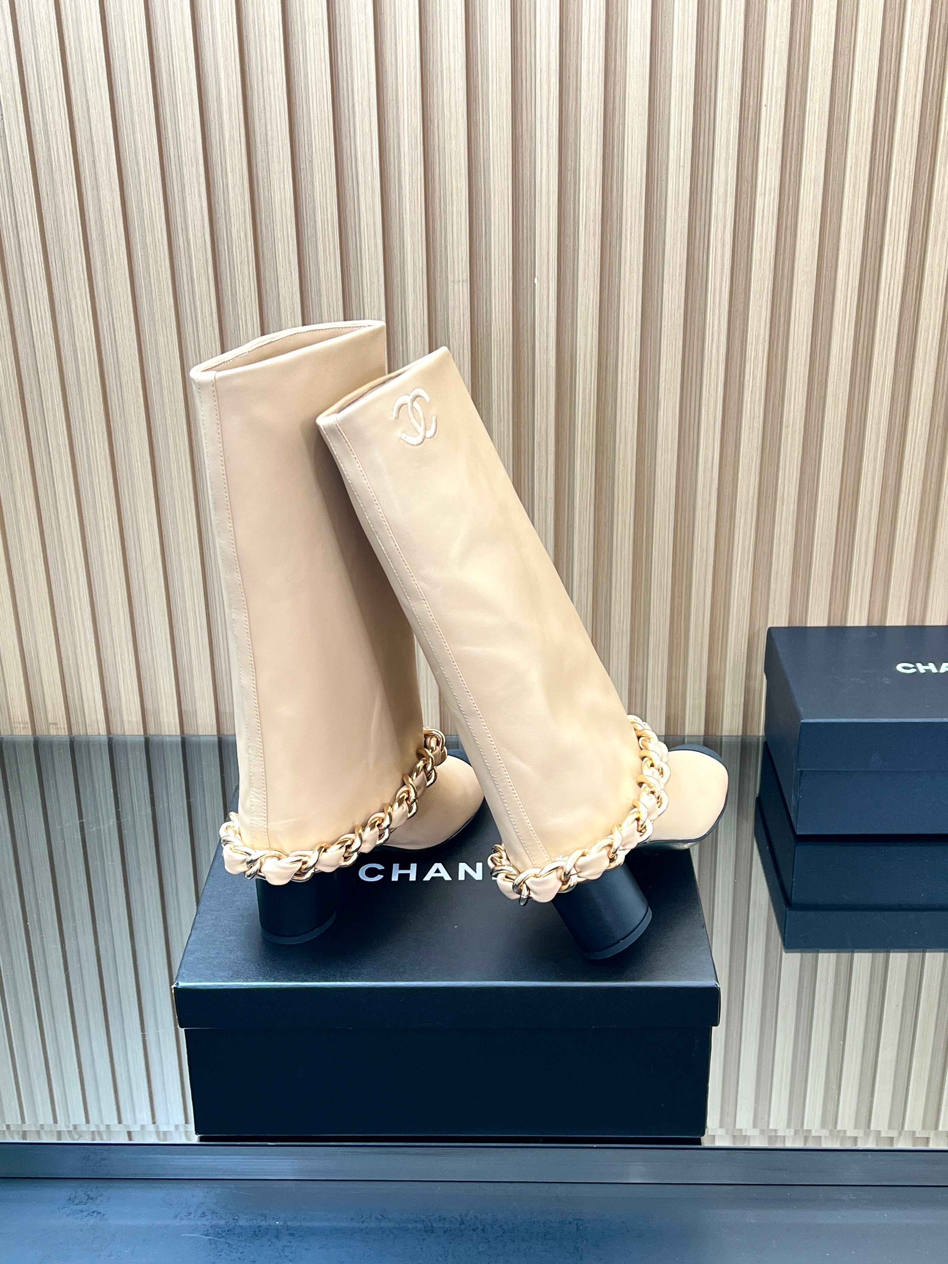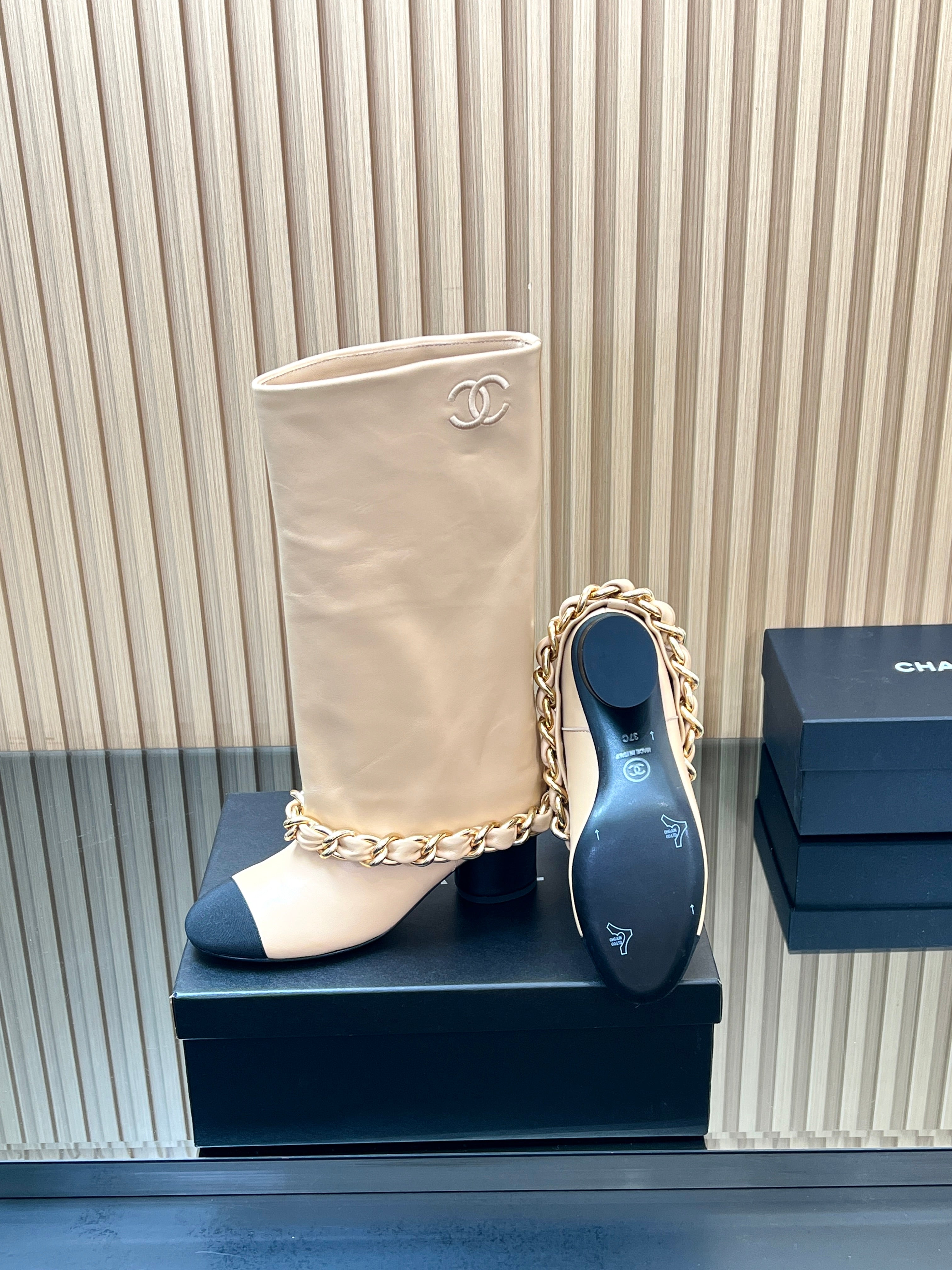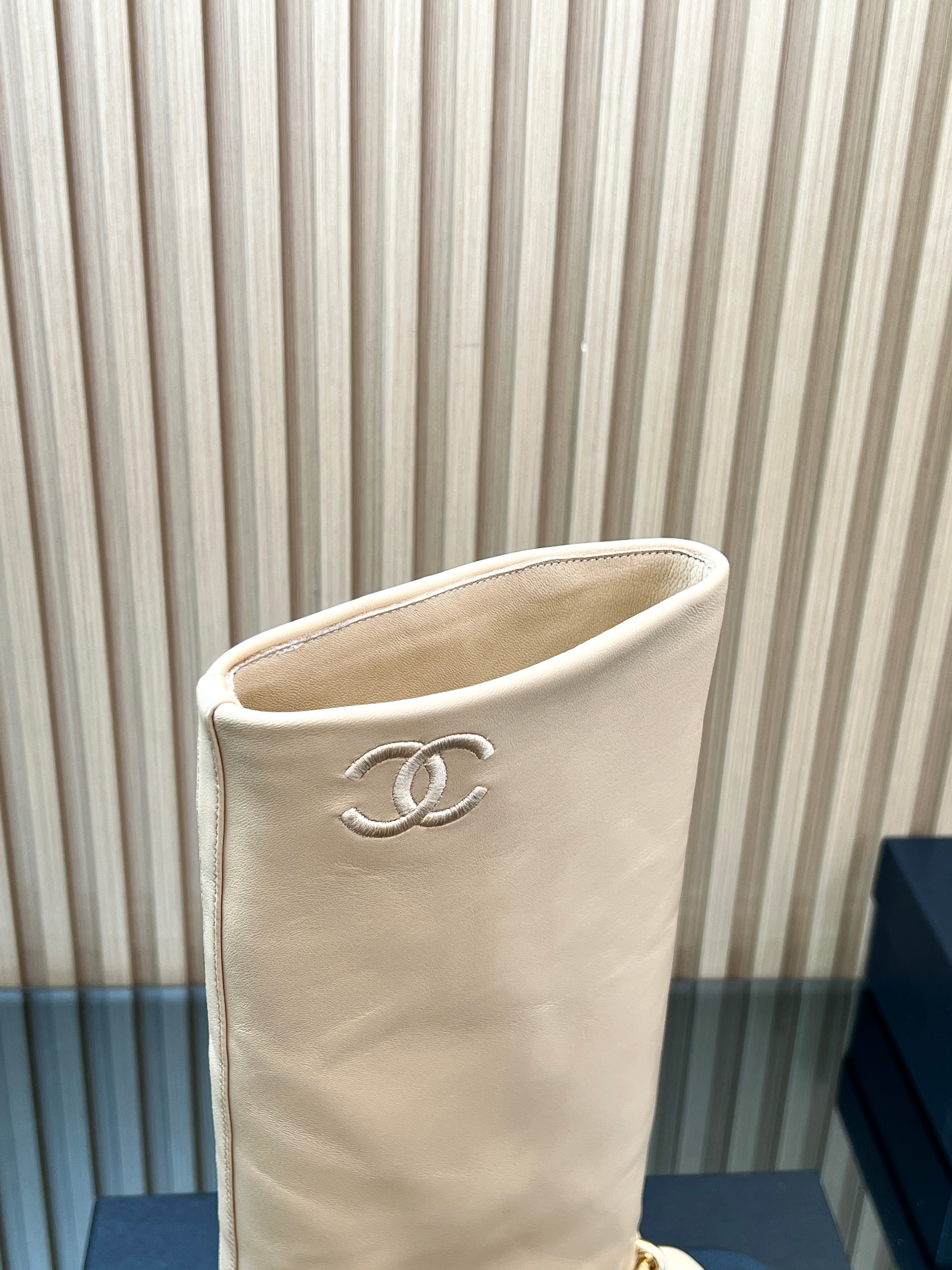CHANEL 25S HIGH BOOTS 65MM IN BEIGE CALFSKIN GOLD HARDWRE
