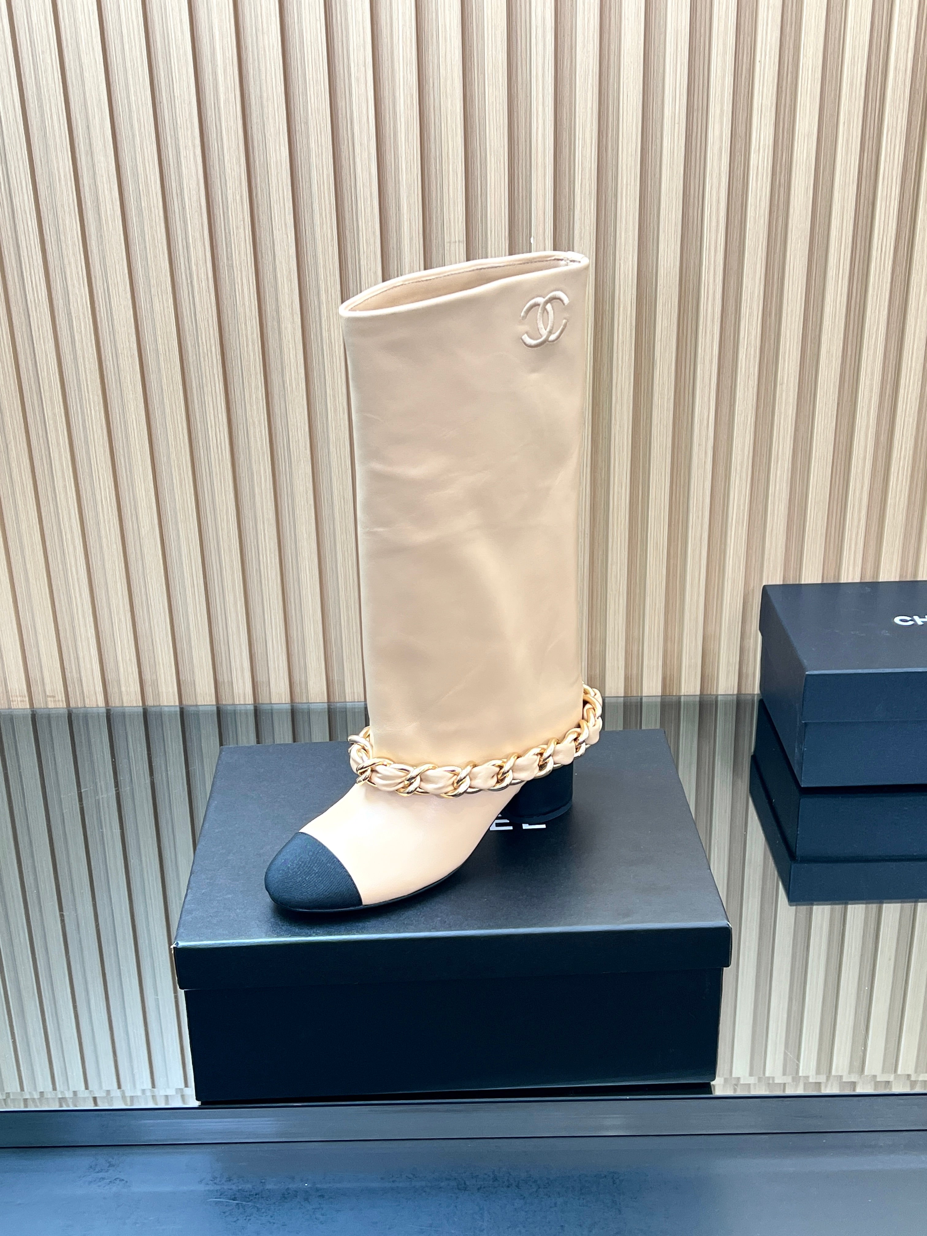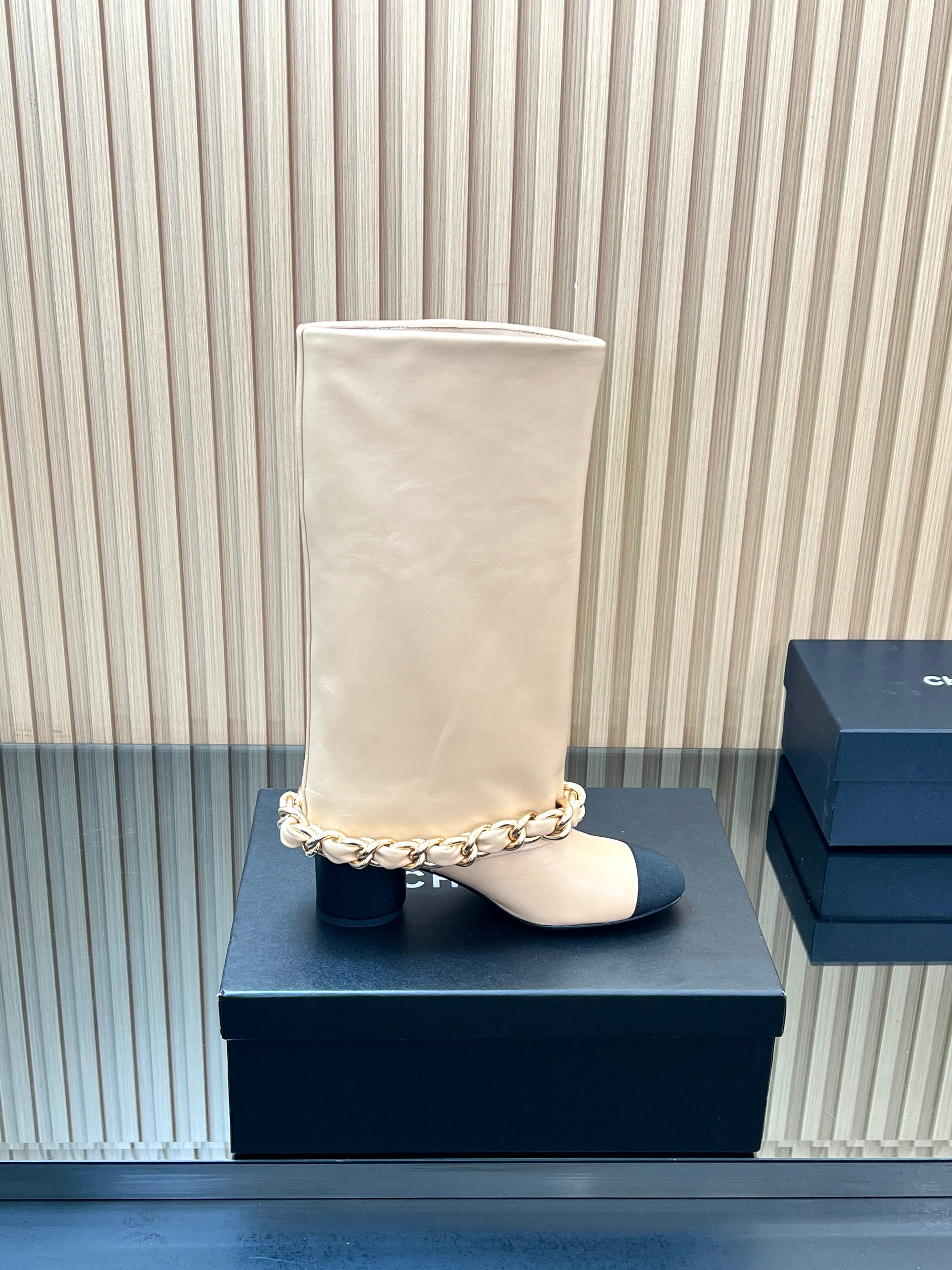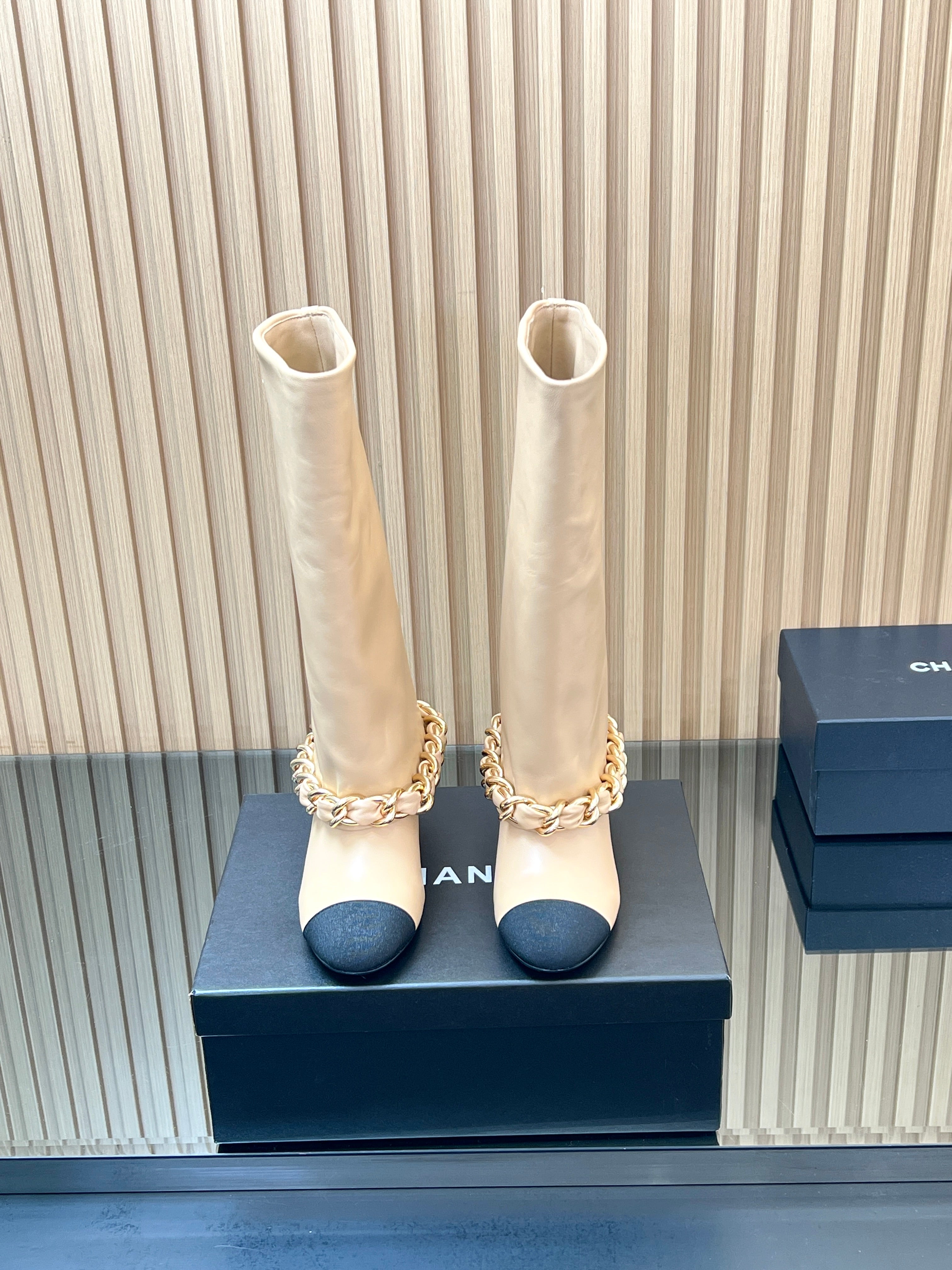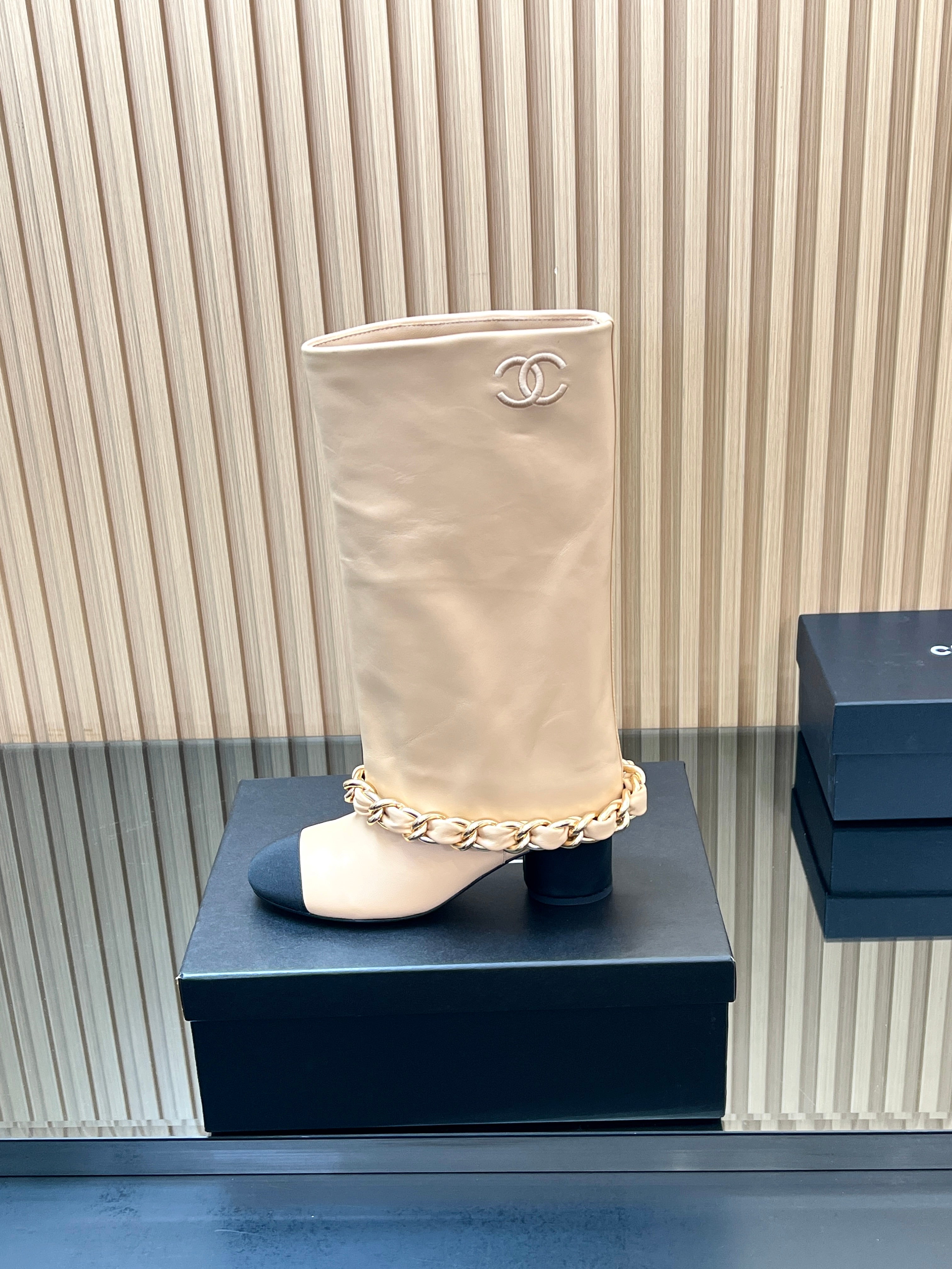 CHANEL 25S HIGH BOOTS 65MM IN BEIGE CALFSKIN GOLD HARDWRE