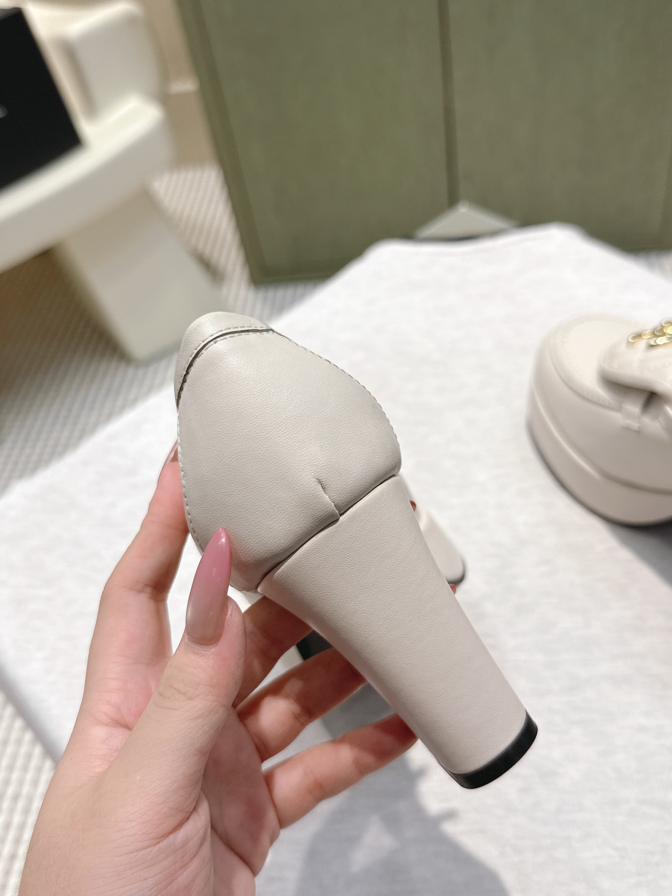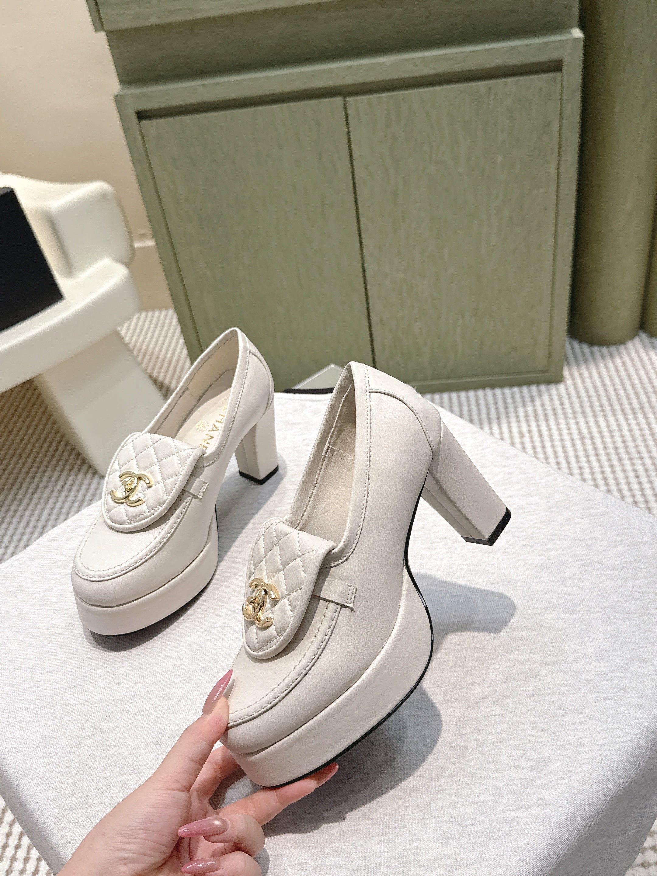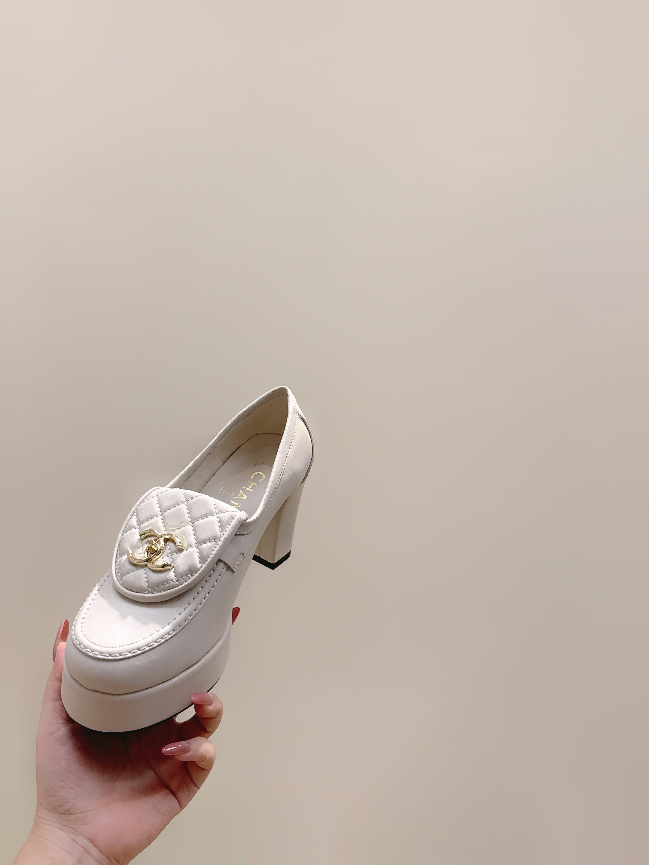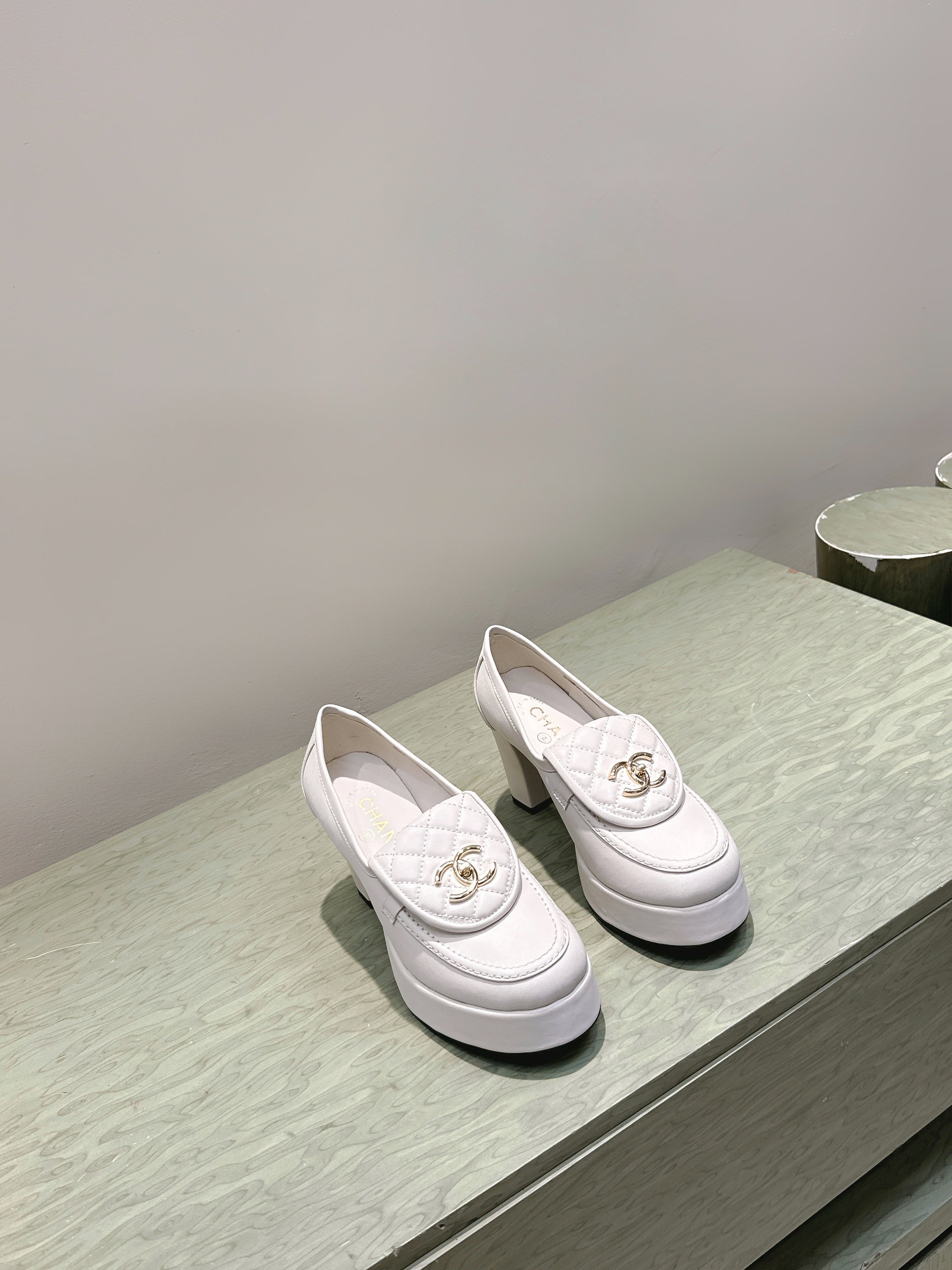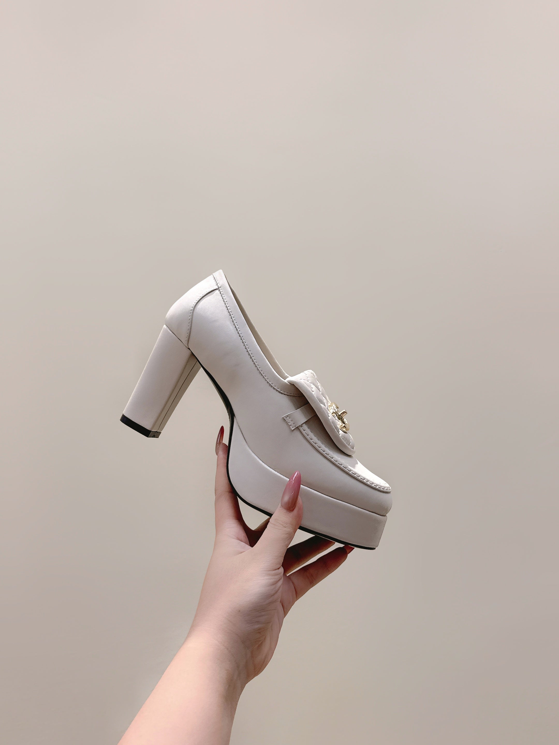 CHANEL 25S HIGH-HEELED MOCCASINS 80MM IN WHITE CALFSKIN GOLD HARDWARE