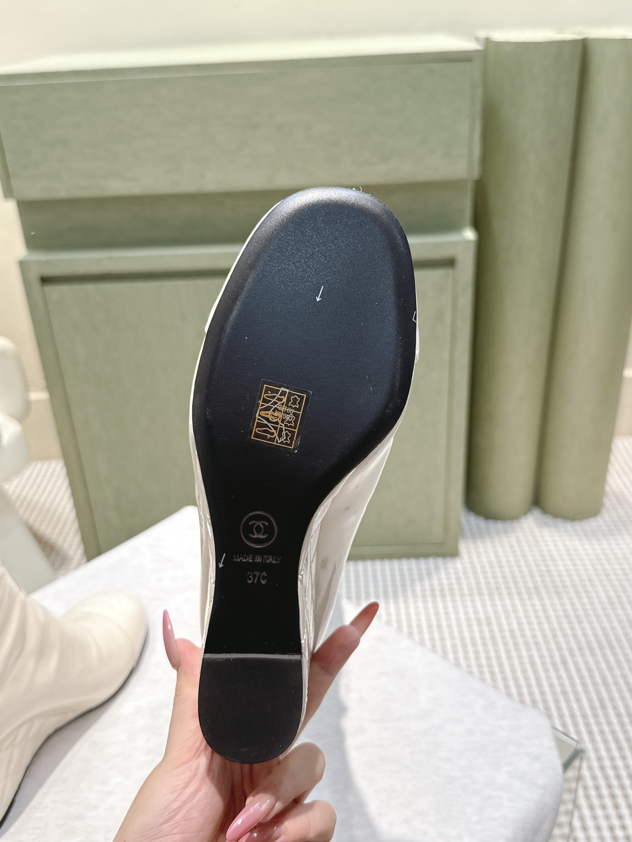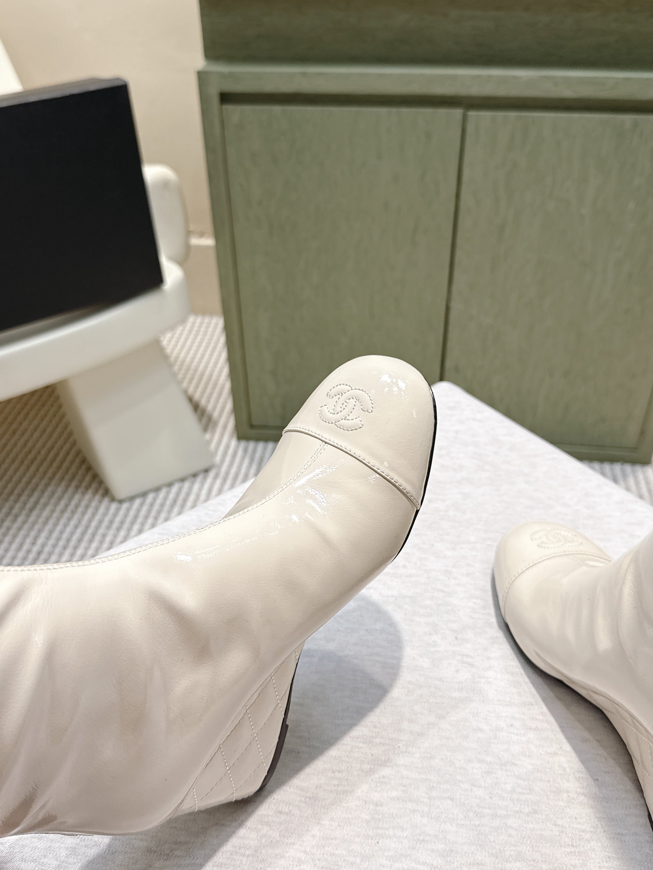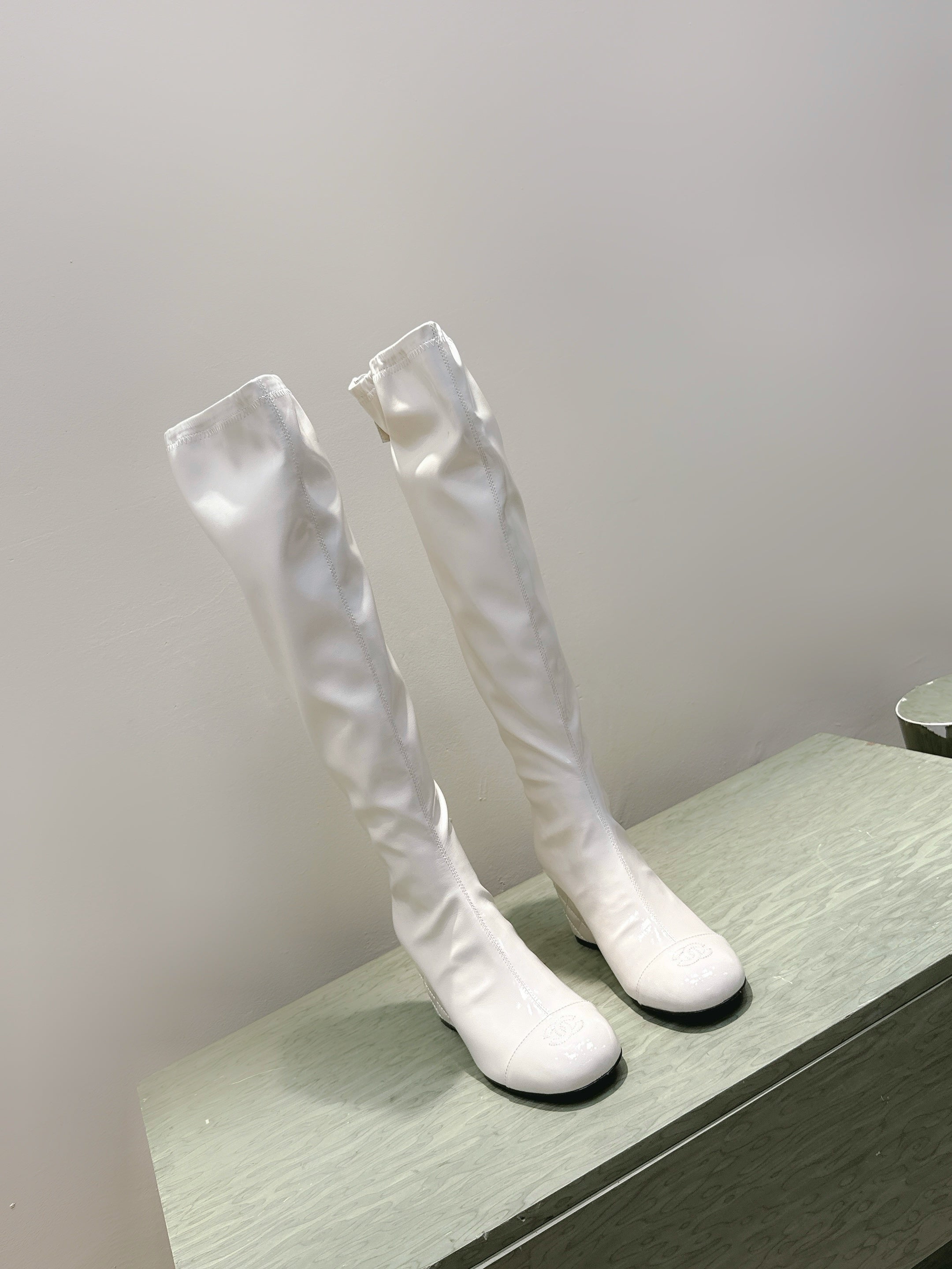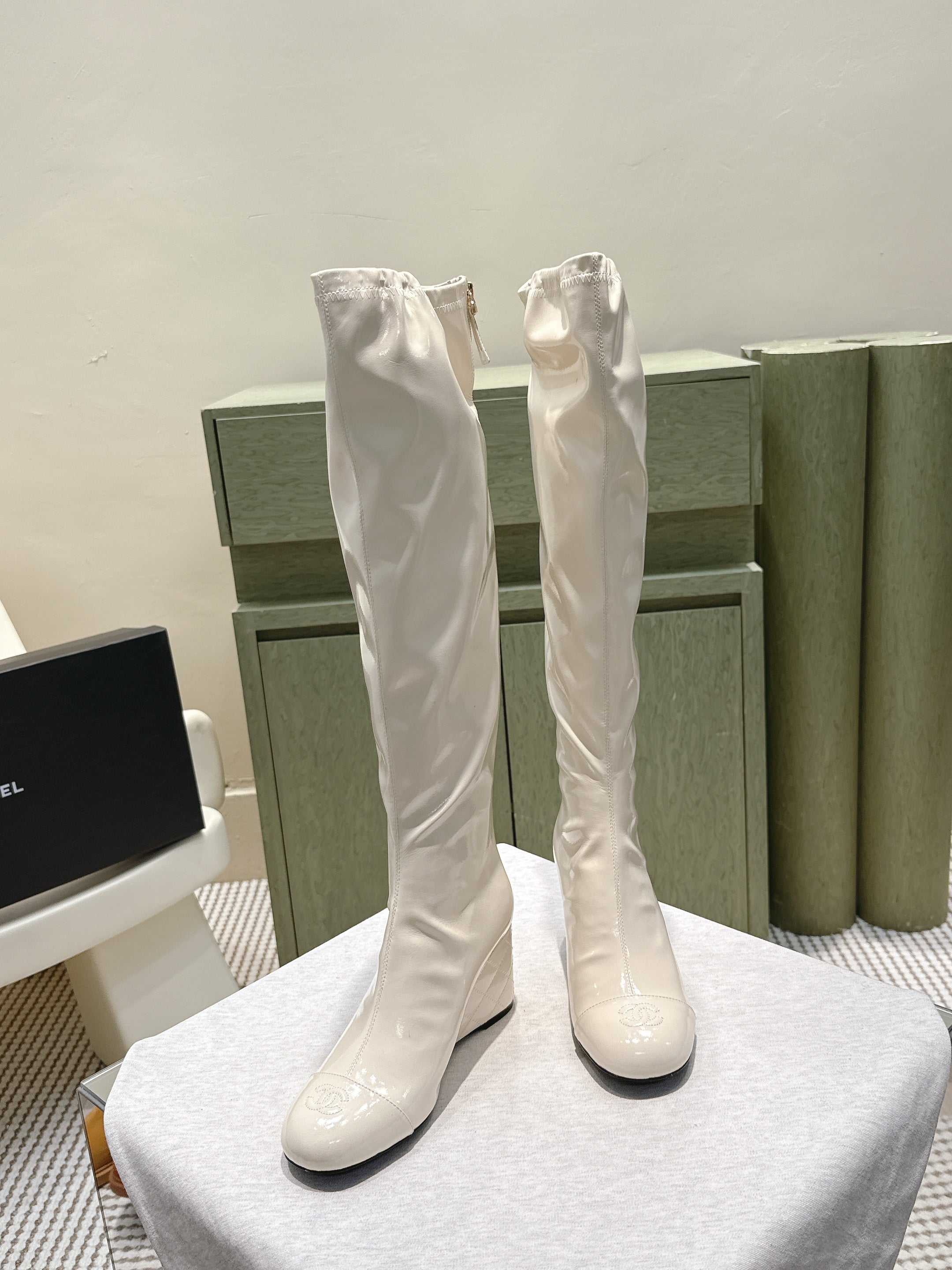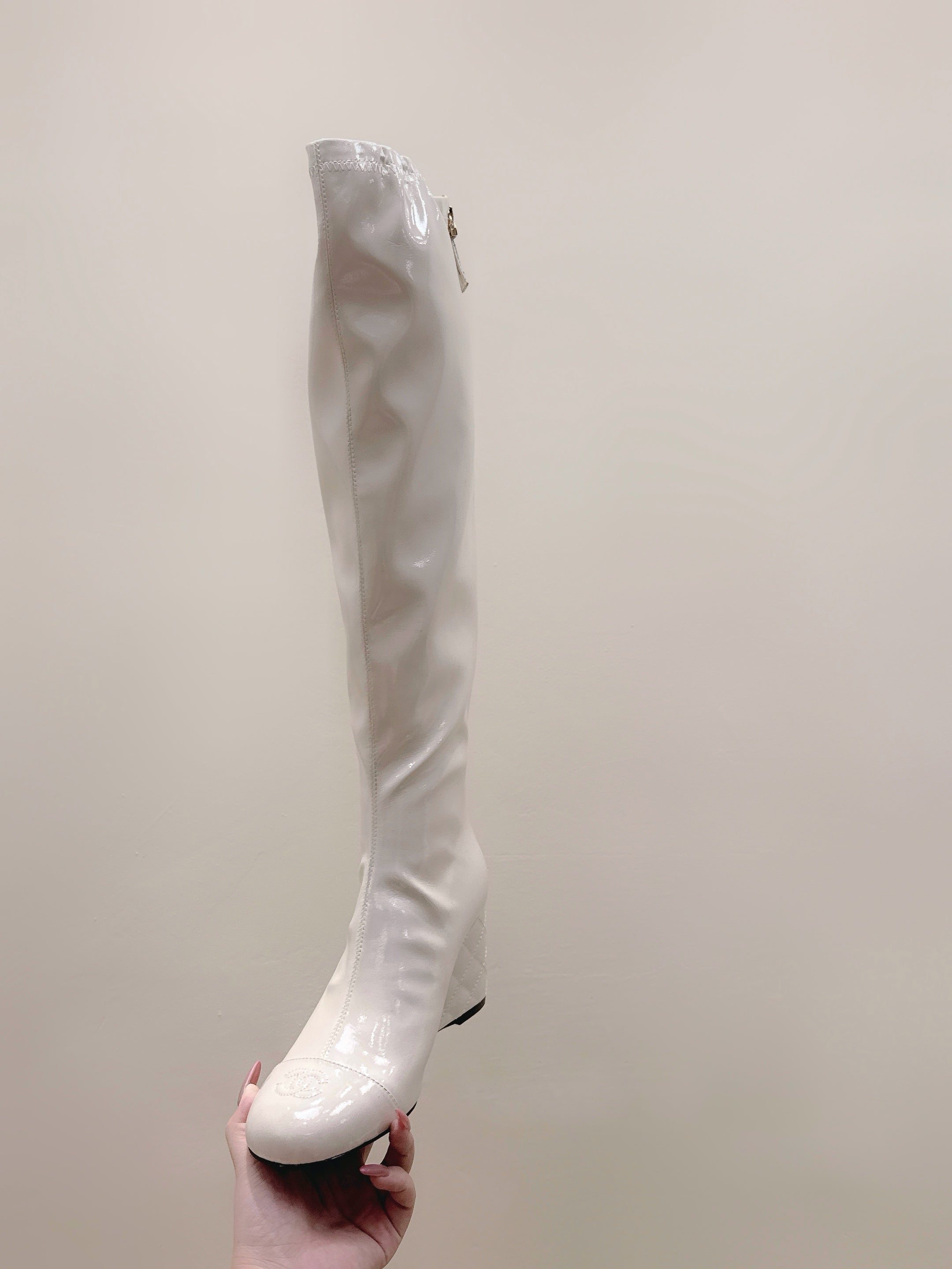CHANEL 25S KNEE-HIGH BOOTS 60MM IN WHITE PATENT CALFSKIN WEDGE HEELS