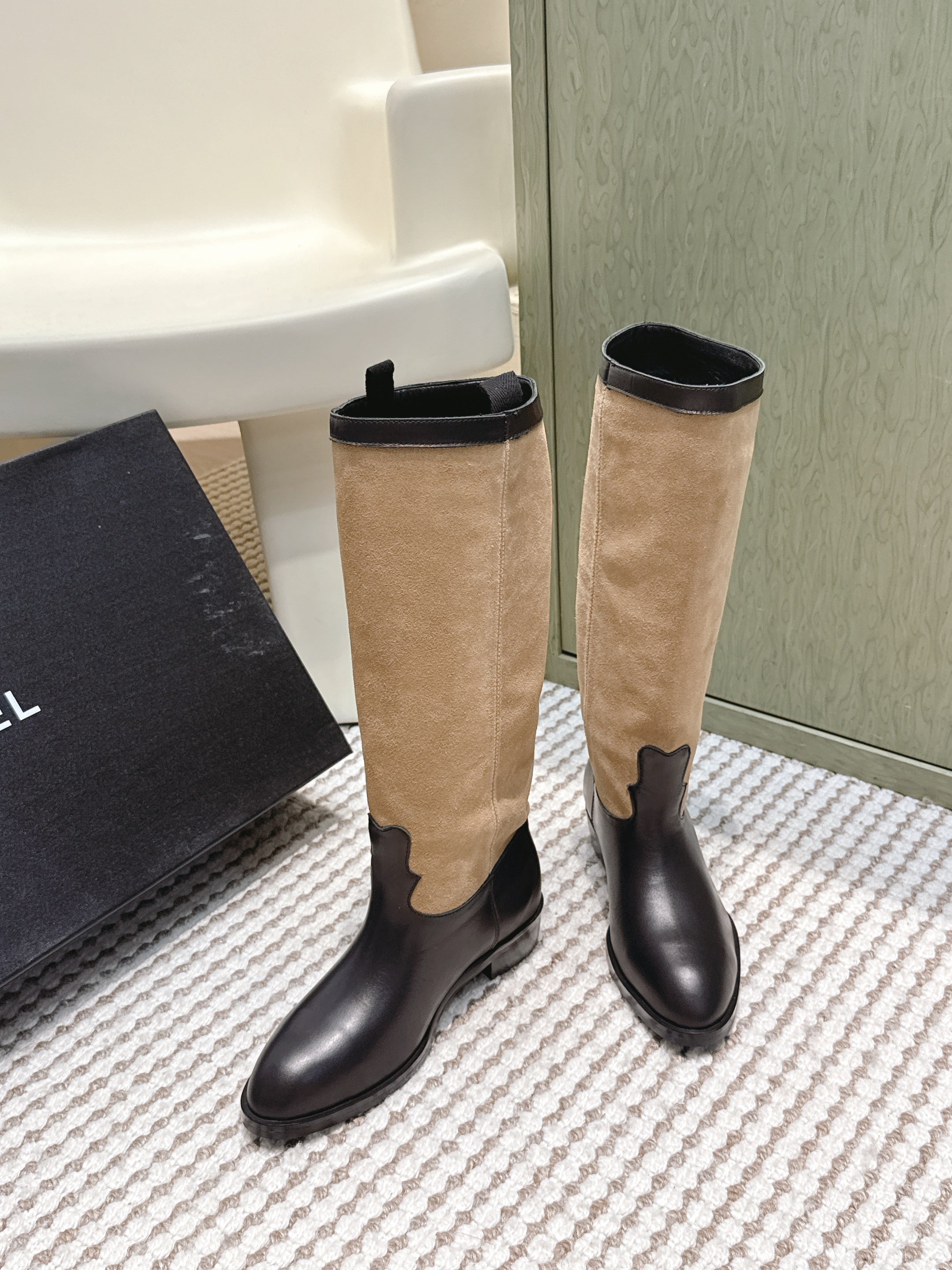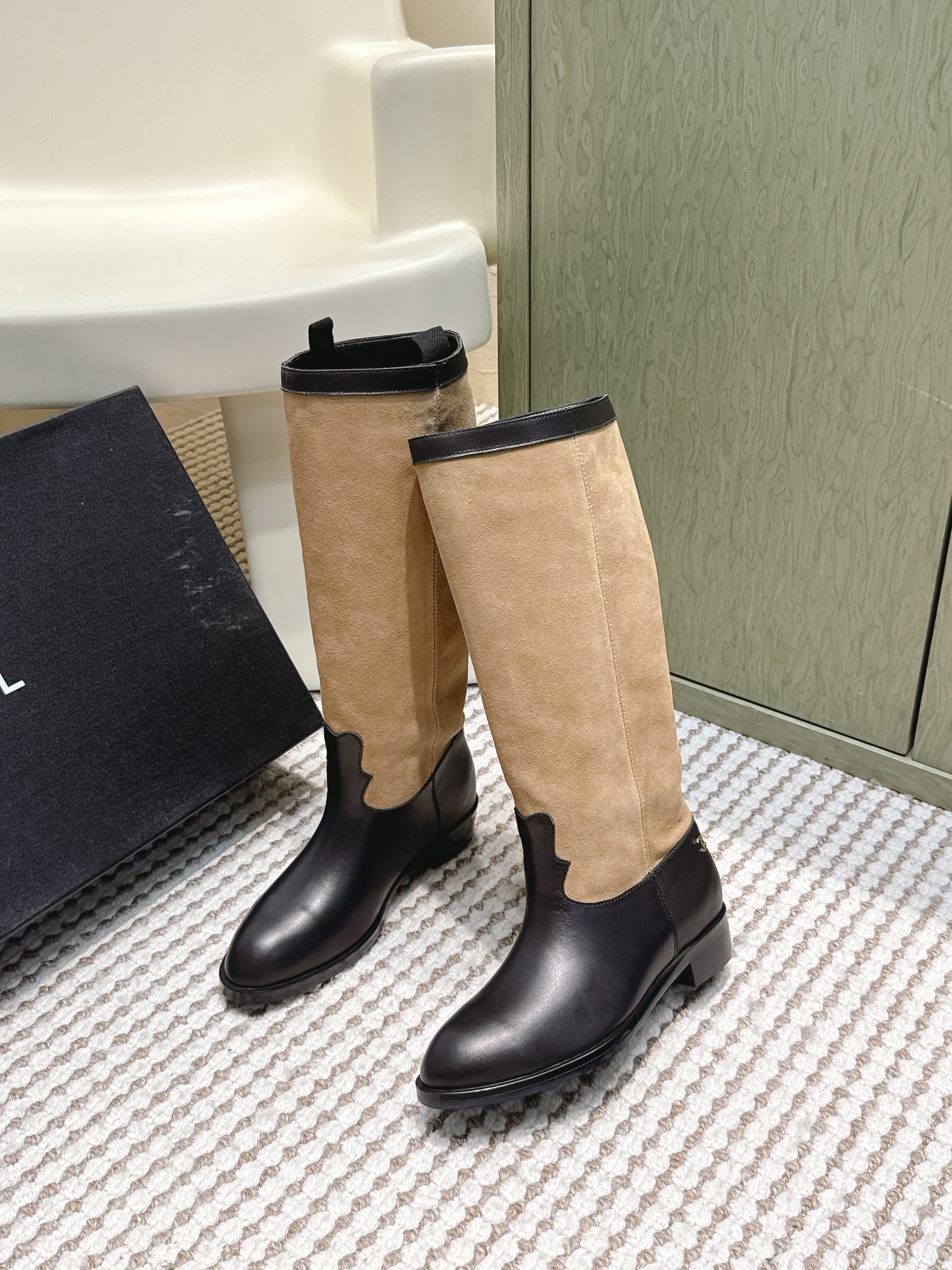 CHANEL 25S KNEE-HIGH BOOTS IN TAN BROWN SUEDE MIX BLACK CALFSKIN