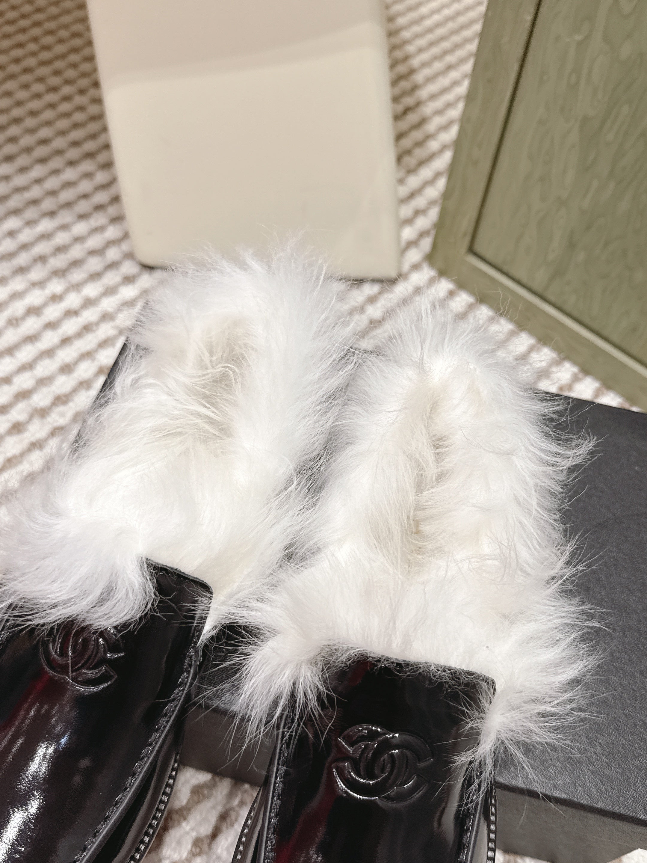 CHANEL 25S LOAFERS MOCCASIN IN BLACK GLOSSY CALFSKIN WITH WHITE MINK FUR LINING