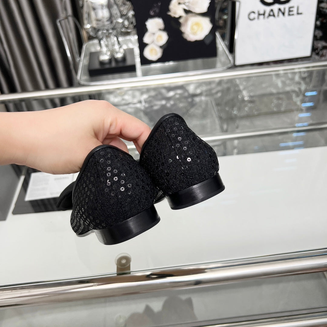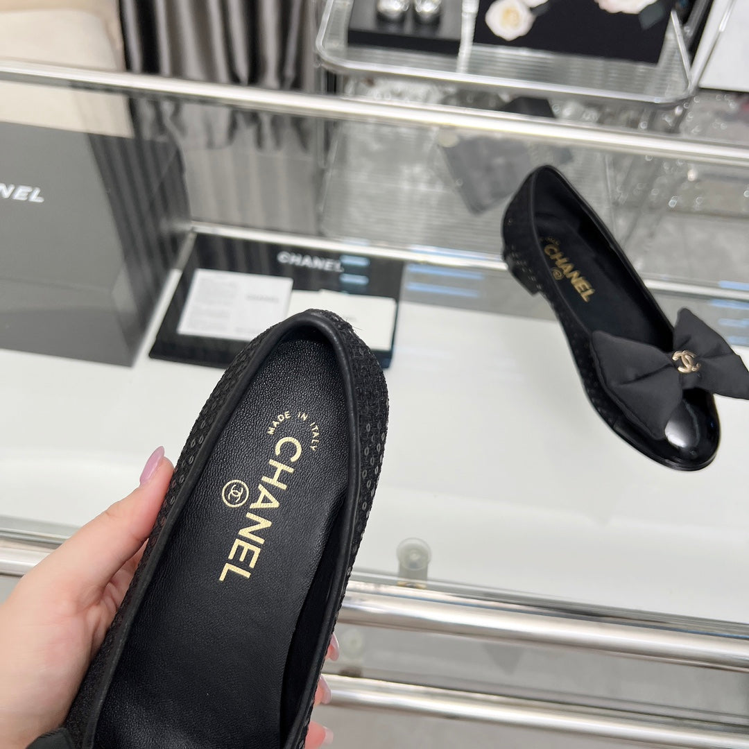 CHANEL 25S ROUND TOE BALLET FLATS WITH A BOW IN SPARKLING BLACK CANVAS
