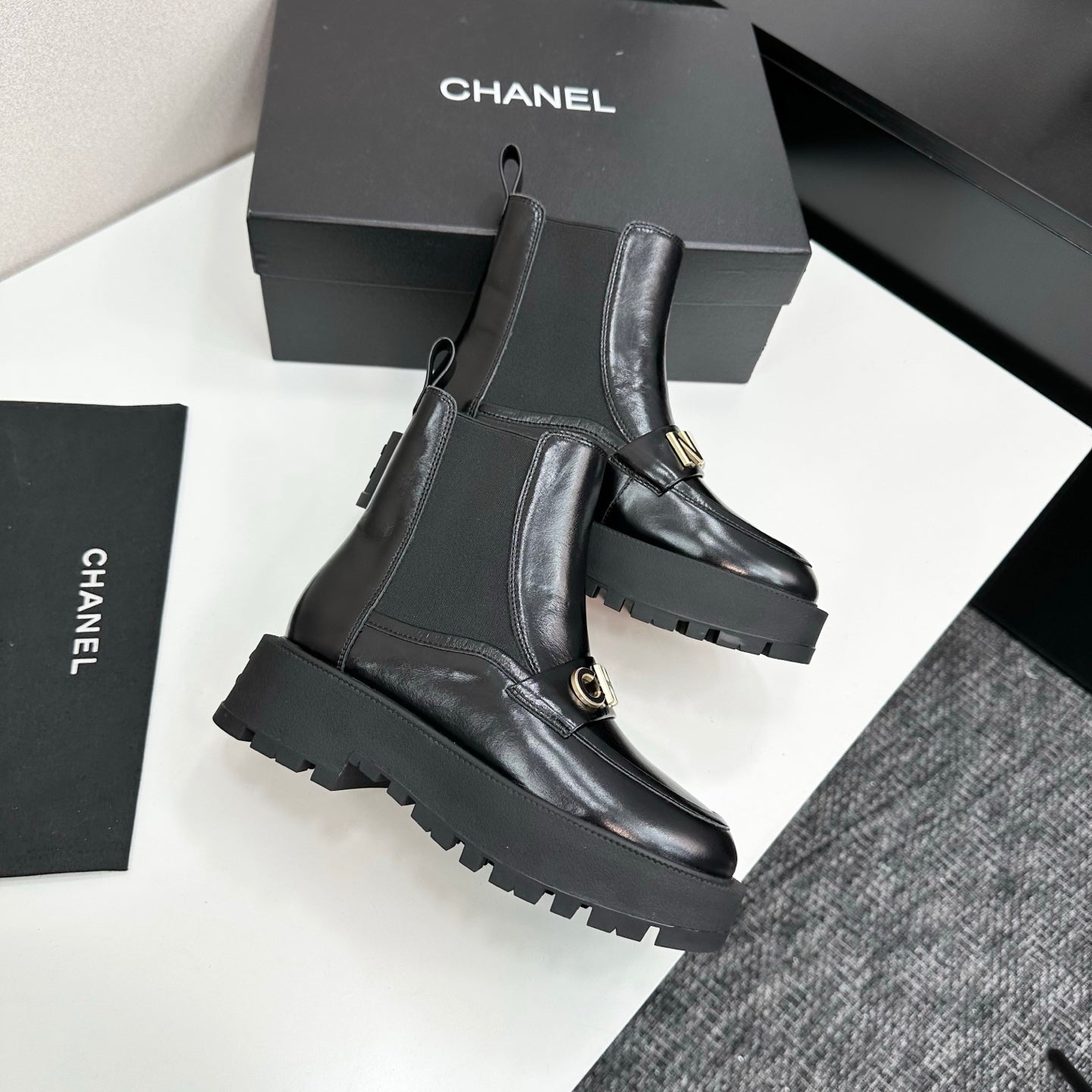 CHANEL 25S SHORT BOOTS IN BLACK CALFSKIN AND CANVAS