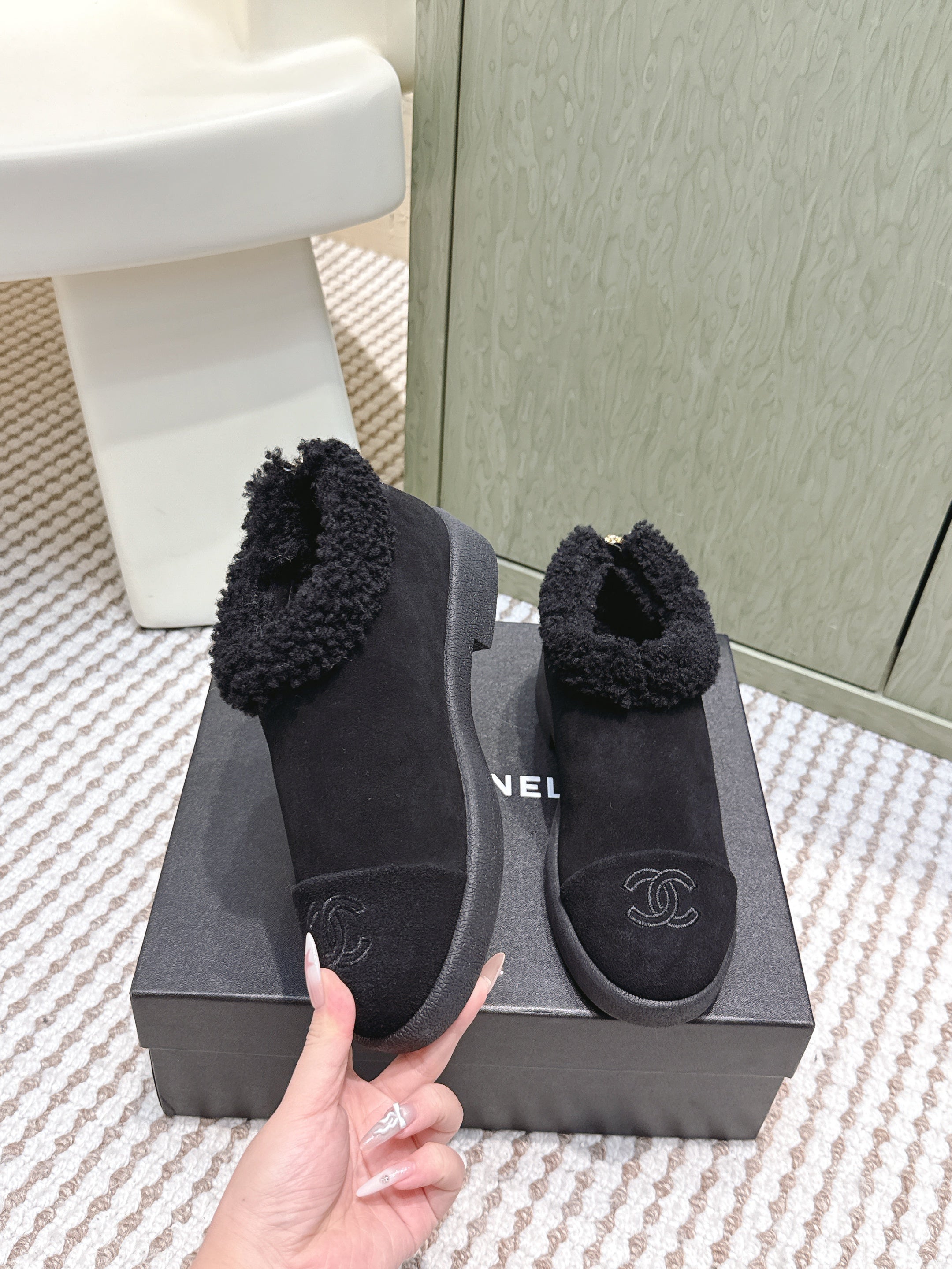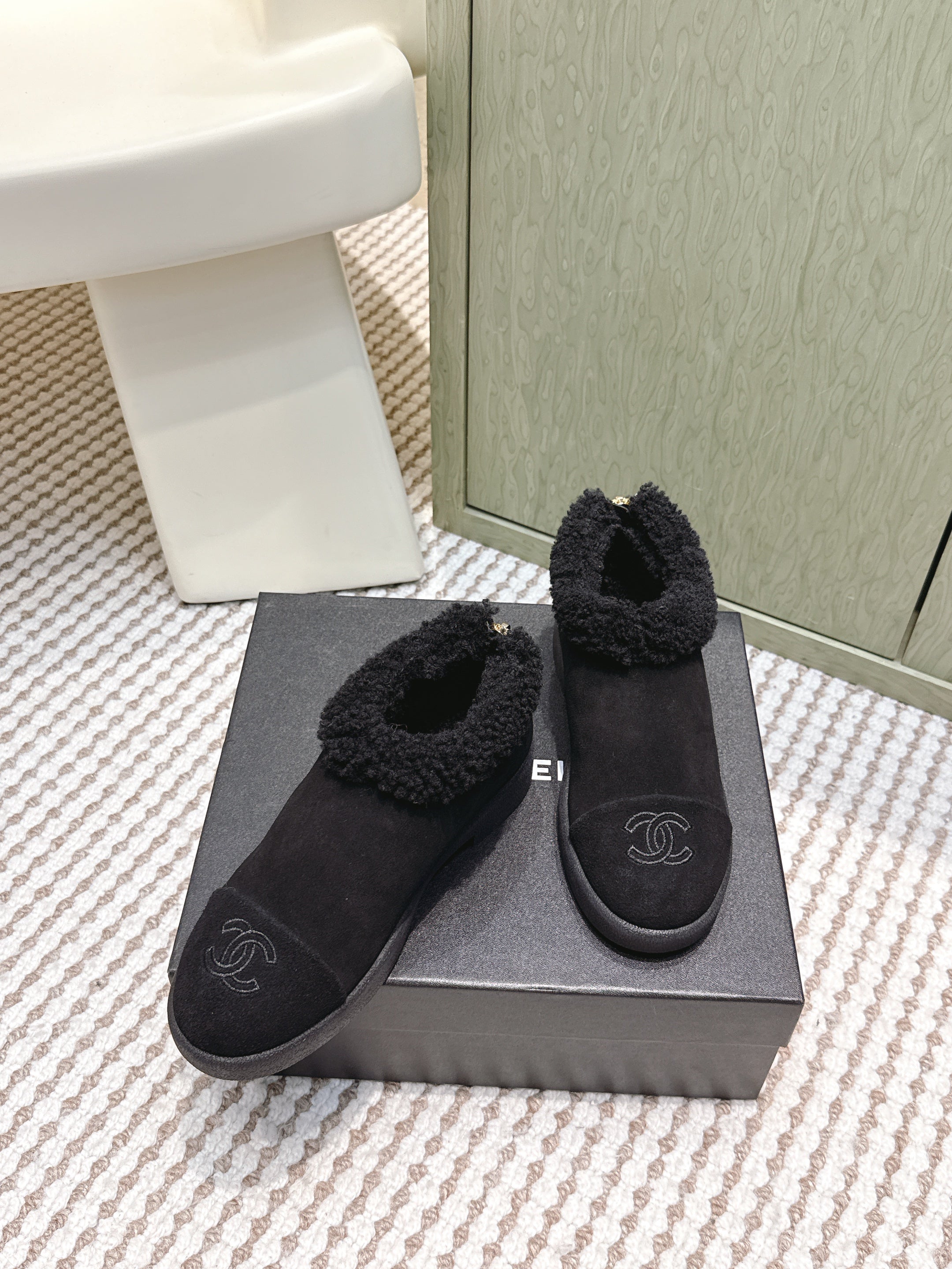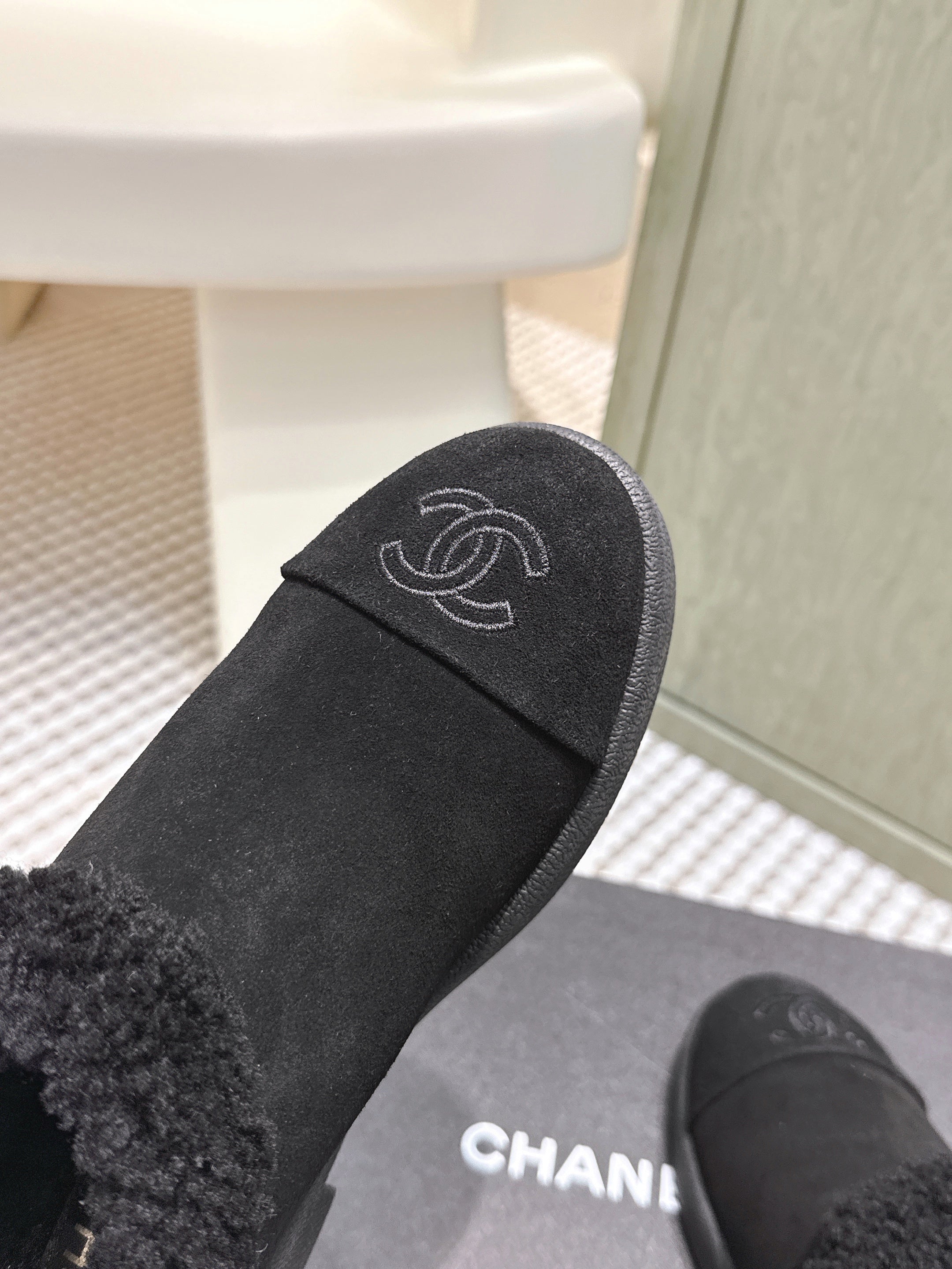 CHANEL 25S SHORT SUEDE BOOTS IN BLACK WITH SHEEPSKIN LINING