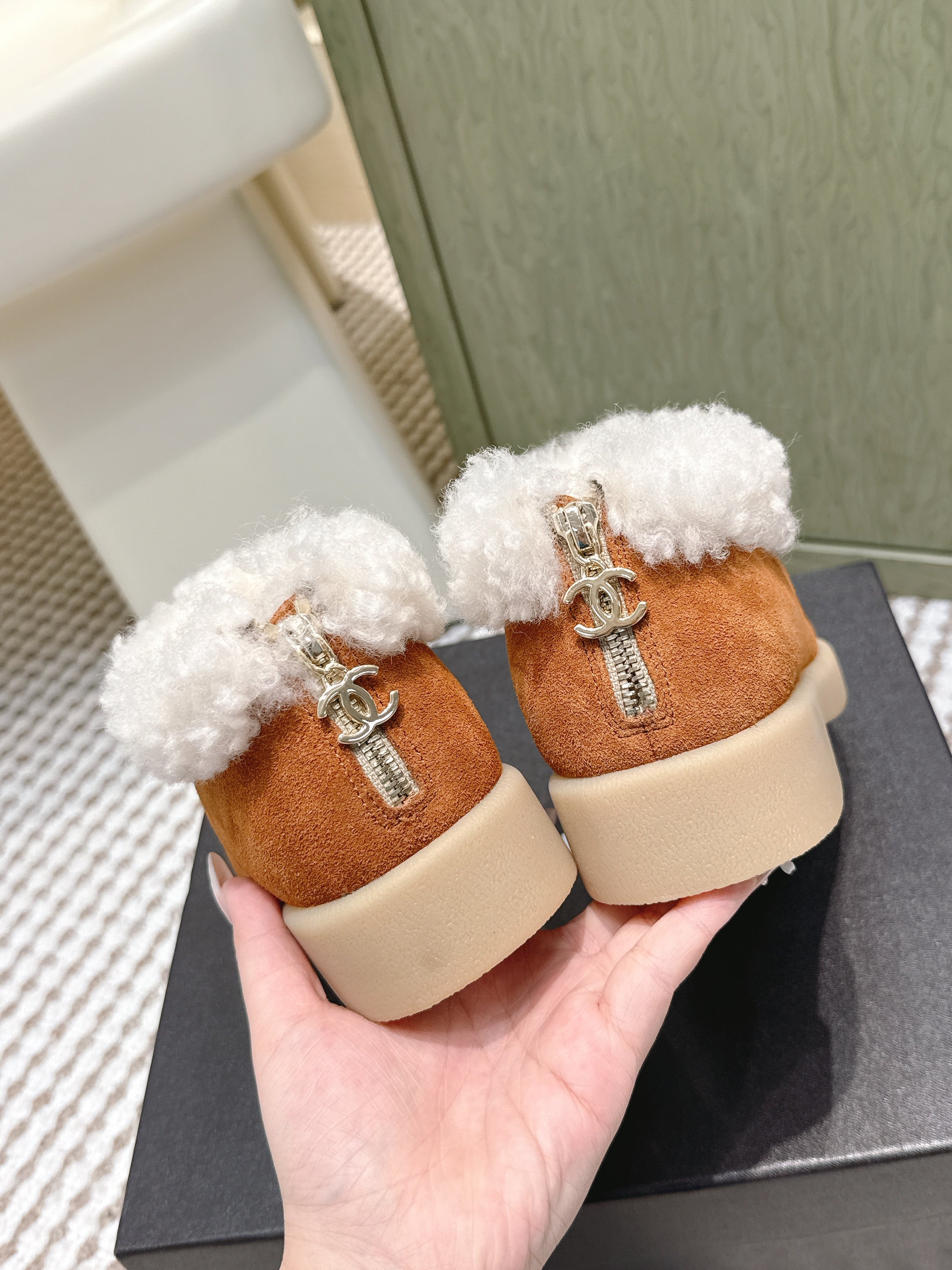 CHANEL 25S SHORT SUEDE BOOTS IN CARAMEL AND BLACK WITH SHEEPSKIN LINING