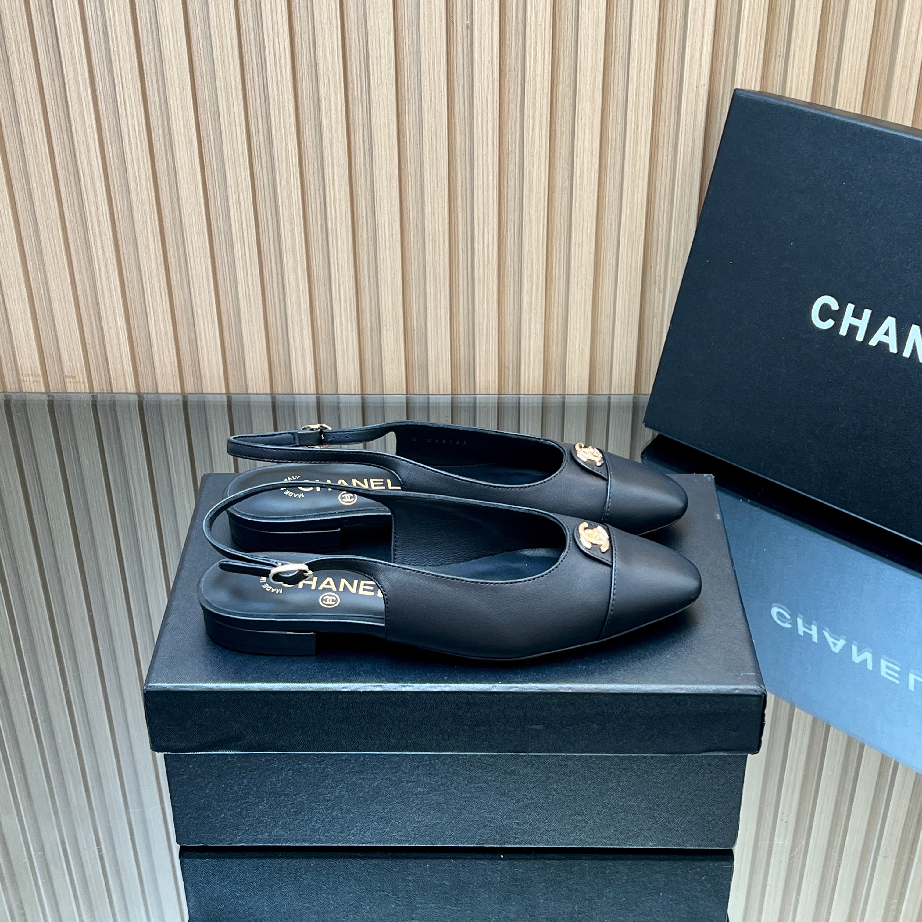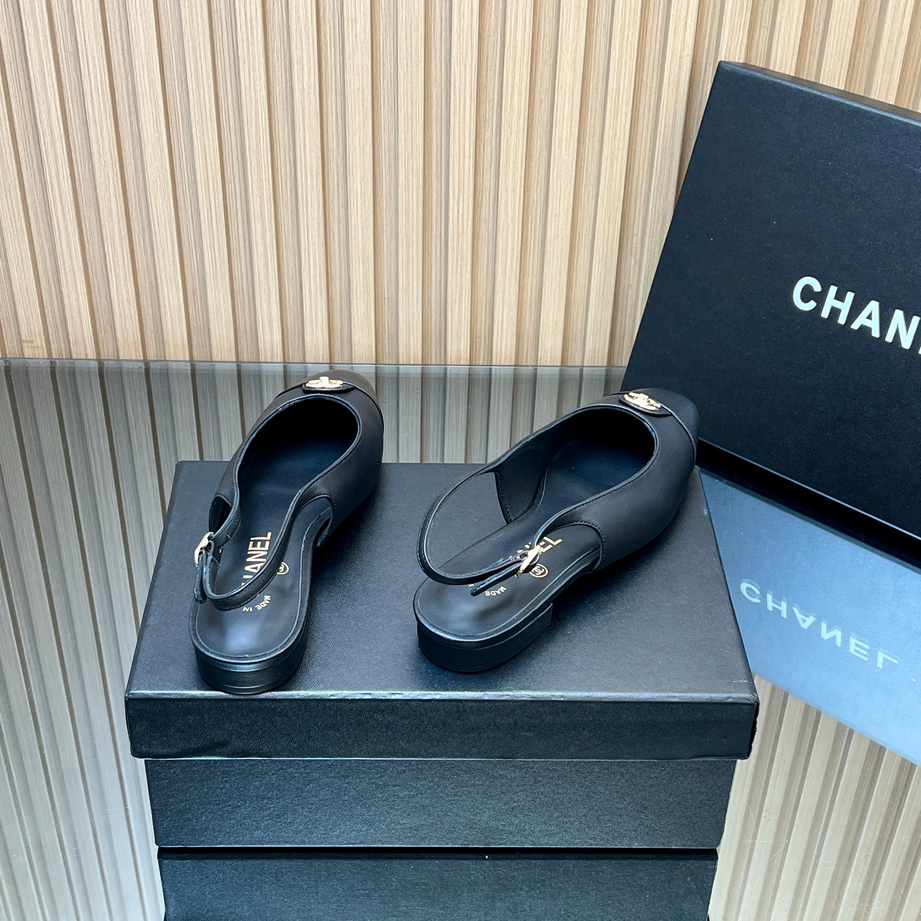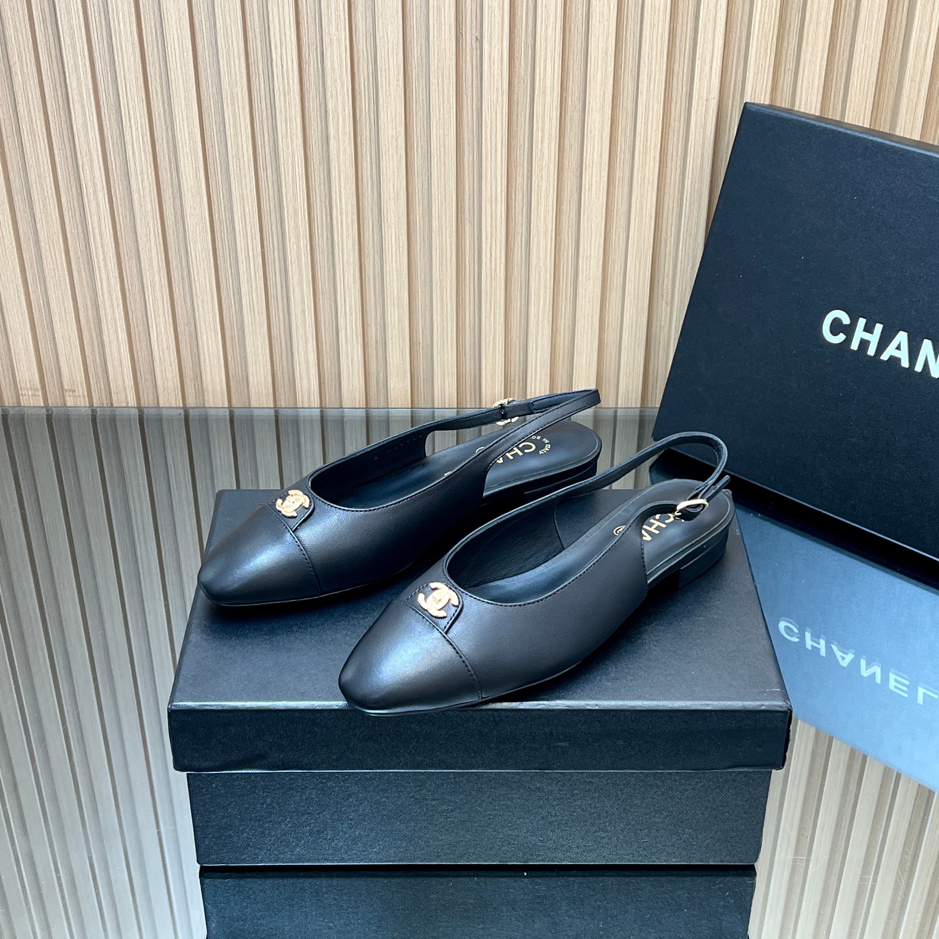 CHANEL 25S SLINGBACK FLATS IN BLACK CALFSKIN GOLD HARDWRE