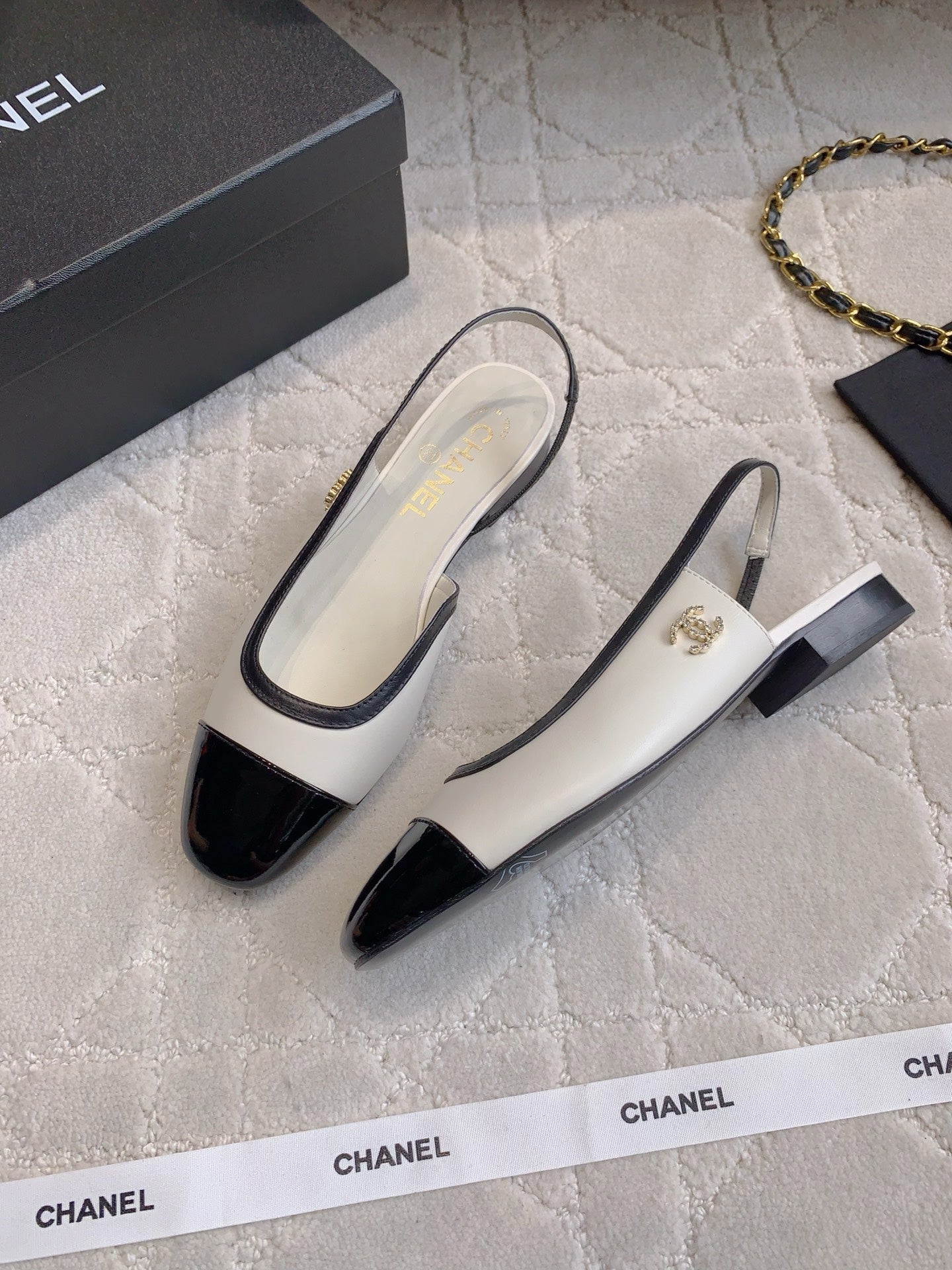 CHANEL 25S SLINGBACK IN BLACK AND WHITE CALFSKIN GOLD HARDWARE