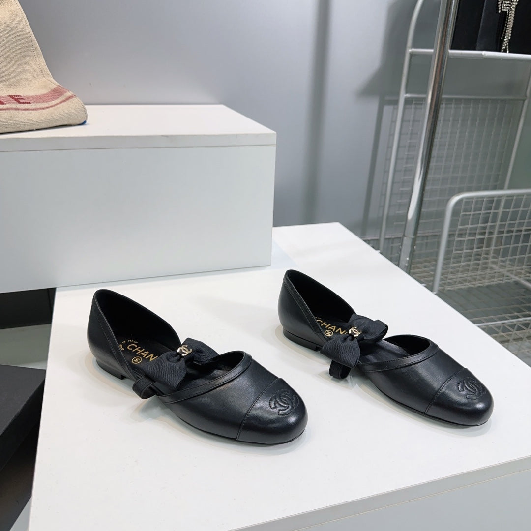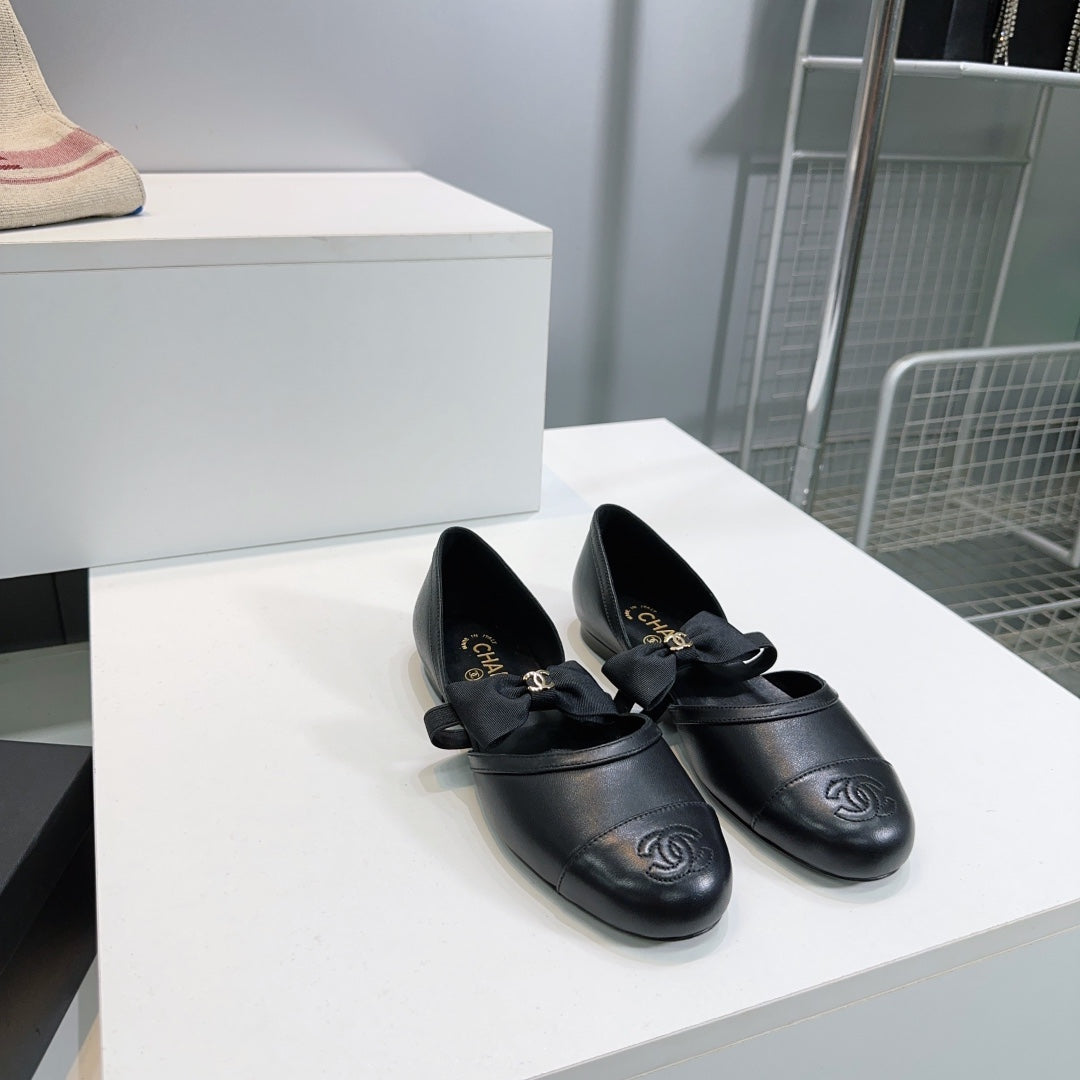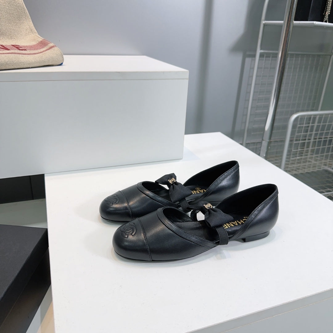 CHANEL FLAT MARY JANE SHOES 25S IN BLACK LAMBSKIN EMBOSSED LOGO WITH BOW