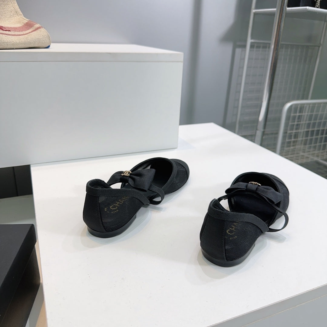 CHANEL FLAT MARY JANE SHOES 25S IN BLACK MESH FABRIC EMBOSSED LOGO WITH BOW