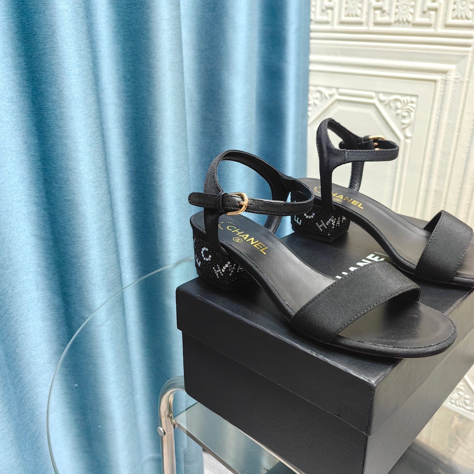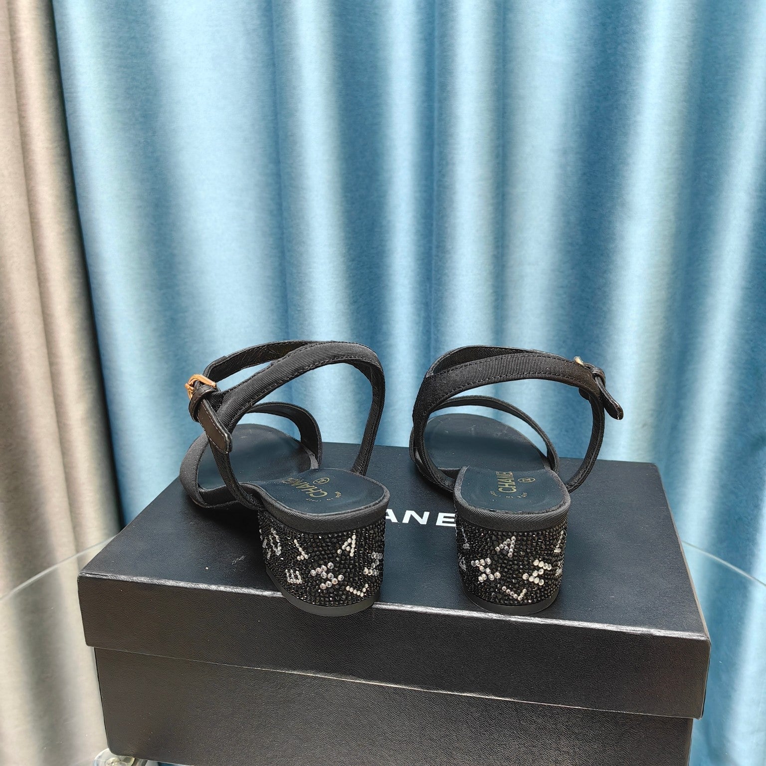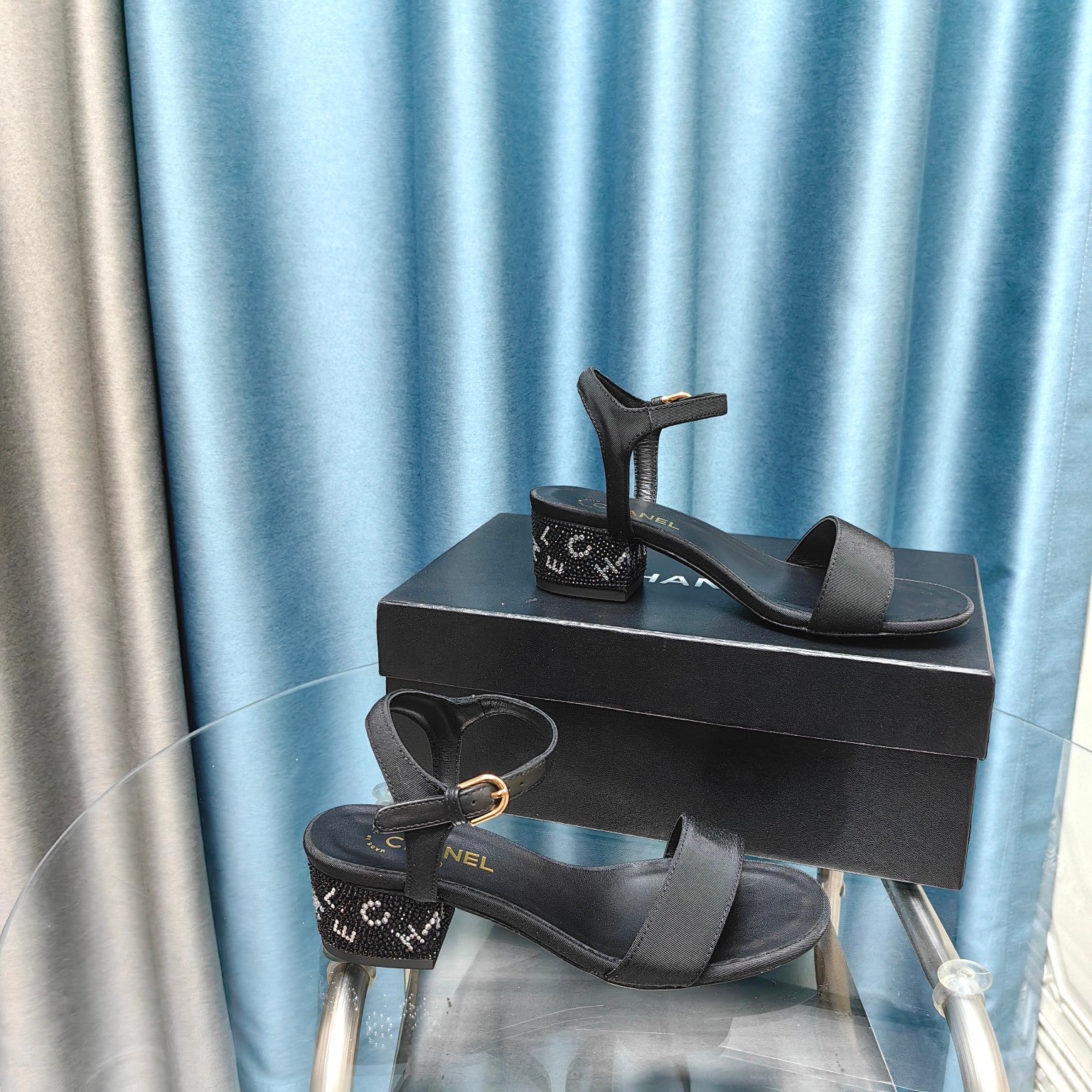 Chunky Heel Rhinestone Sandals Black Lambskin