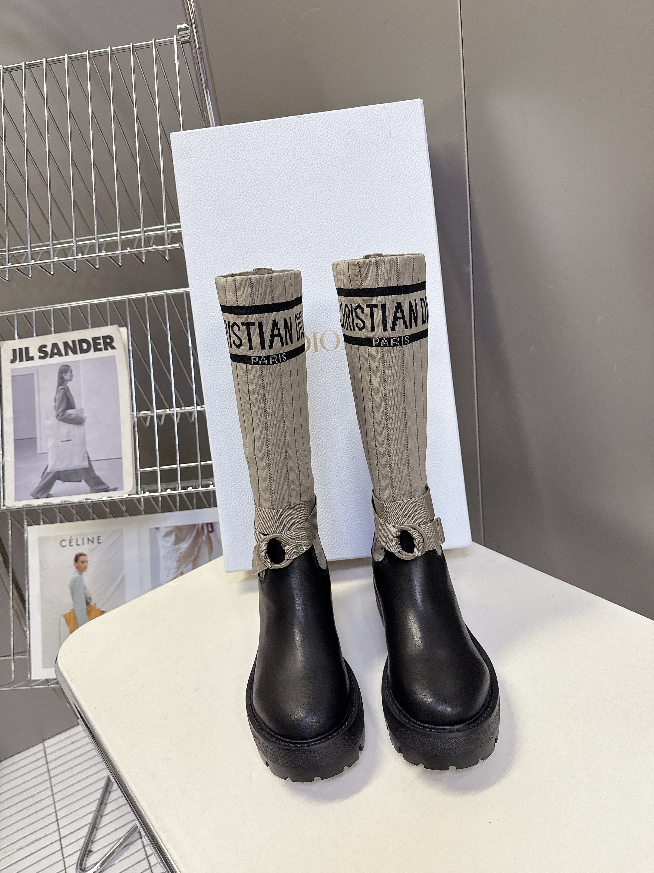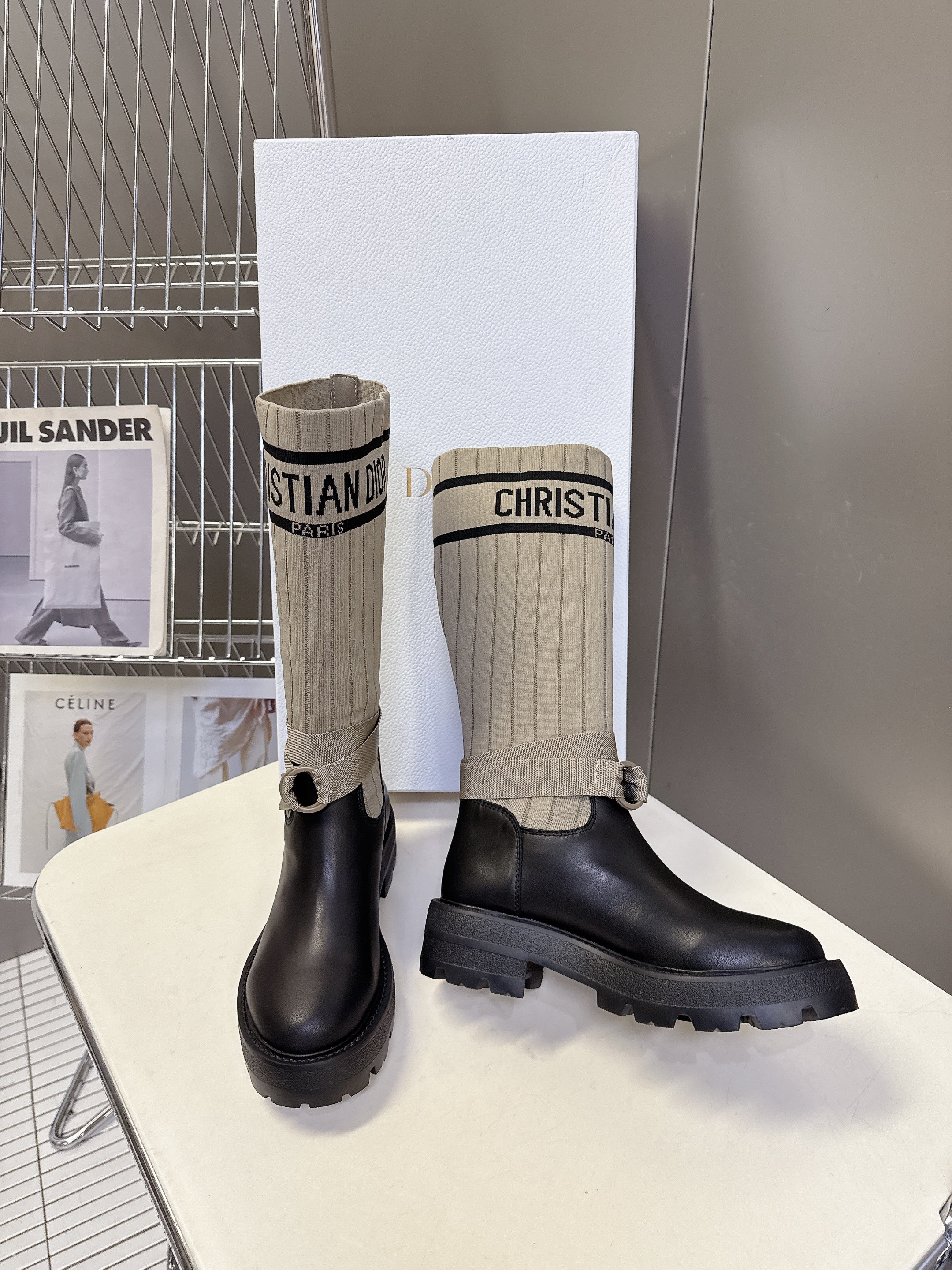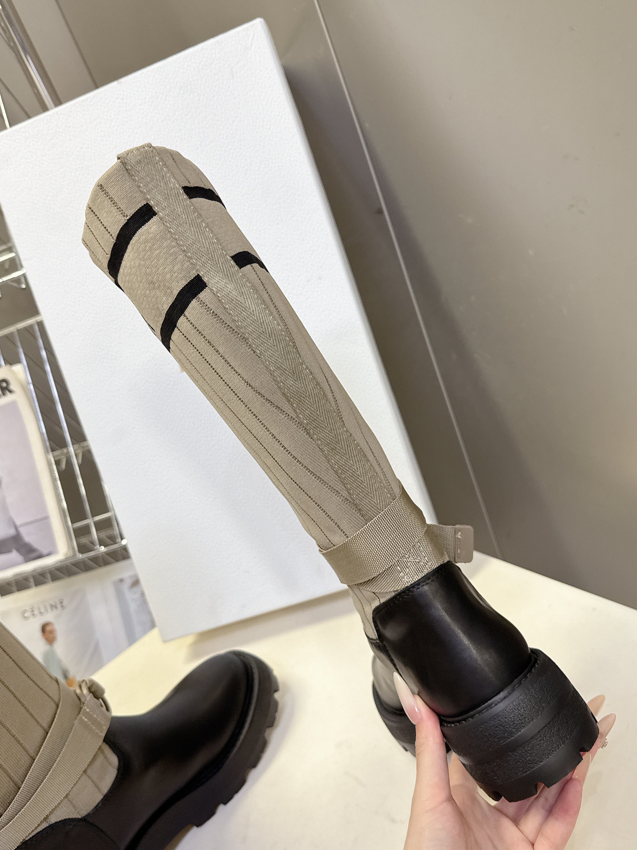 DIOR 25S D-MAJOR ANKLE BOOTS IN BLACK CALFSKIN AND BEIGE FABRIC