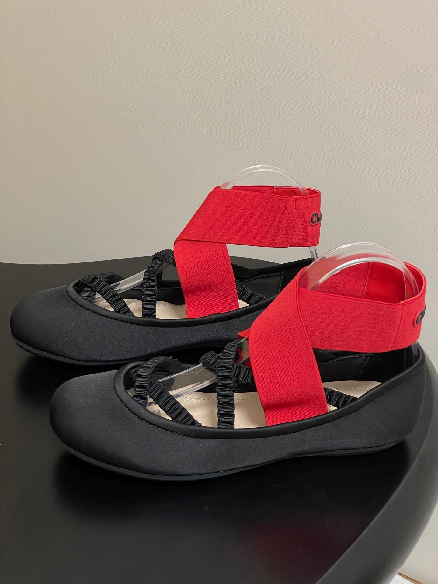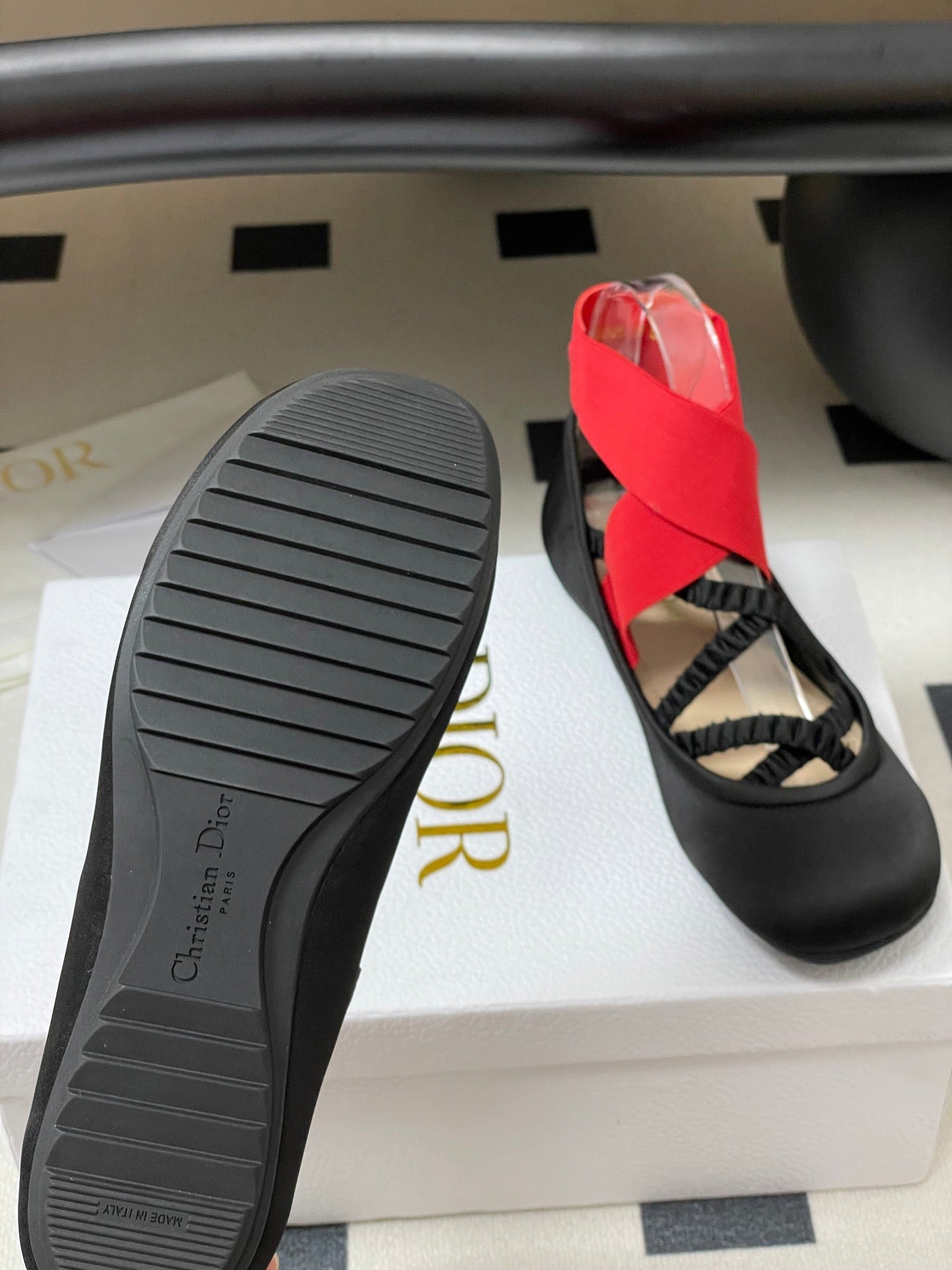 DIOR STRETCH BALLET FLATS 25S IN BLACK MIX RED FABRIC WITH CROSSED STRAPS