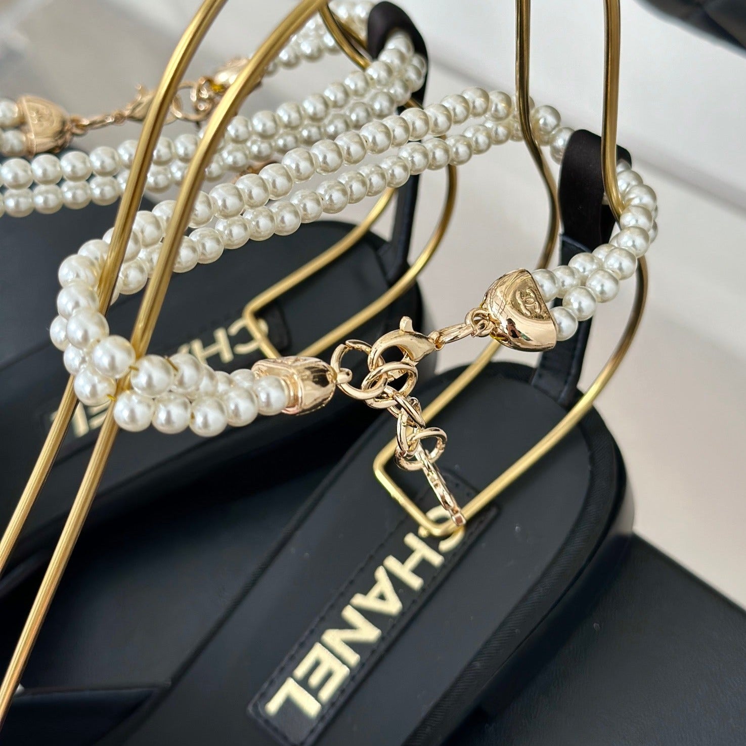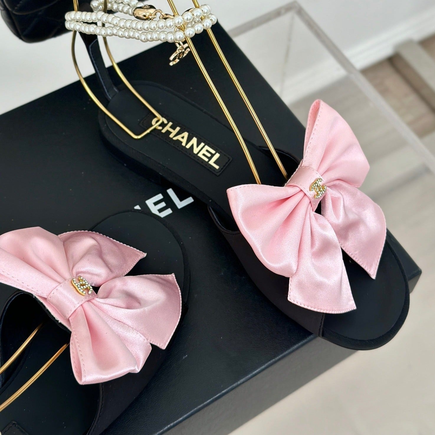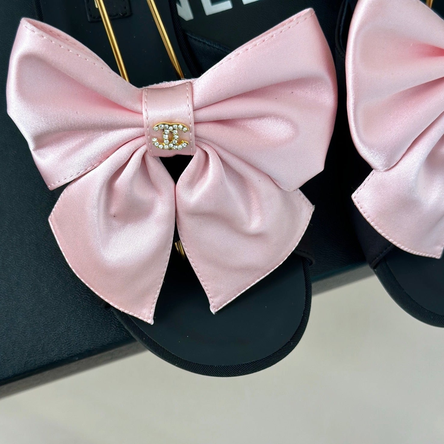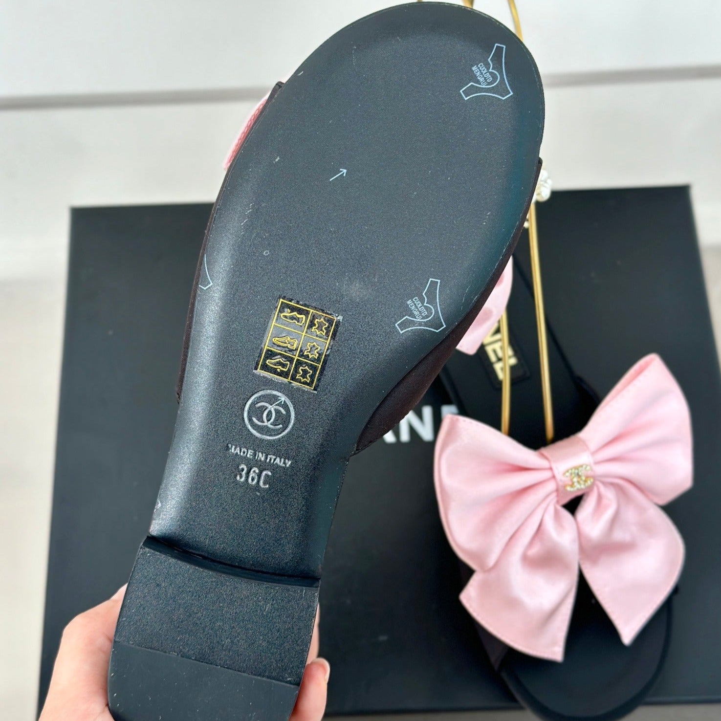 Double C Big Bow Pearl Chain Sandals Light Pink Black Lambskin