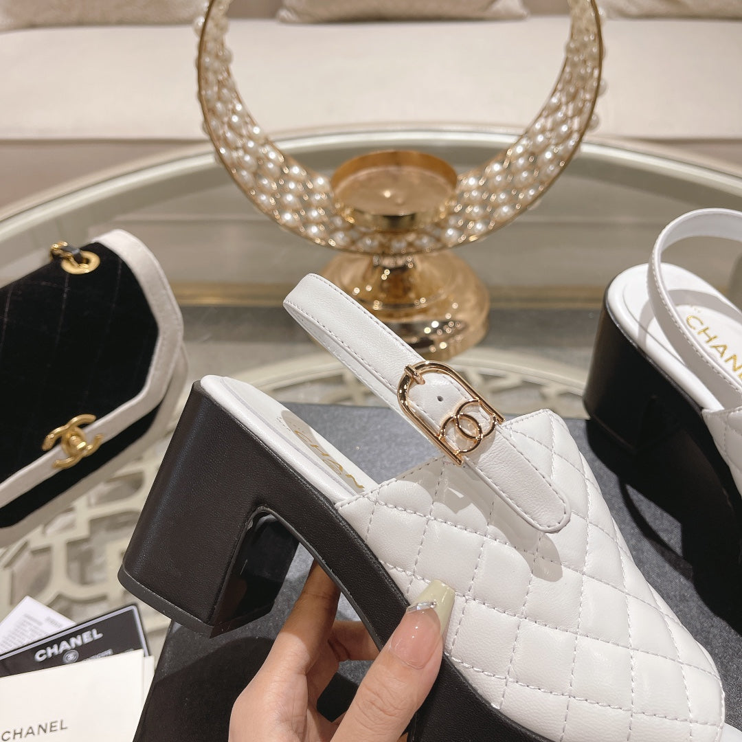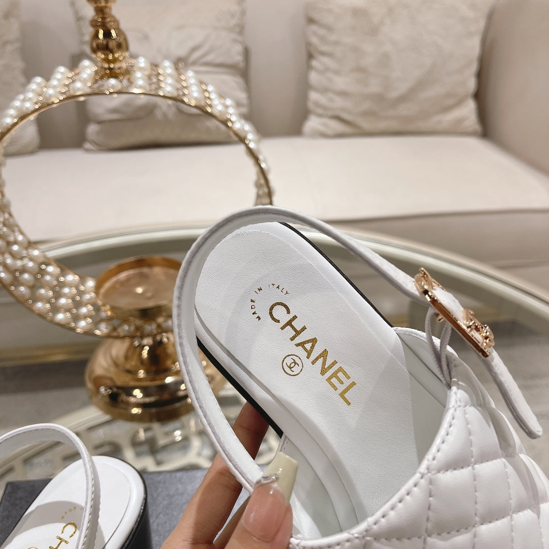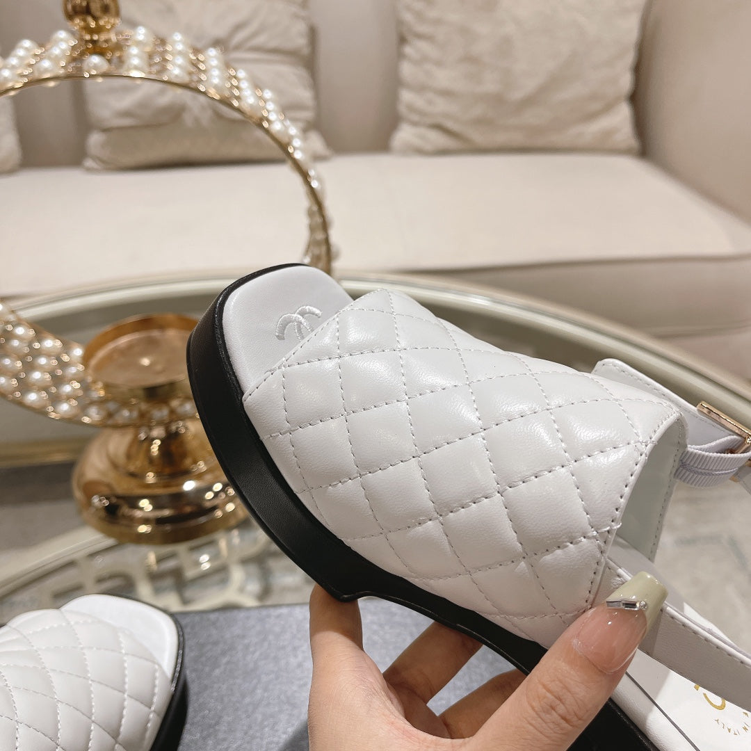 Double C  Chunky Heel Peep-Toe Open Sandals White Lambskin