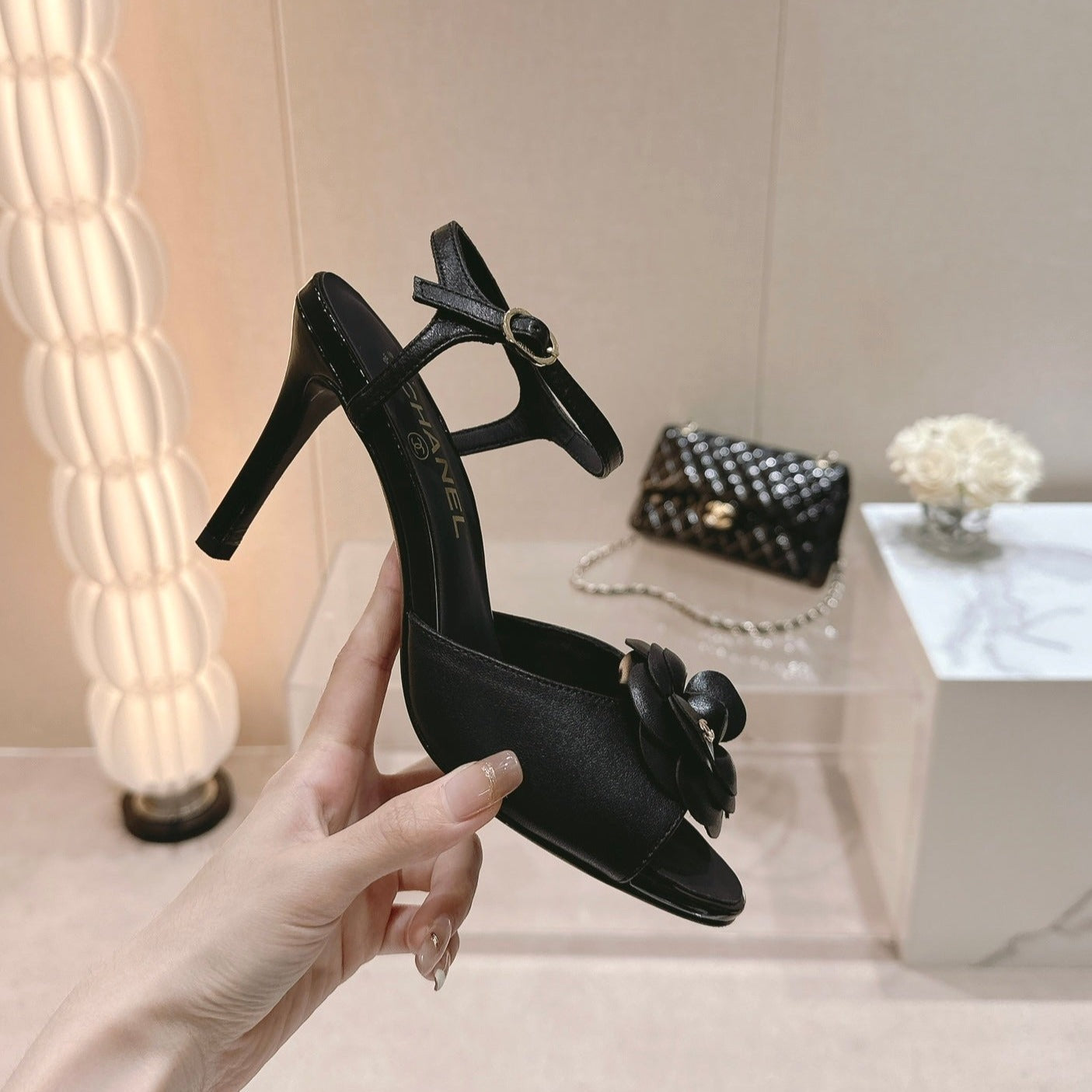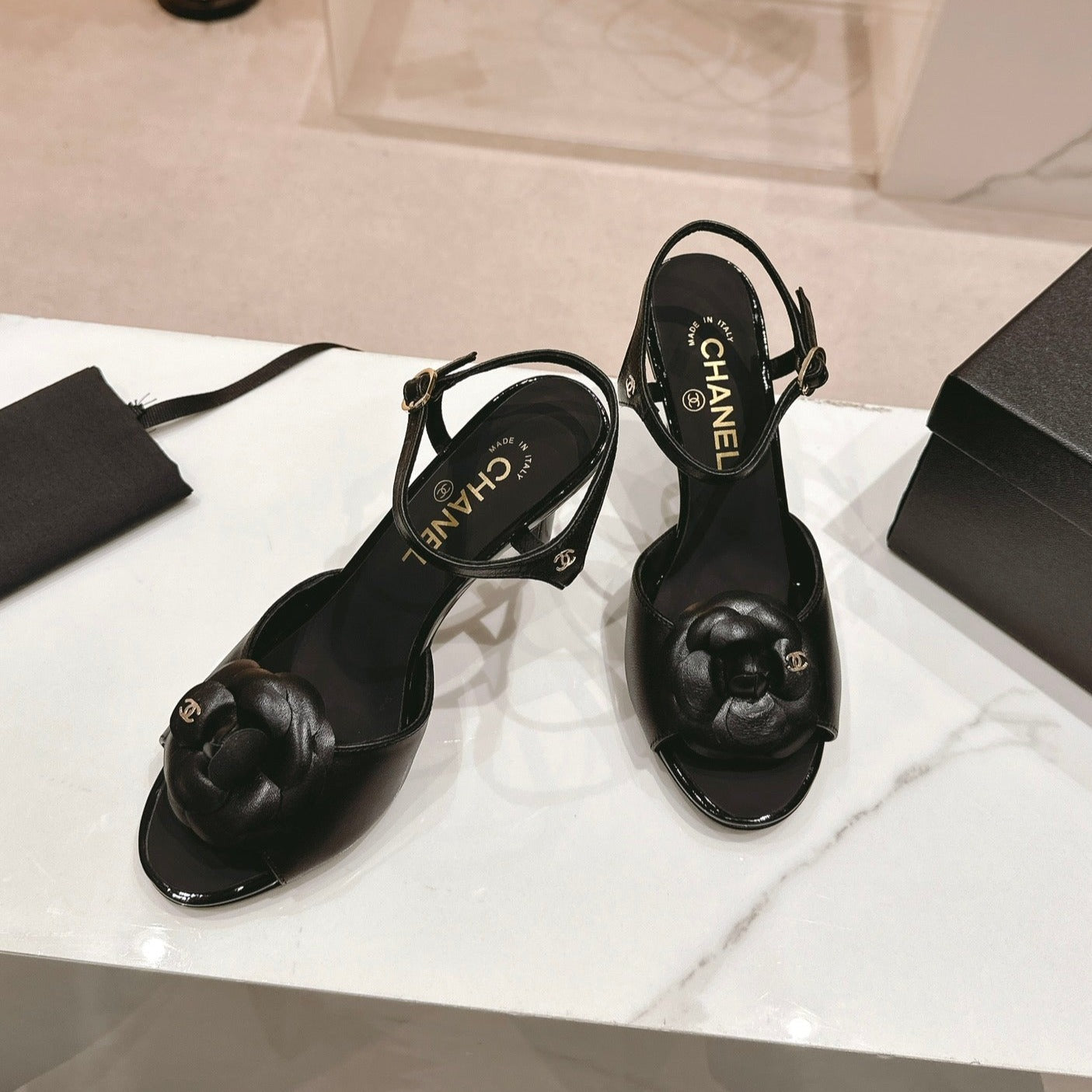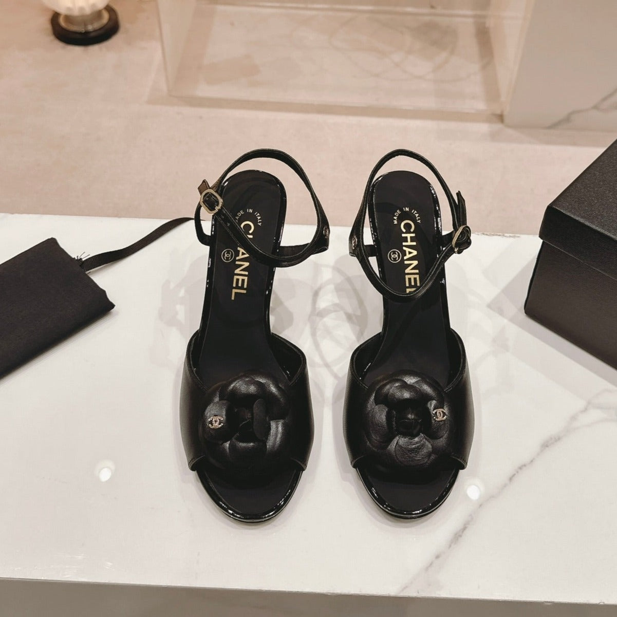 Double C New Camellia High Heel Sandals Black