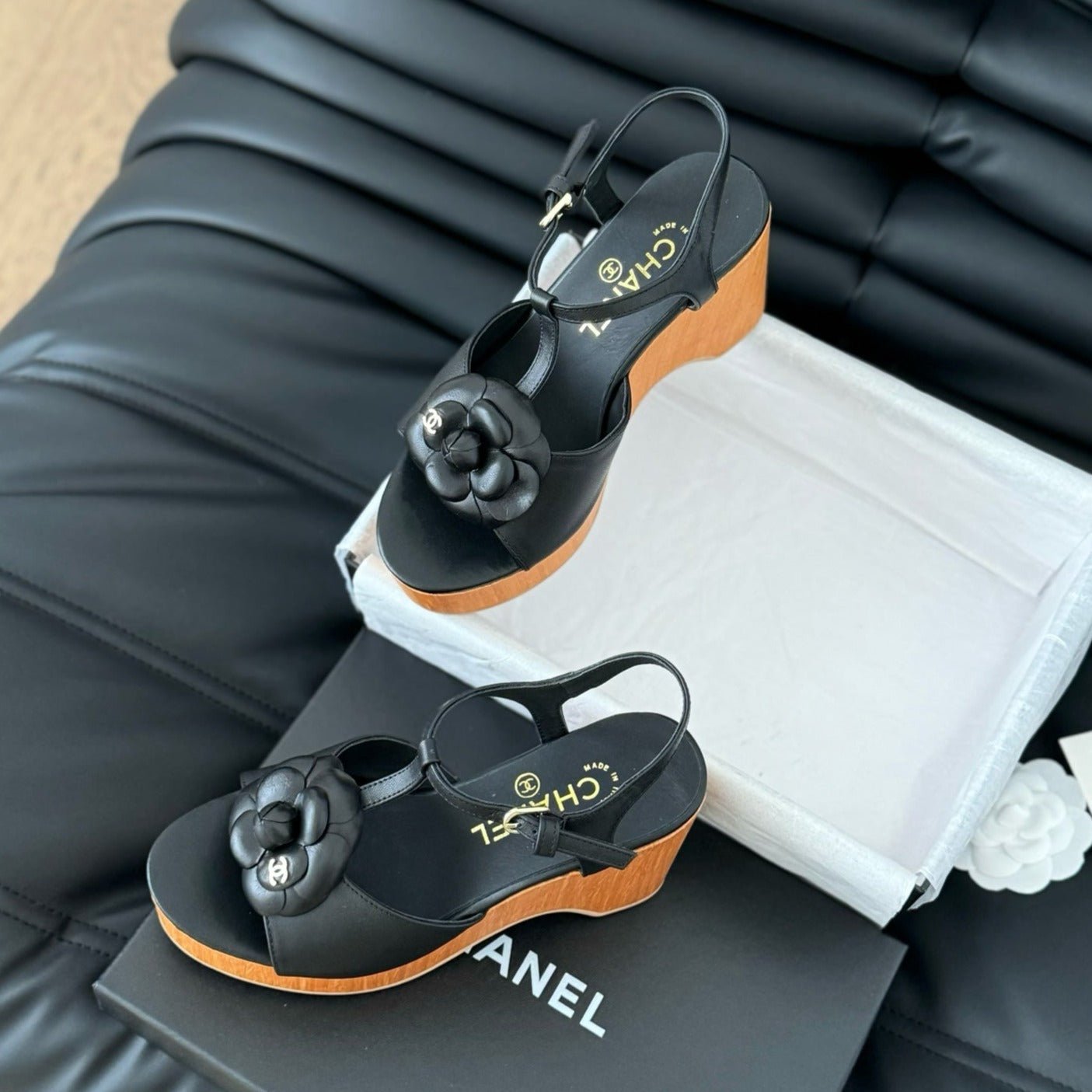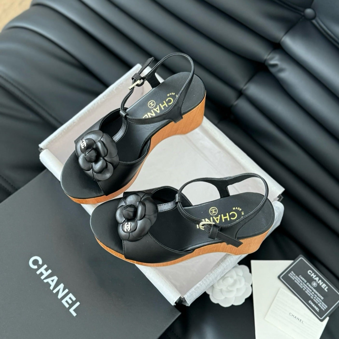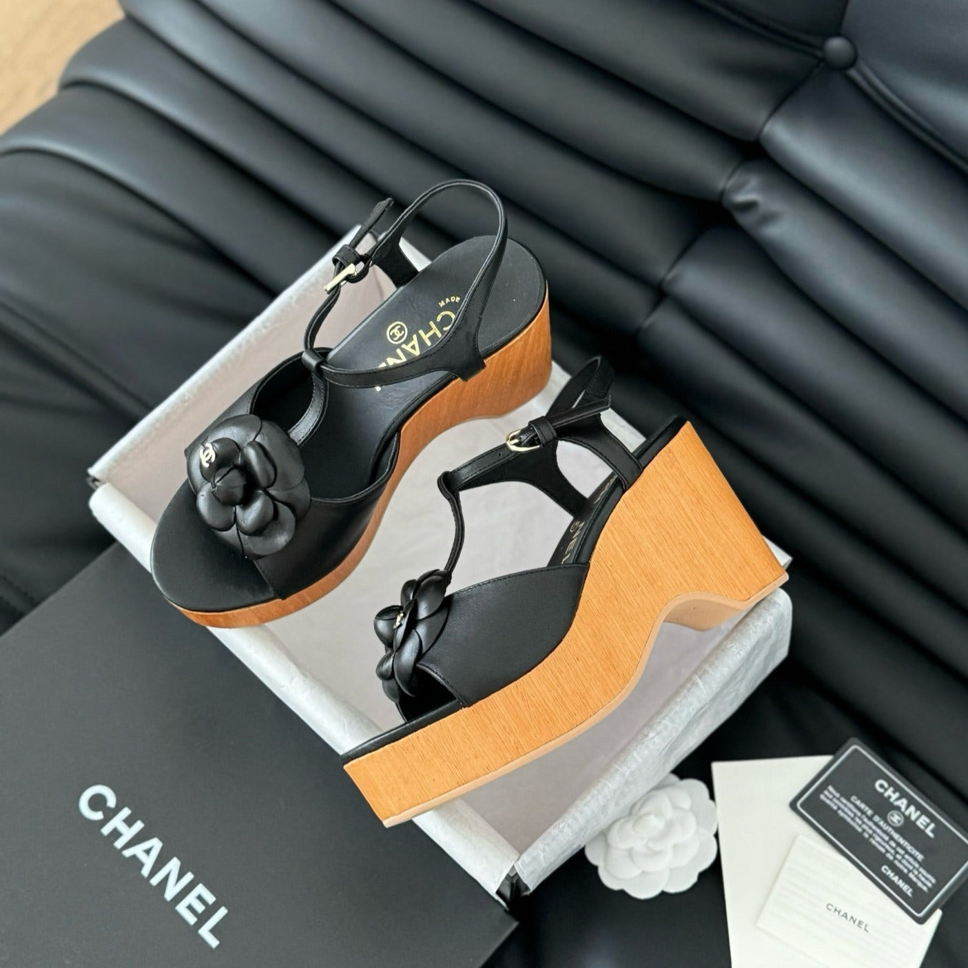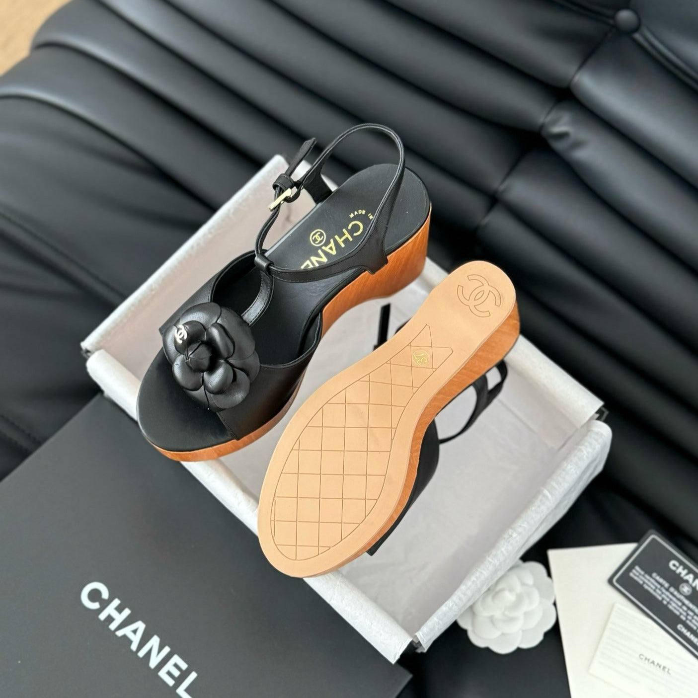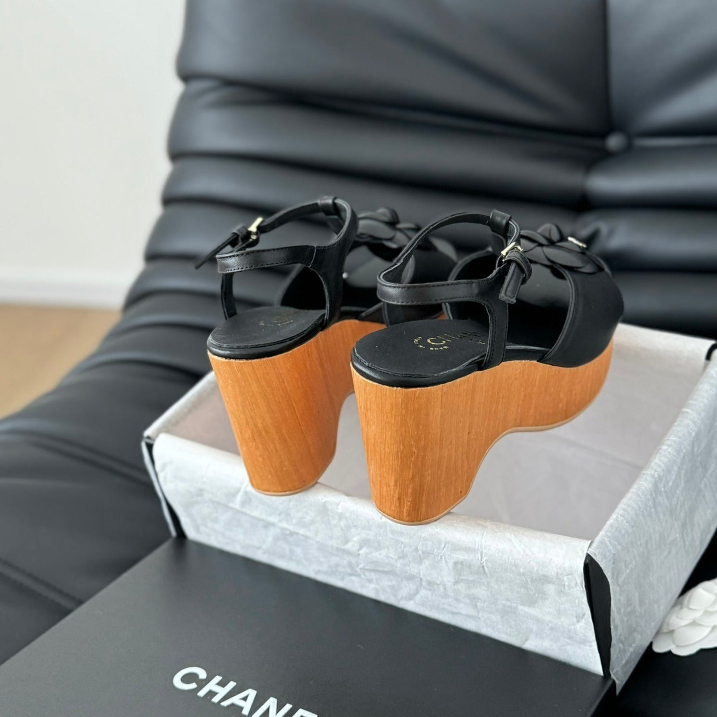 Double C New Wood Grain Platform Sandal  Black Lambskin