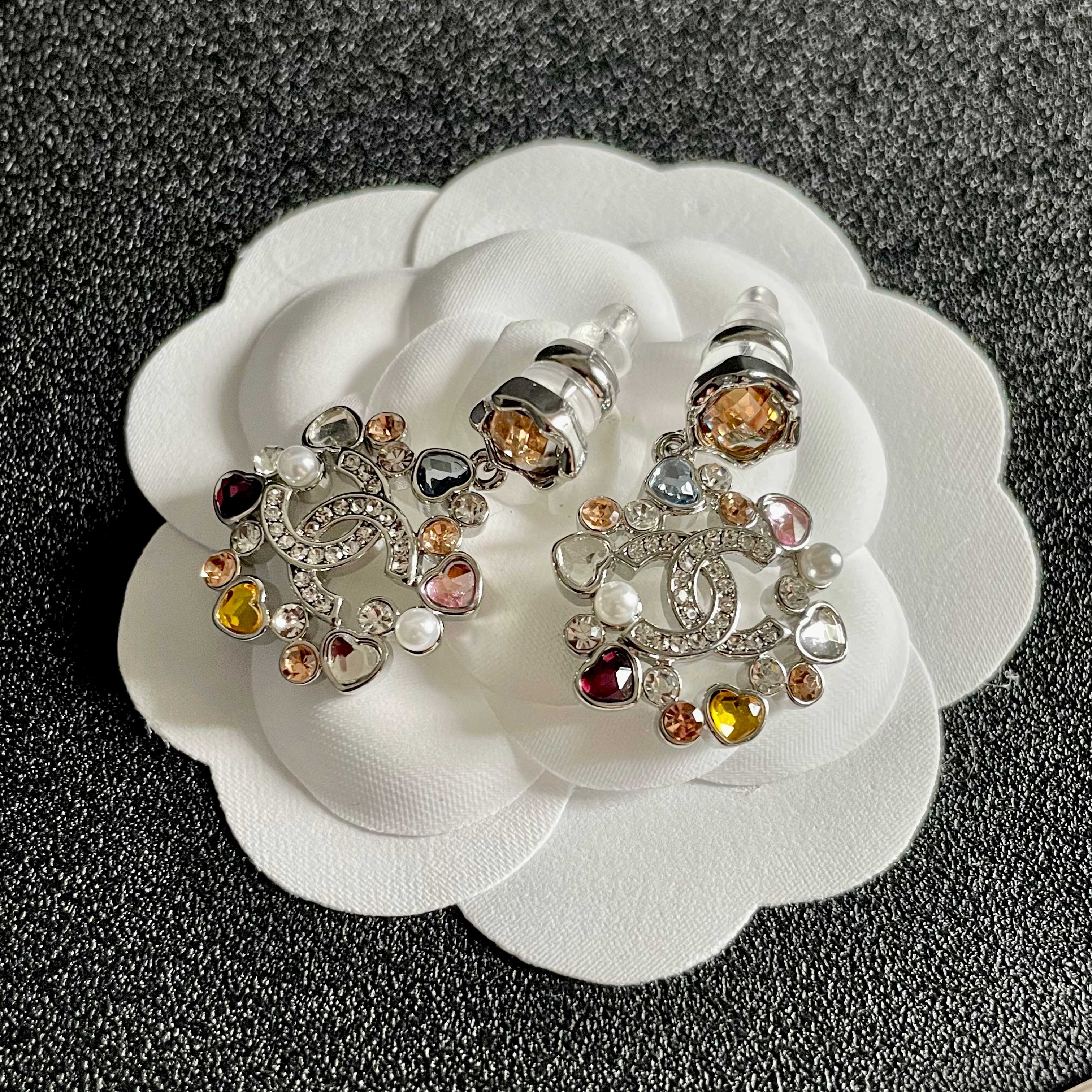 DOUBLE C STUD EARRINGS IN SILVER METAL WHITE PEARL MULTICOLOR STONES